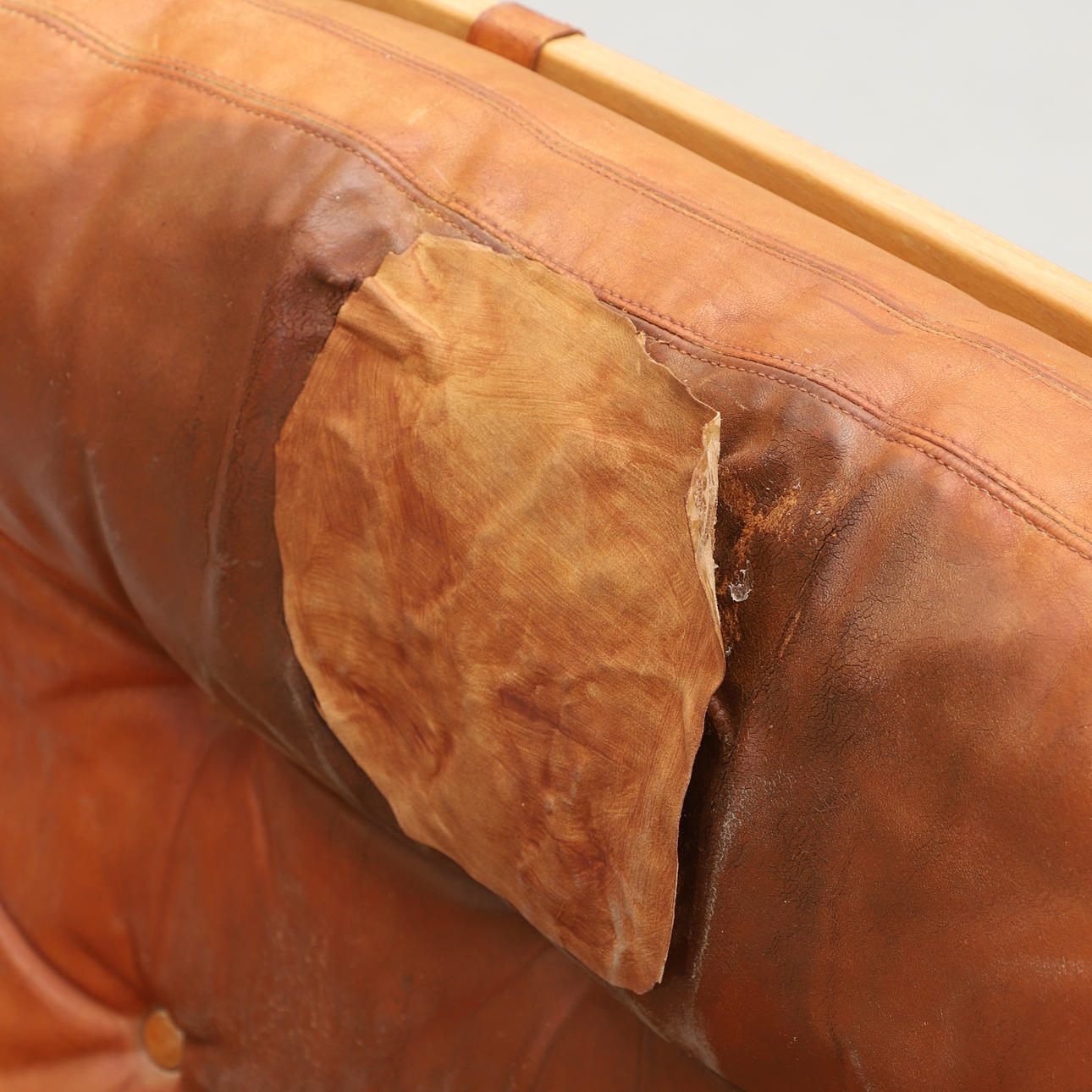 Wear from use, the leather with stains, holes, drying cracks and scuff marks, the neck cushion with holes/glued-on patch.