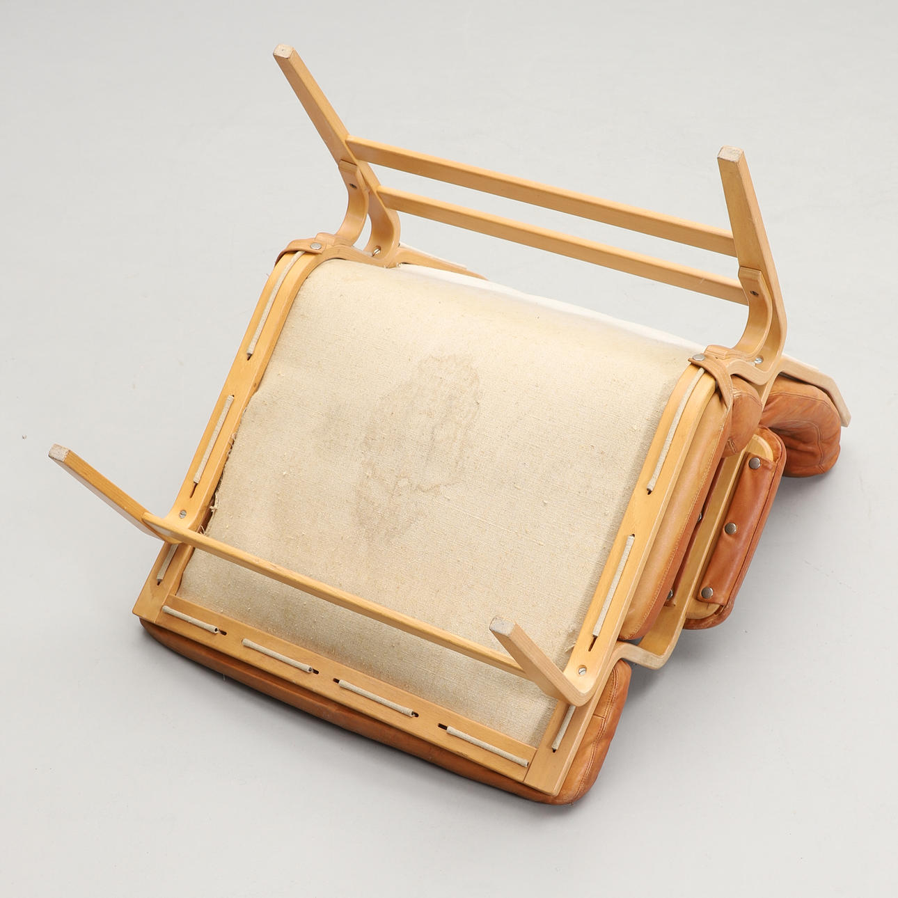 Frame in beech, canvas support, upholstered cushion covered in leather. Width 74, depth 85, height 88 cm.