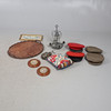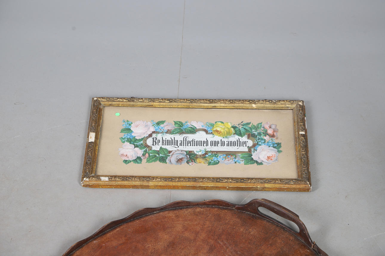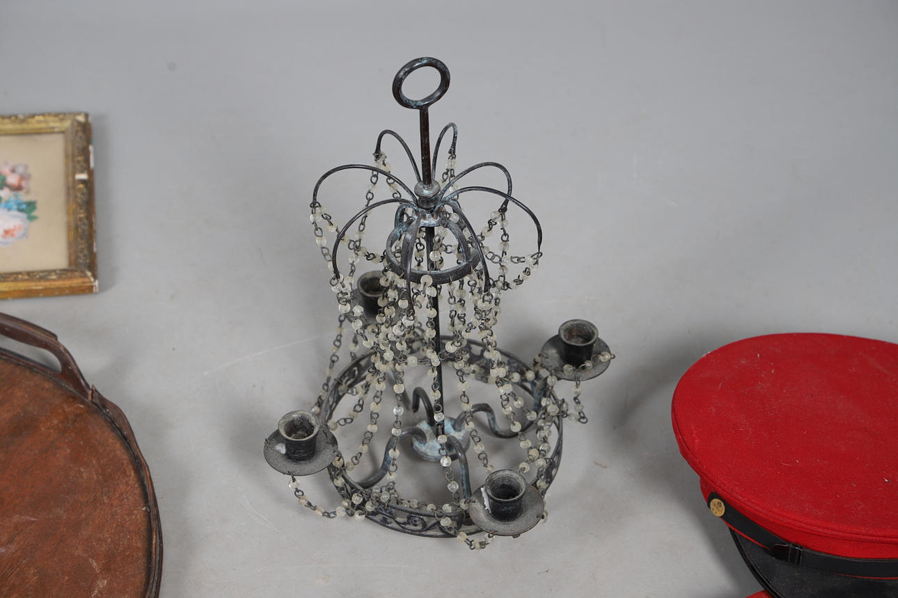 to include four British Army caps by Rogers & Co, a small Indian embroidered cushion, a mahogany oval tray, 60cm x 48cm, a pair of 19th century oval walnut framed needleworks, illustrating St George & the Dragon, and an eagle with Latin banner, 20cm x 17cm, a GWR brass carriage lamp, a wrought metal ceiling light, 38cm high, and a framed Victorian decoupage motto - 'Be kindly affectioned one to another'.