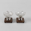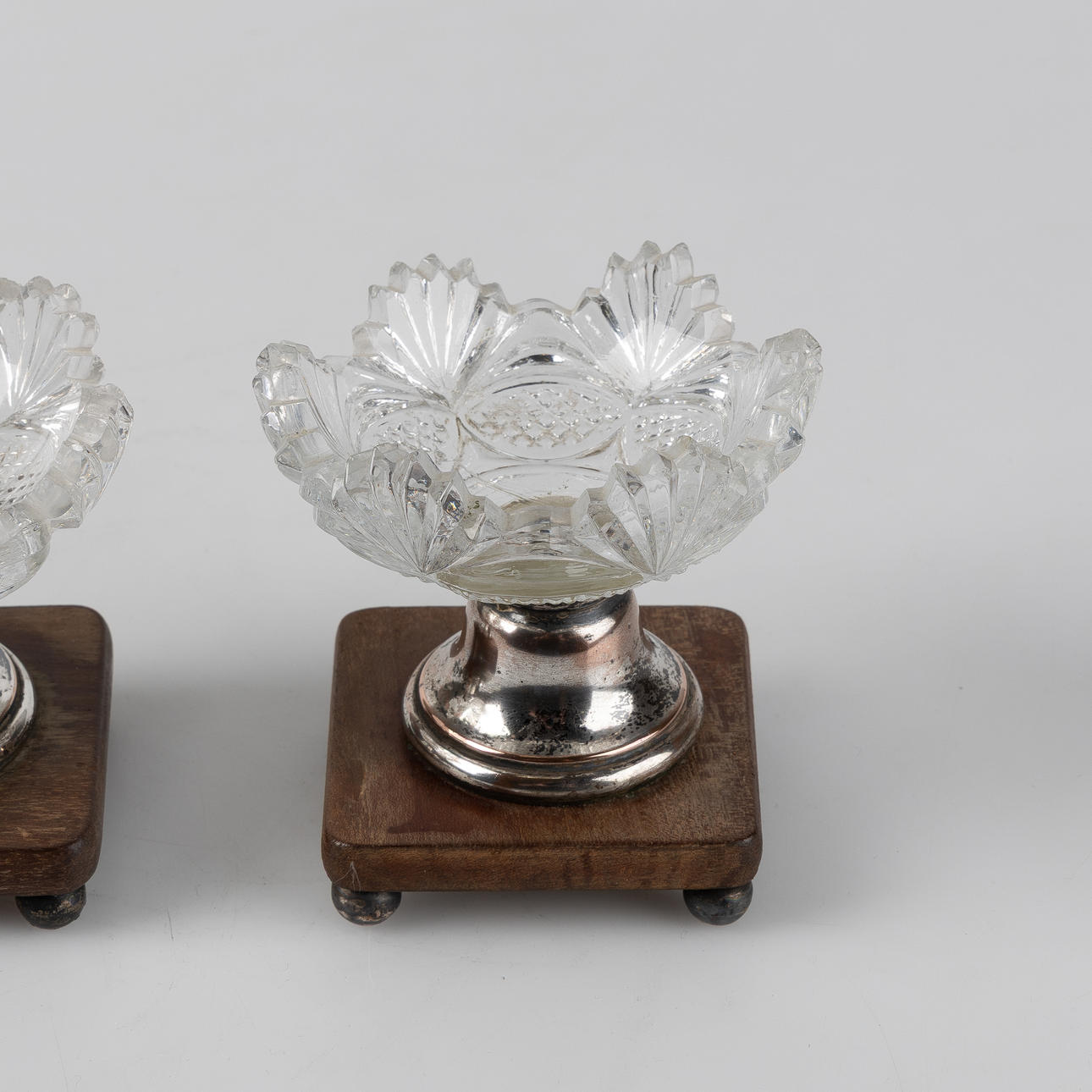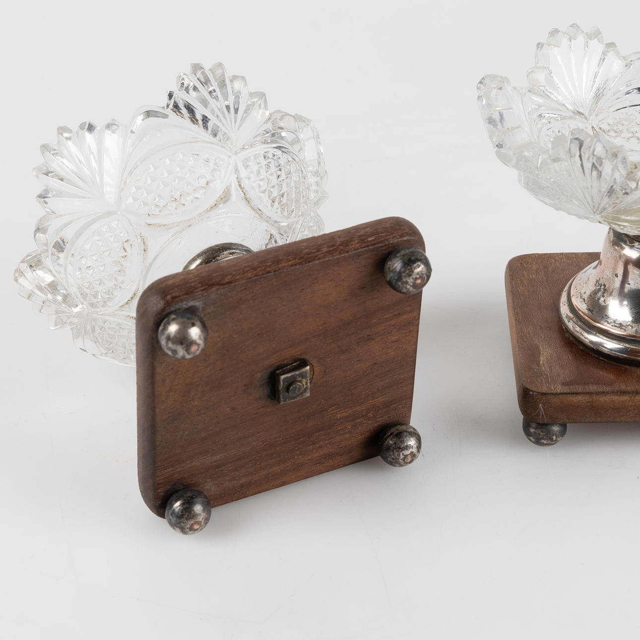 Pressed glass, silver plate and teak. H approx. 8 cm.