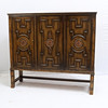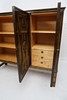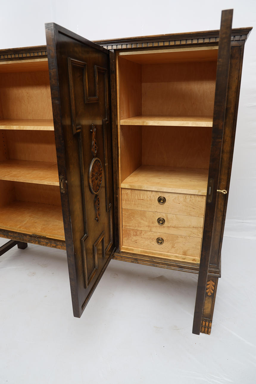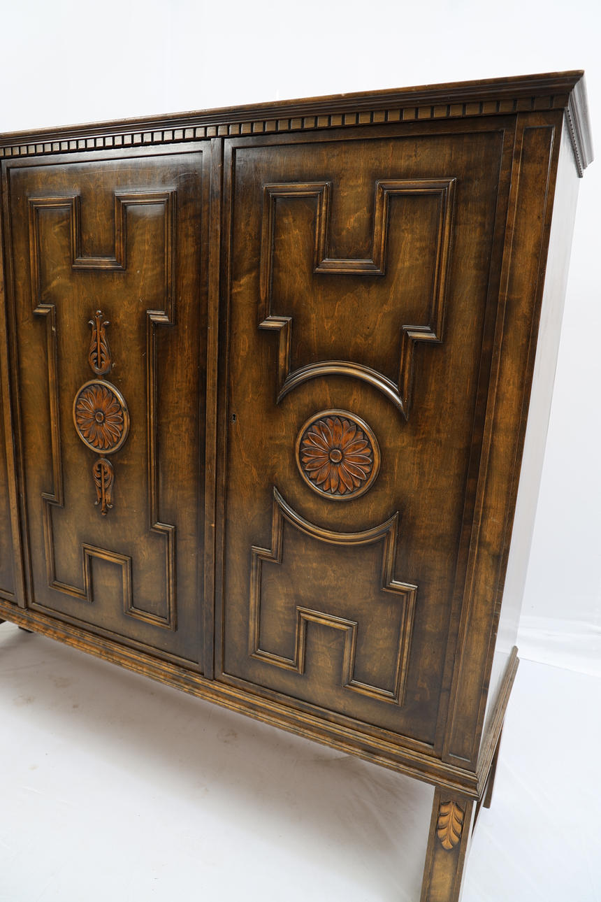 Painted and stained birch. Three doors with shelves and 3 drawers inside. Plaque marked.