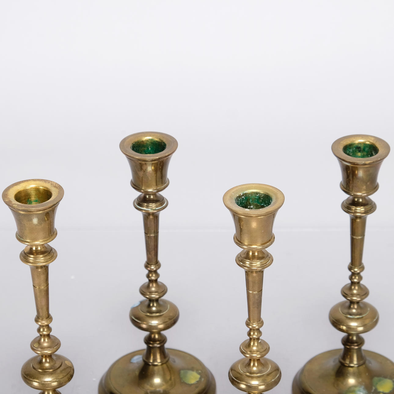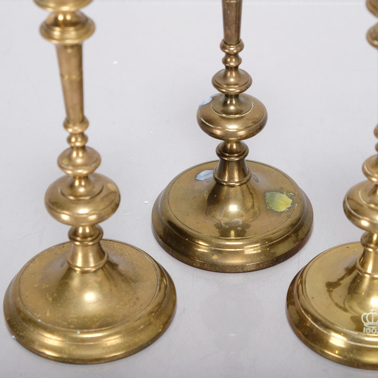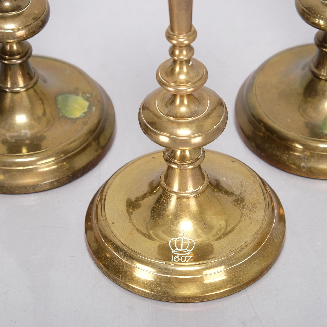 Minor wear from use in the form of scratches and wax residue, engraving on one candlestick.