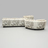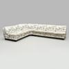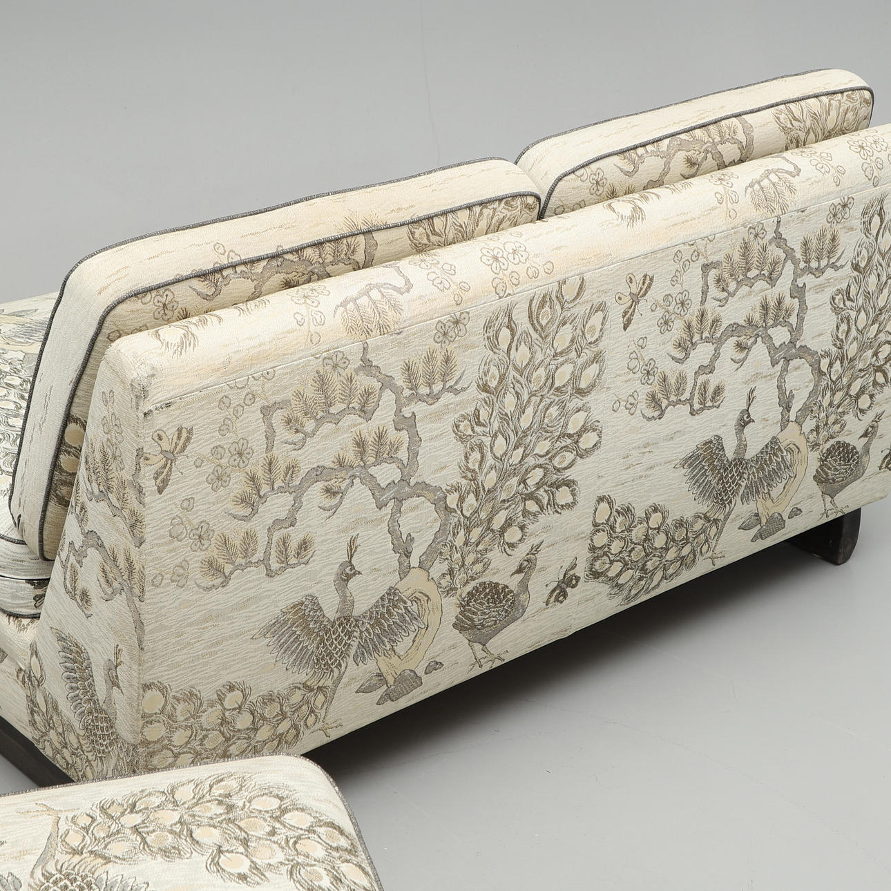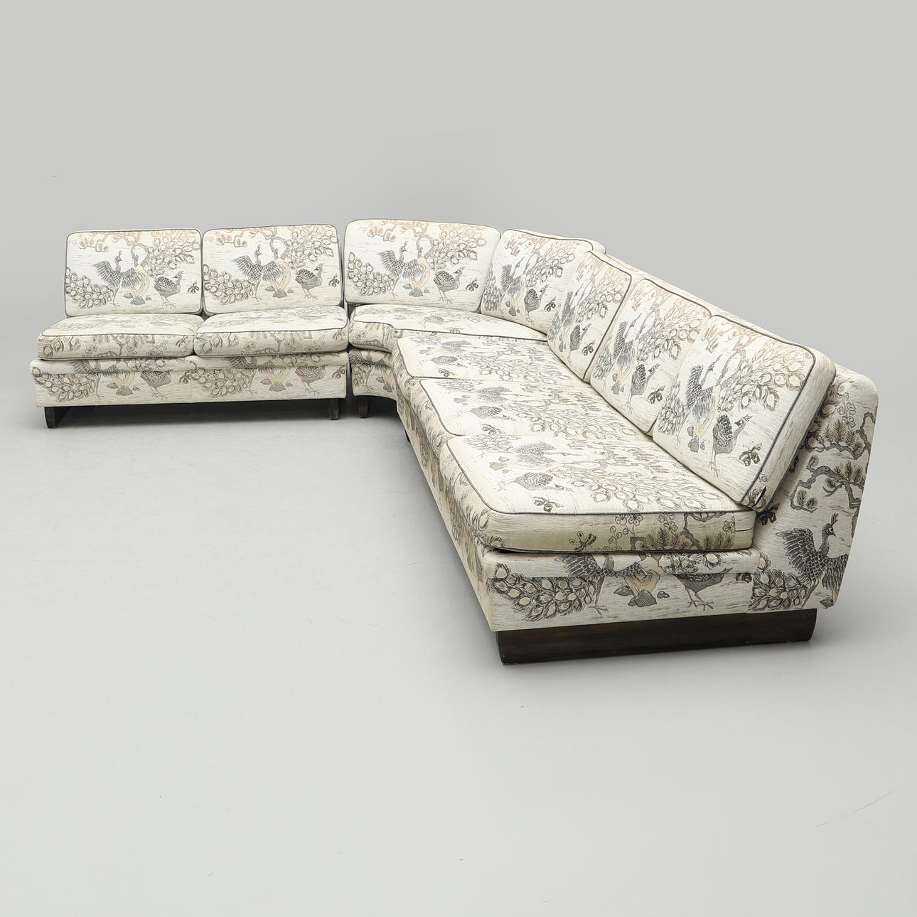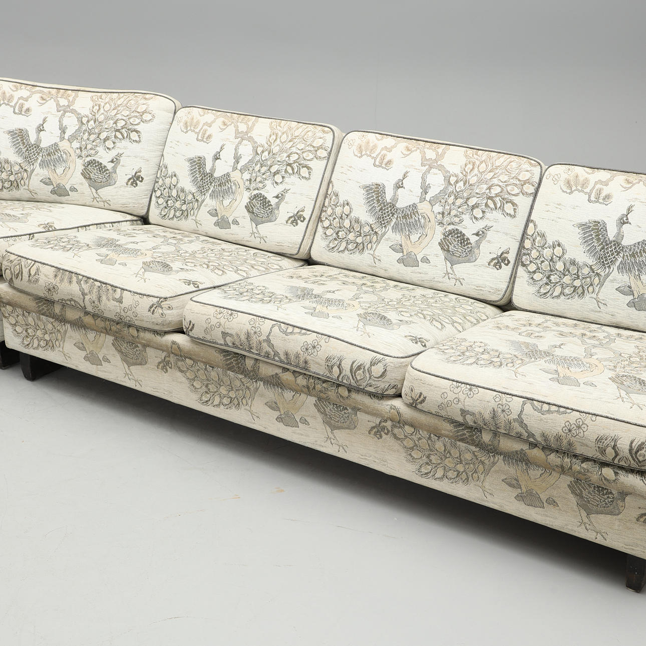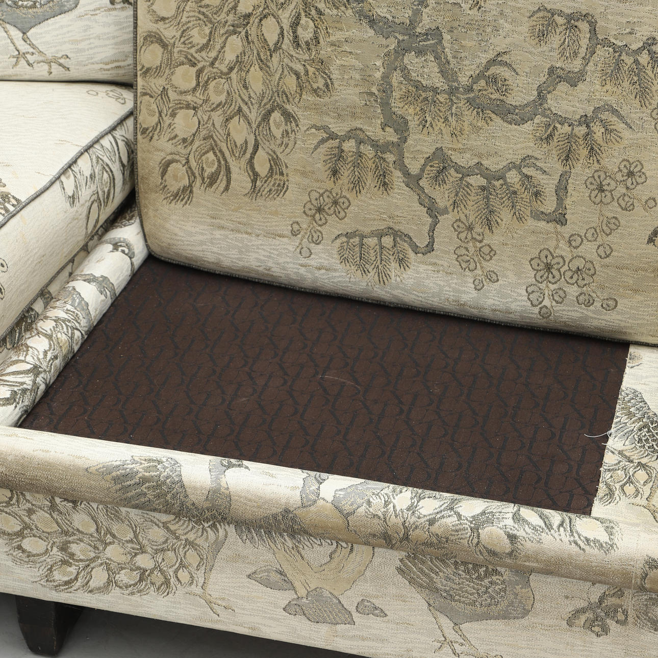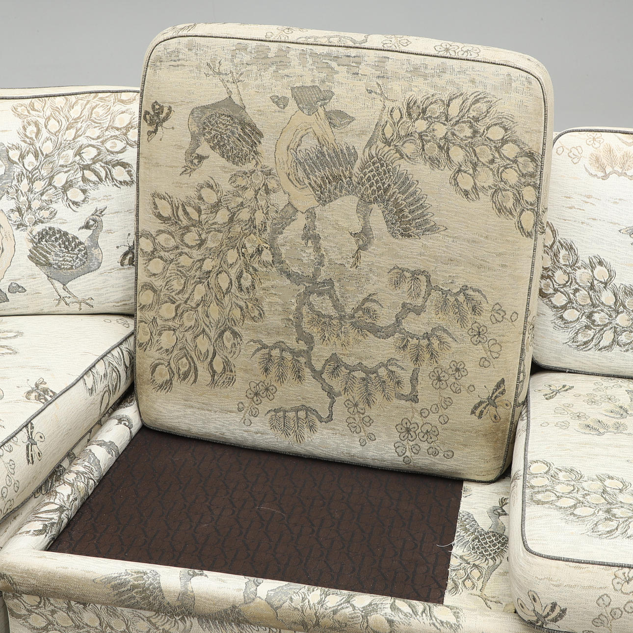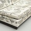 Three-part, with loose upholstered cushions in back and seat, covered in patterned fabric.