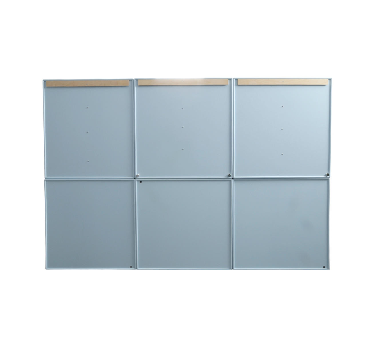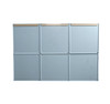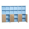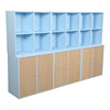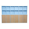 Six Montana modules in light blue lacquered MDF, comprising three cabinets with veneered oak doors and three open shelving units. H. 70, W. 70, D. 30-38 cm.