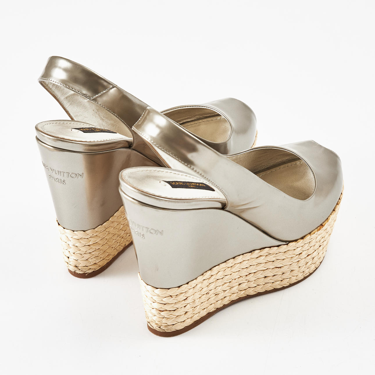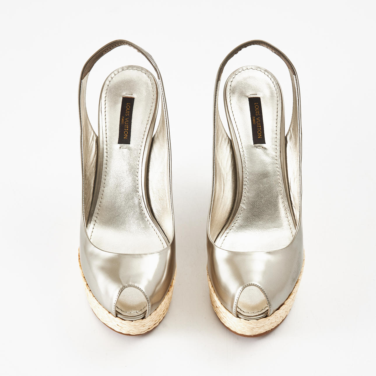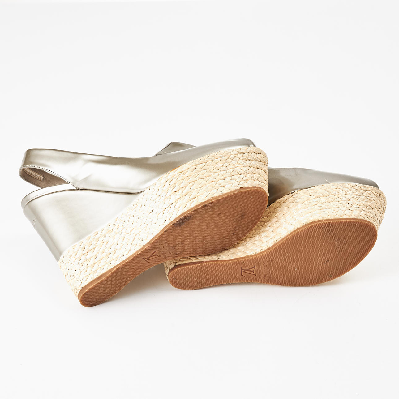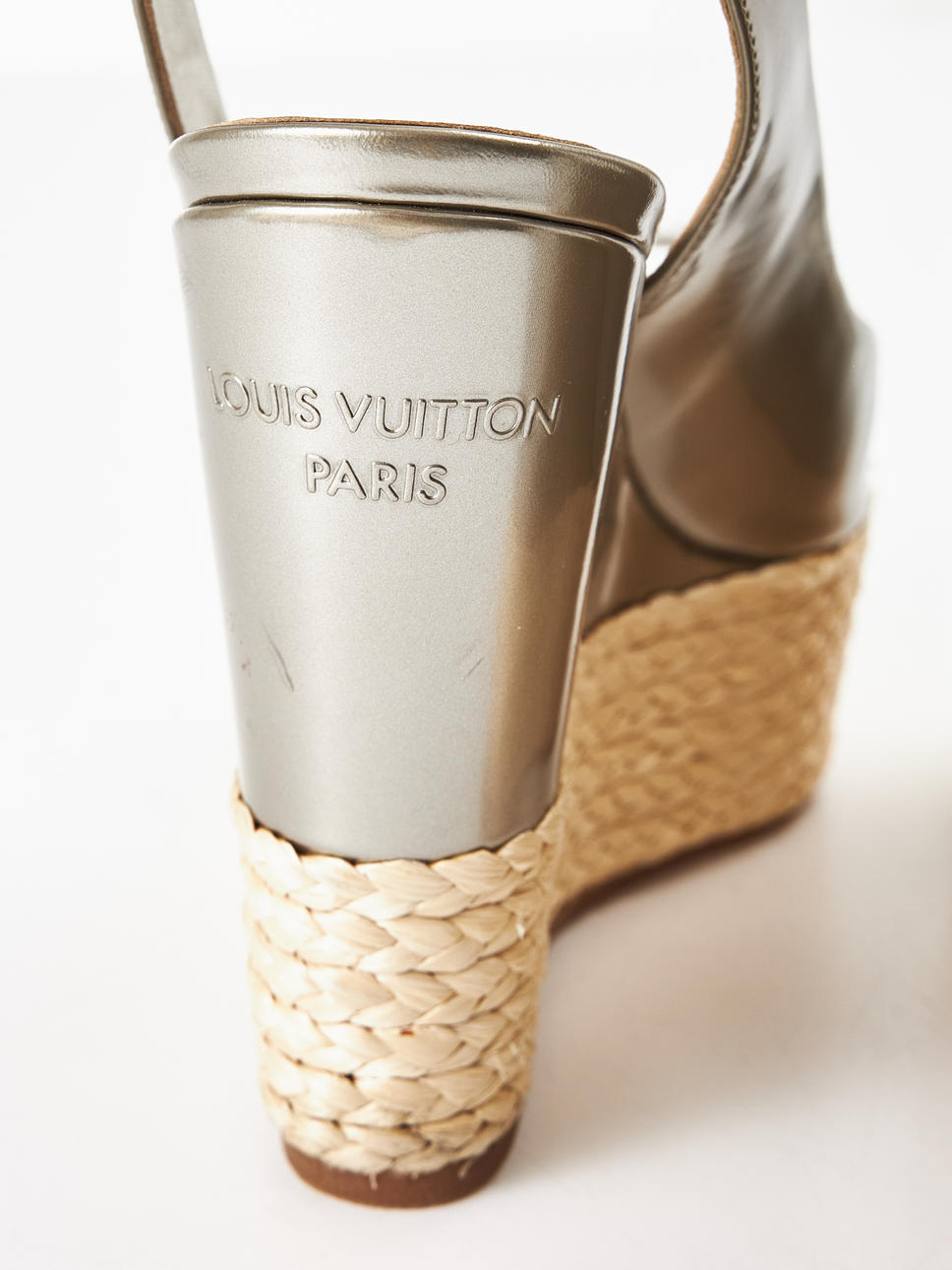 Silver-tone, wedge heel with braided platform, slingback, open toe, marked "Louis Vuitton Paris", size 37 1/2, heel height approx. 13 cm, platform 4.5 cm