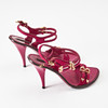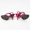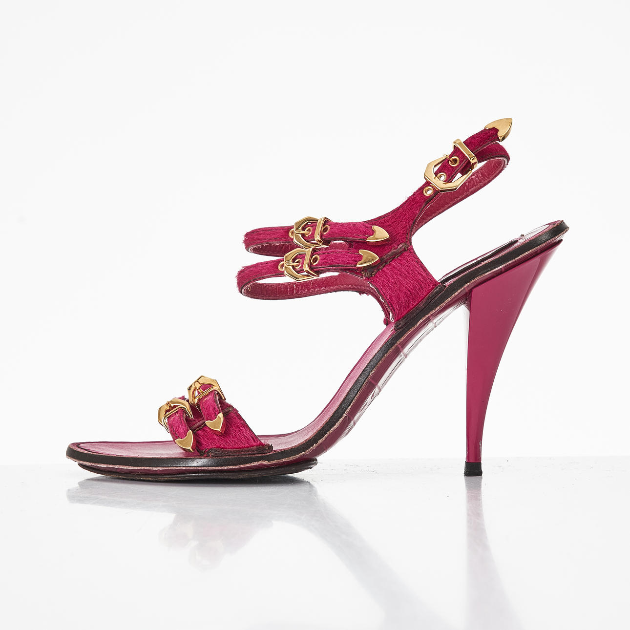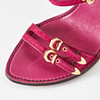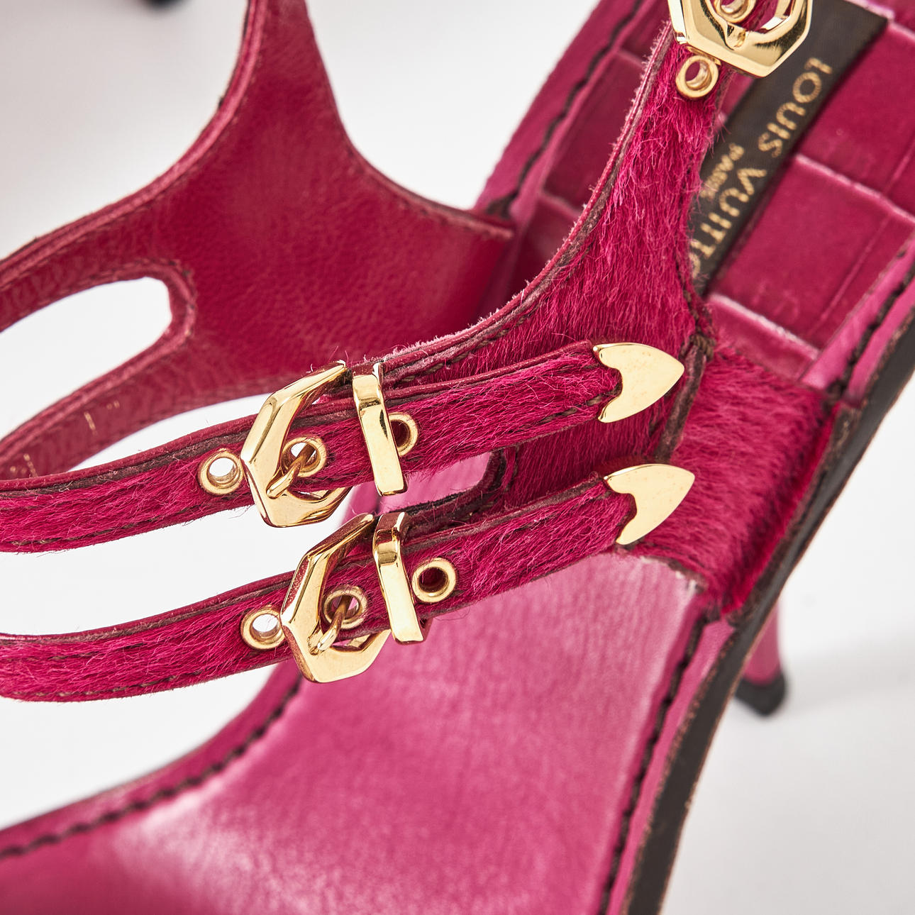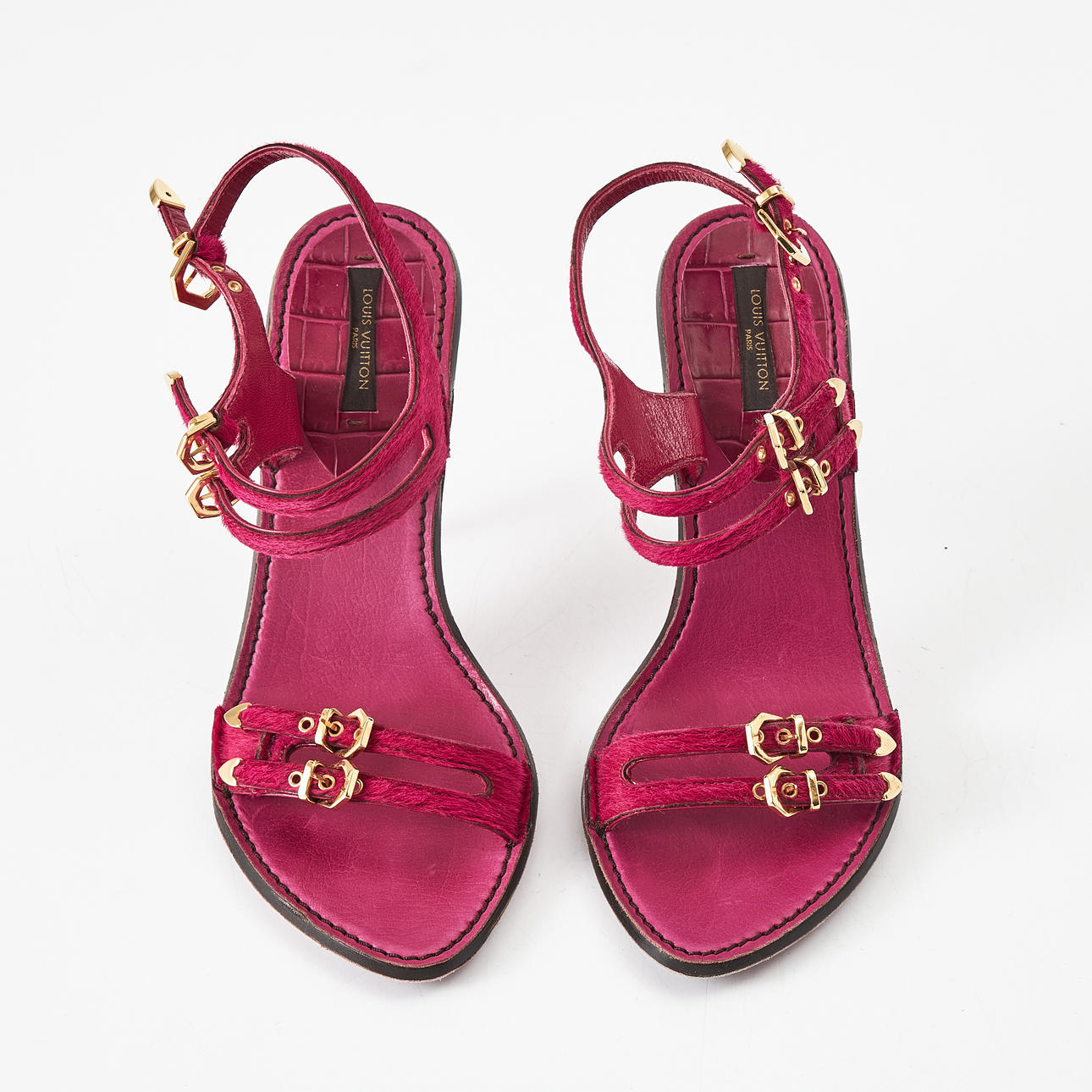 Hot pink suede, gold-tone metal buckles, crocodile-embossed leather sole, marked "Louis Vuitton Paris", size 37, heel height 7-10.5 cm.