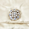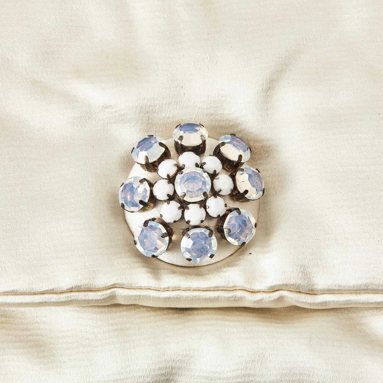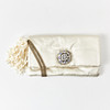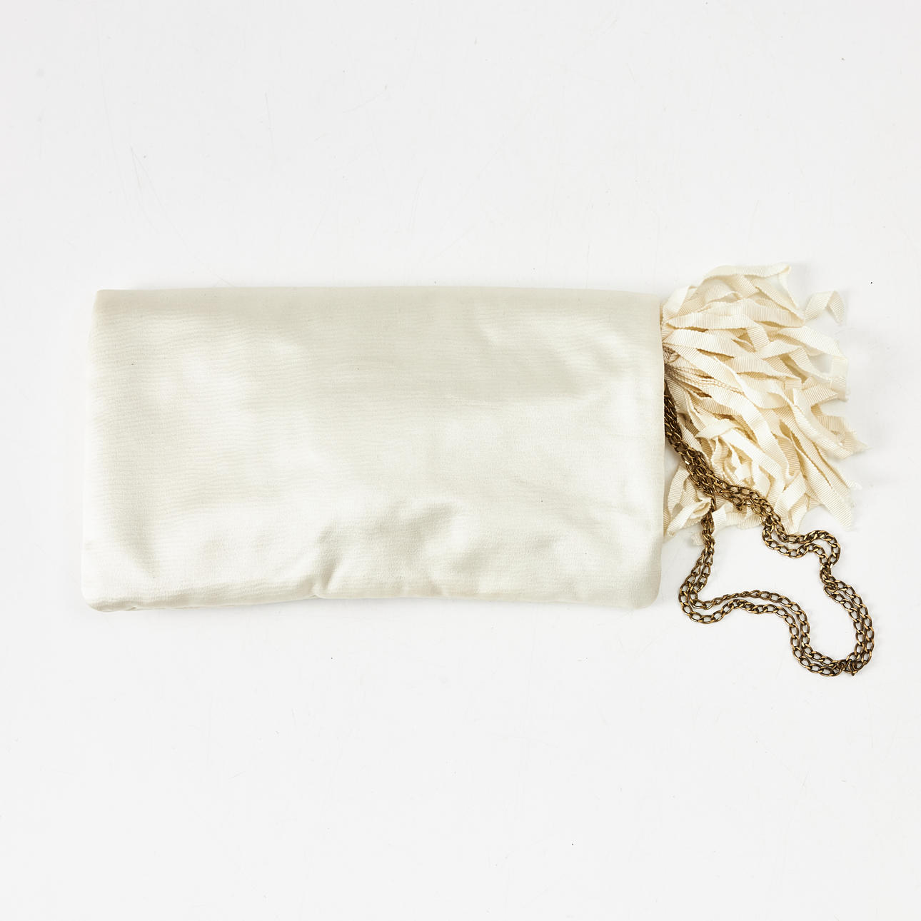Envelope bag in light satin, snap button with rhinestones, folded opening, storage compartment with zipper, underside with tassel and chains, lined in blue satin, marked "Lanvin Paris made in Italy", dimensions approx. 25 x 14 x 2 cm.