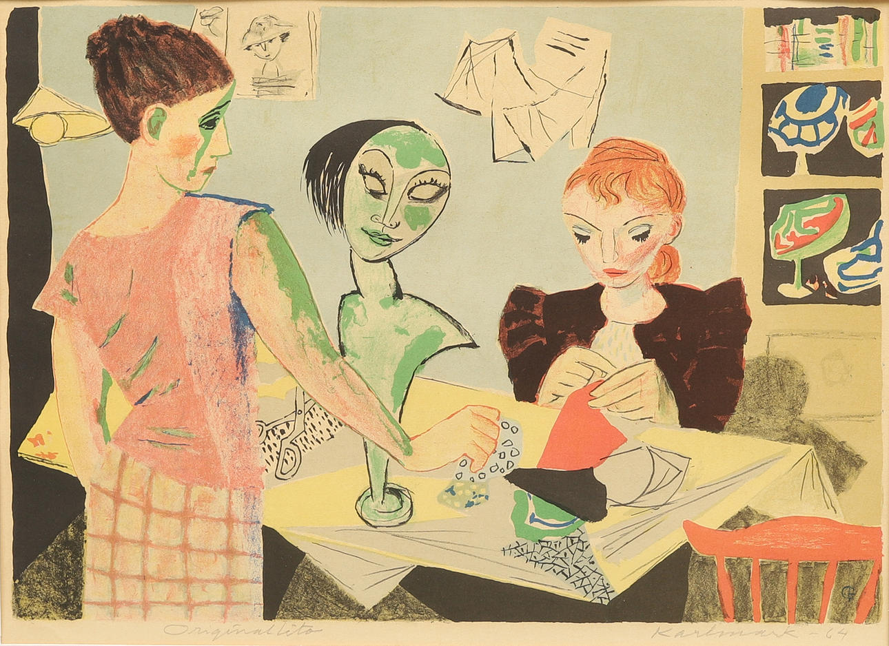 GERHARD KARLMARK. Milliners, colour lithograph, original print, signed, dated -64.