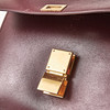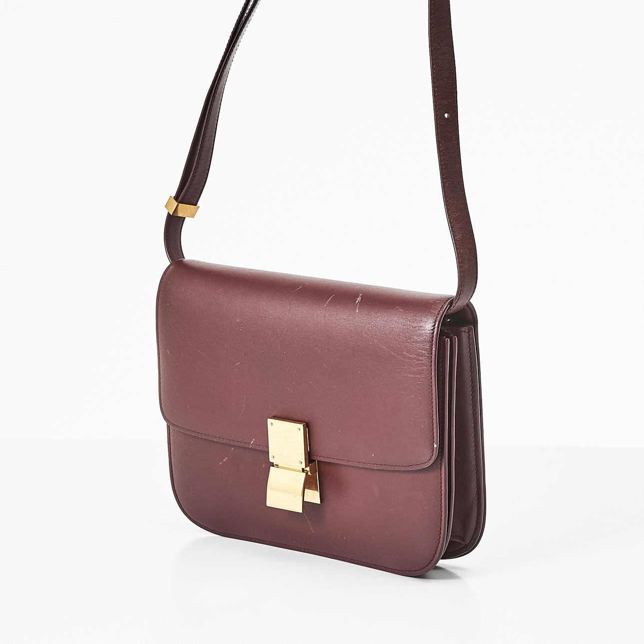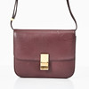 Box calfskin, oxblood red with gold-tone metal hardware, flap with clasp, interior with three compartments including one zipped and one smaller compartment with two open pockets, marked "Céline Paris- Made in Italy", dimensions approx. 23 x 19 x 7 cm.