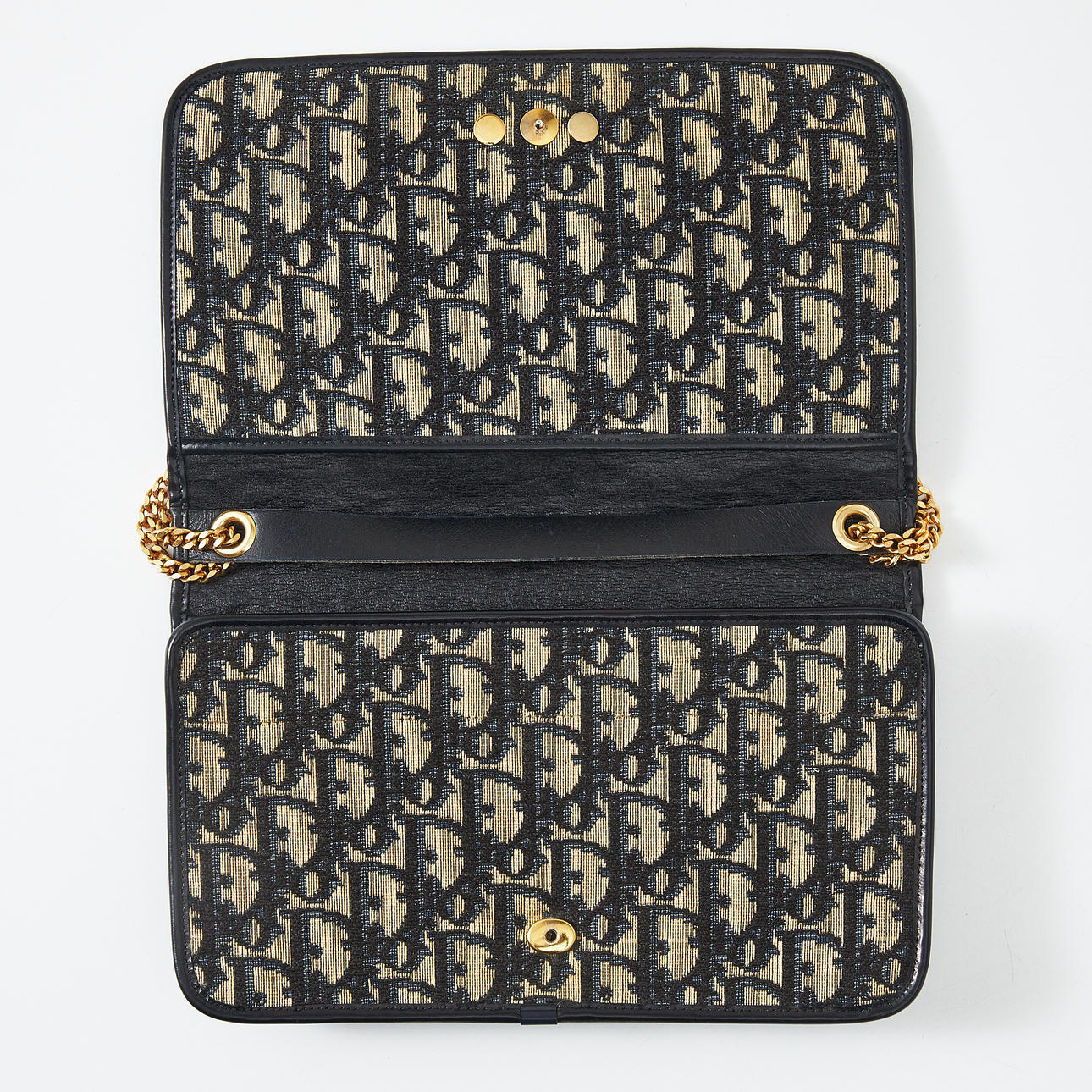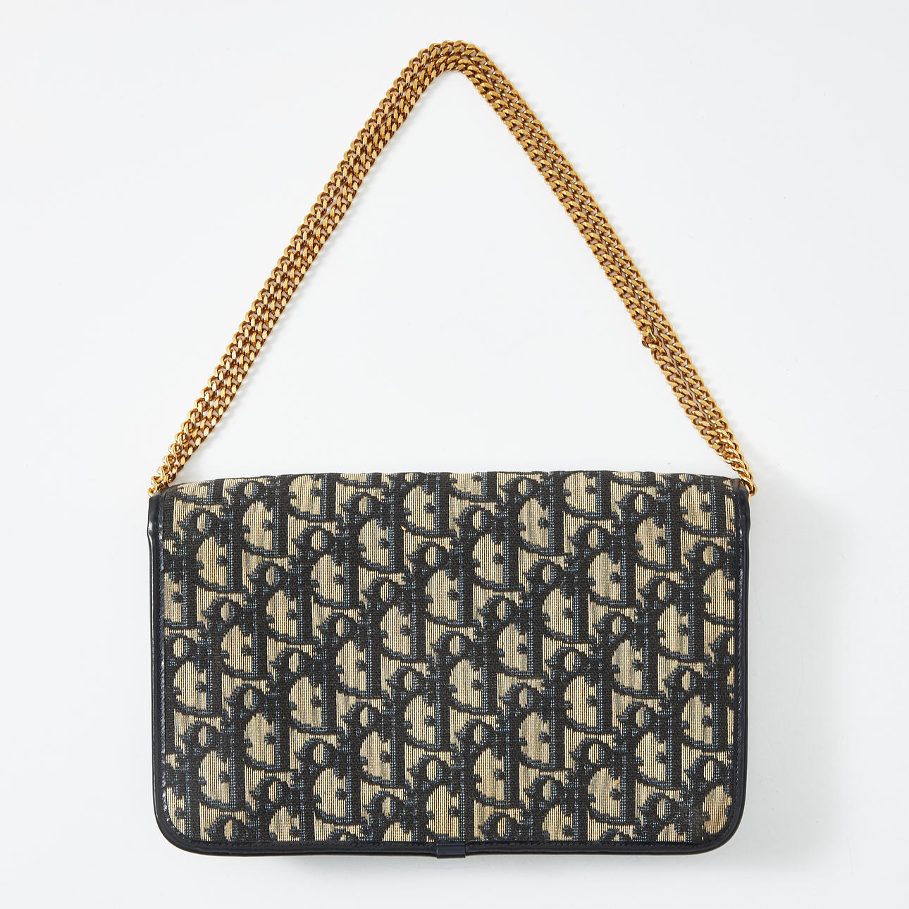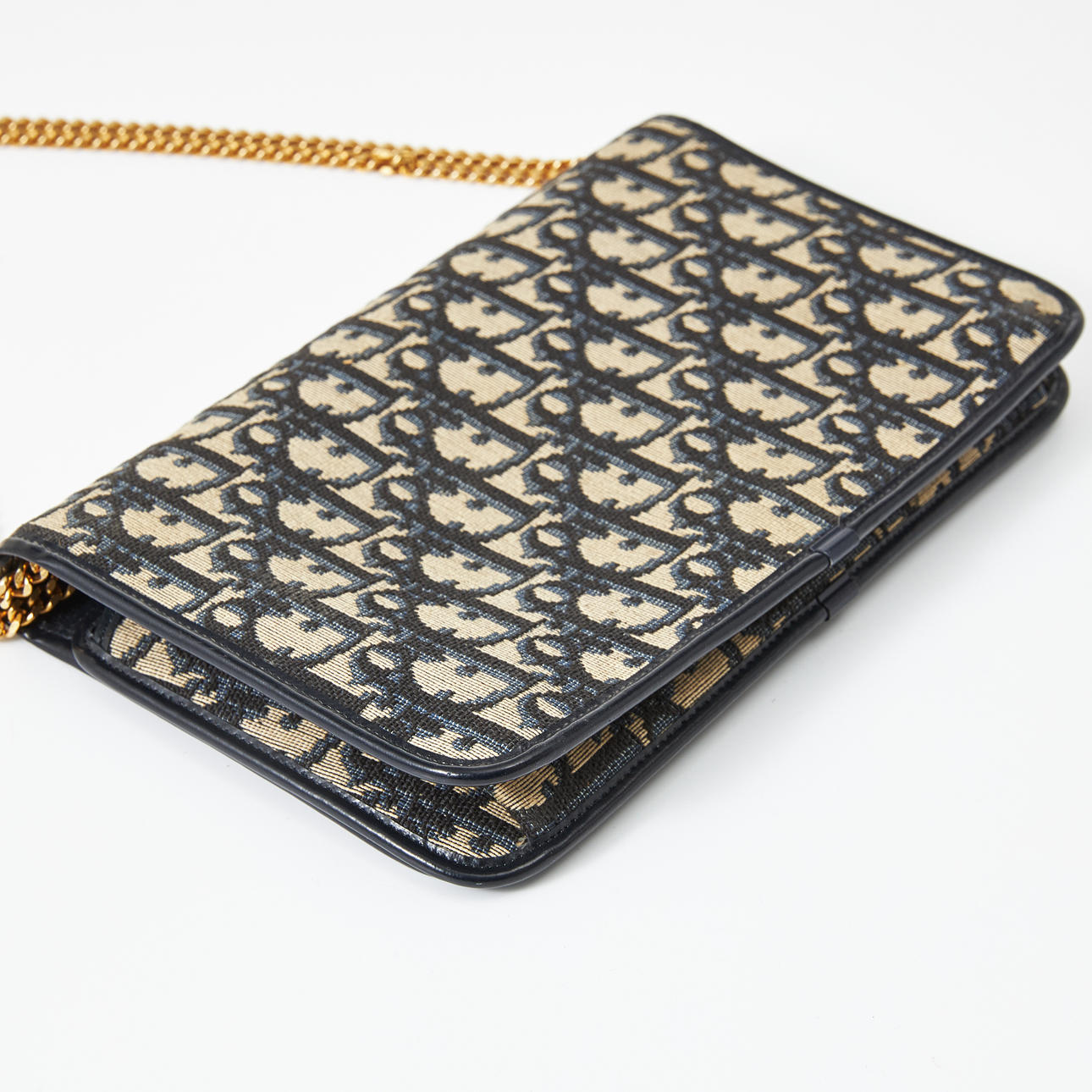 In monogram canvas, trimmed in dark blue, adjustable gold-tone metal chain, CD logo to the front, interior in dark blue leather, compartment under flap, dimensions approx. 24 x 15 x 3 cm.