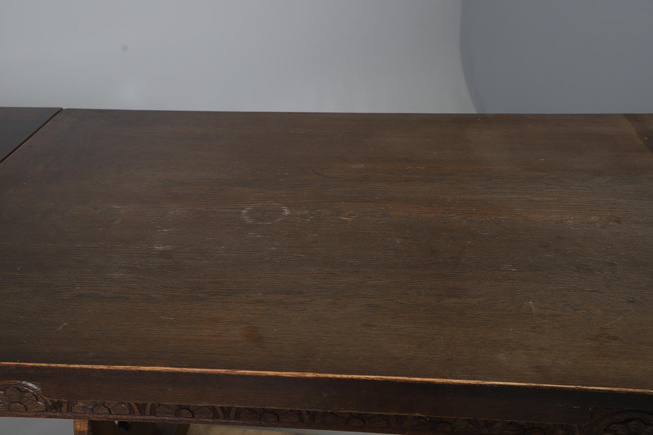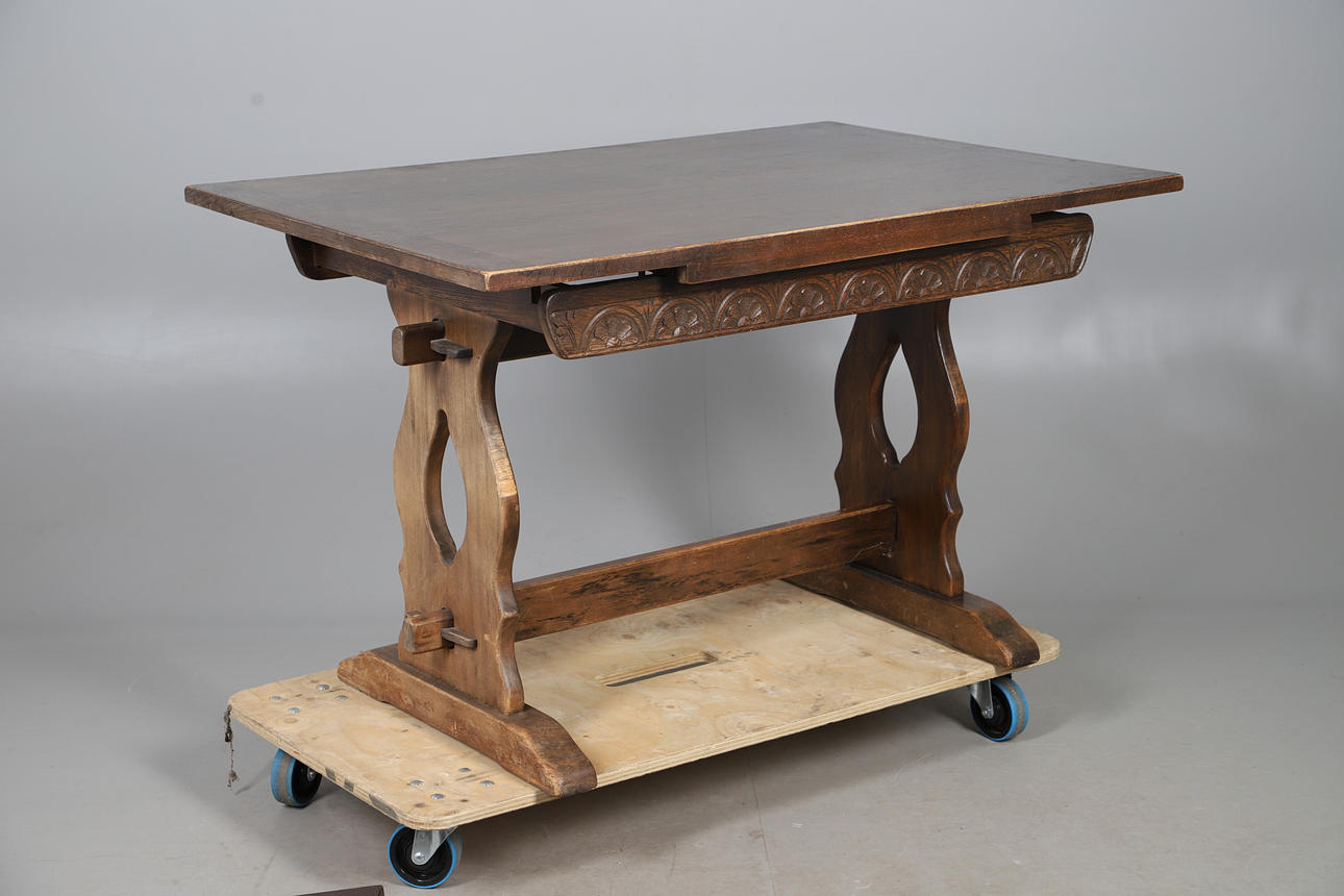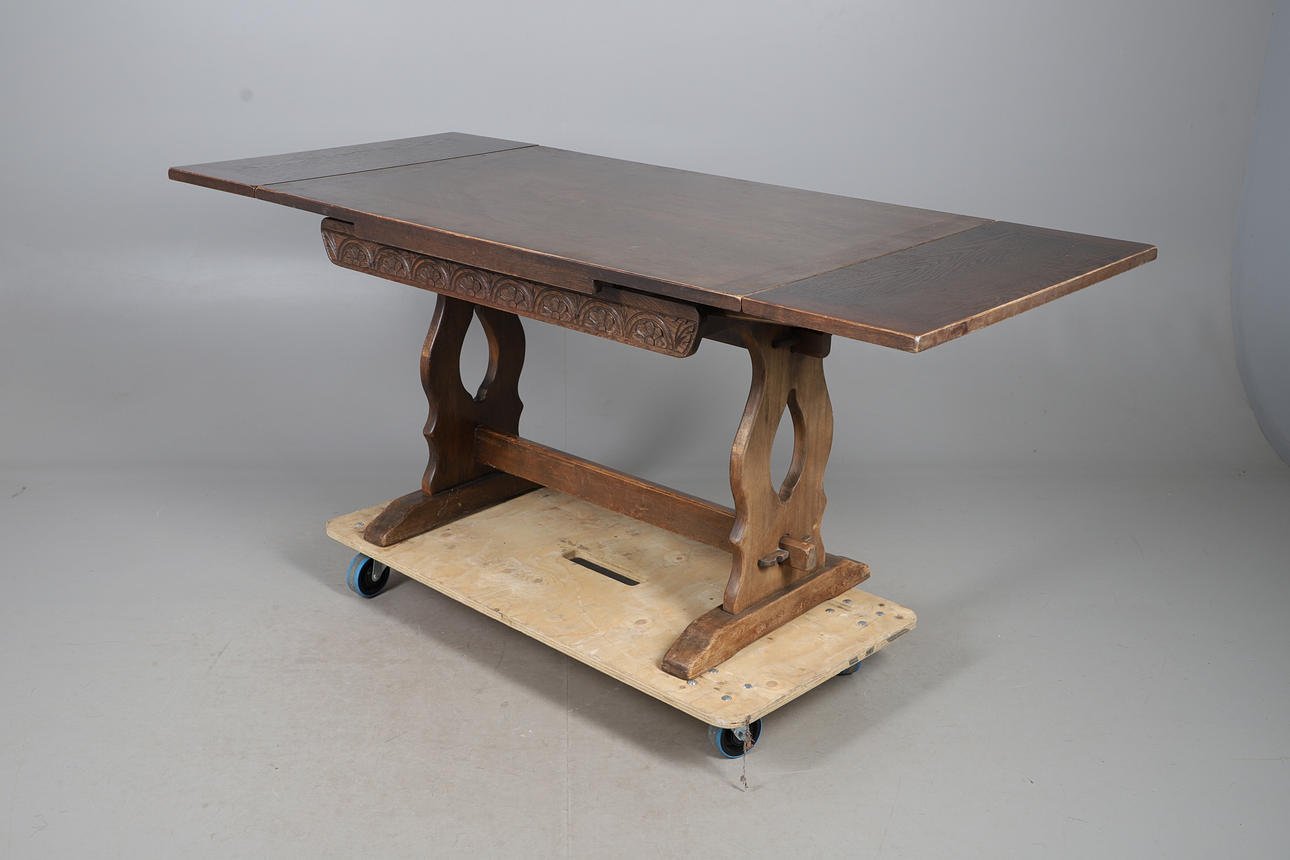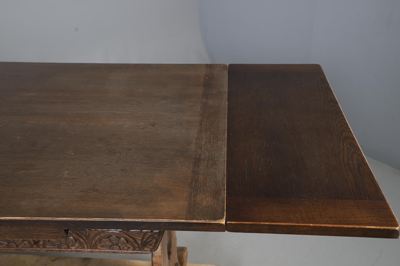 A 1950's oak draw leaf dining table, with carved decoration to the sides and raised on trestle supports.76cm (h) x 122cm x 81cm, each leaf adds 30.5cm to the length).