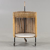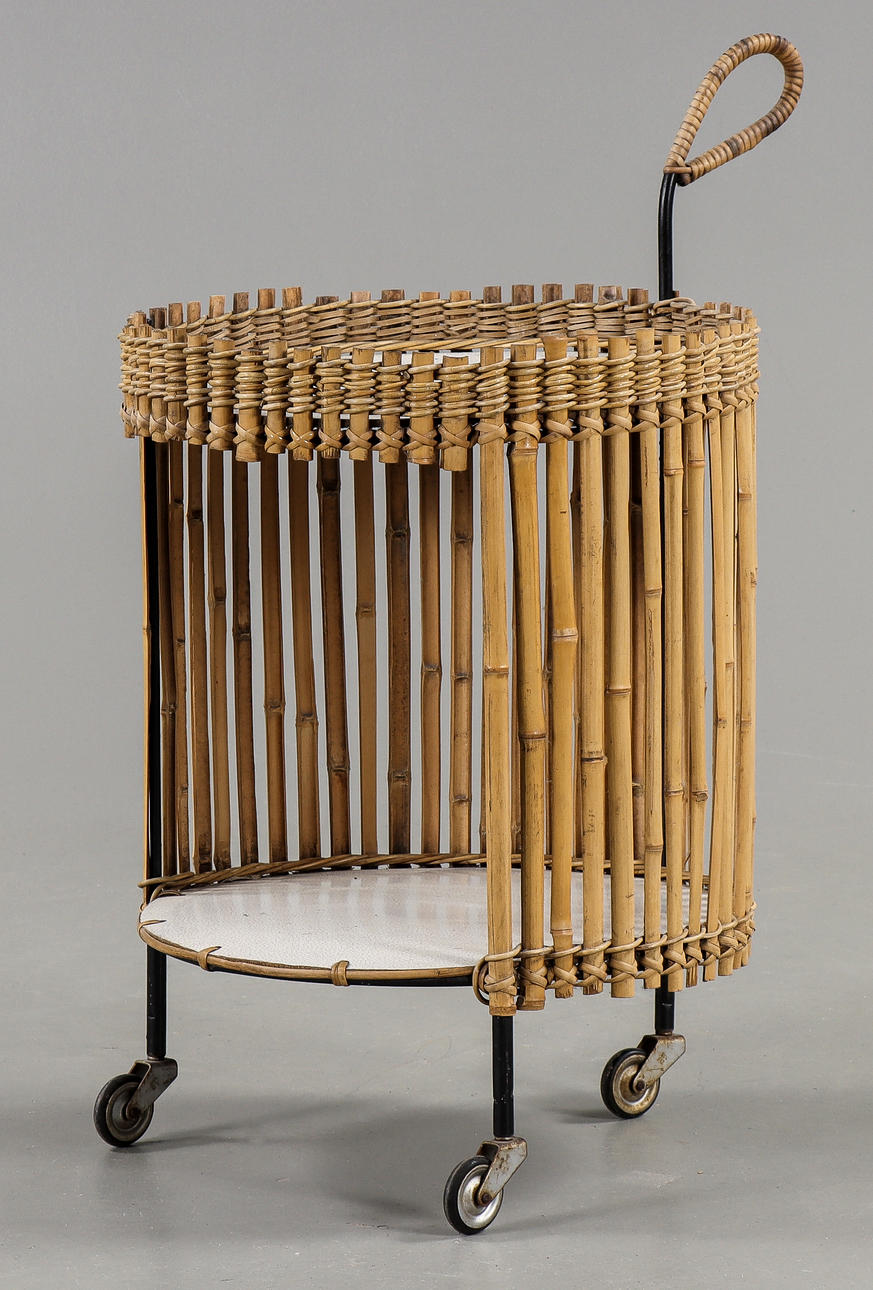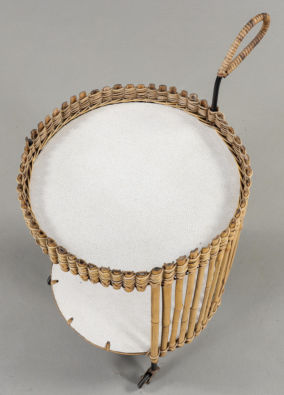Metal, rattan and bamboo, shelves in laminated fiberboard.