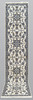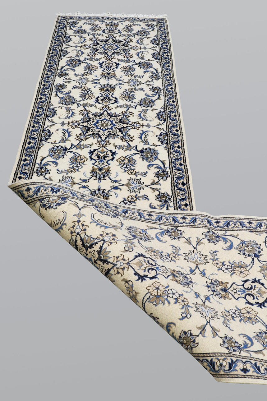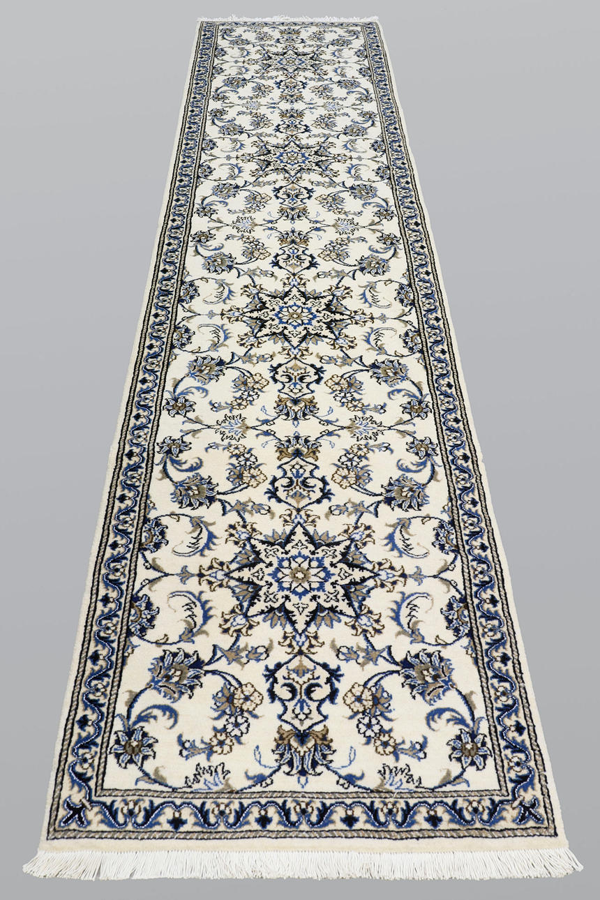 Nain runner with a light ground and four star-shaped medallions. The field is filled with floral ornamentation, palmettes, and arabesques in blue and beige tones. The border has a light ground and floral decoration in a matching color scheme. The pile is wool and the warp is cotton.