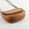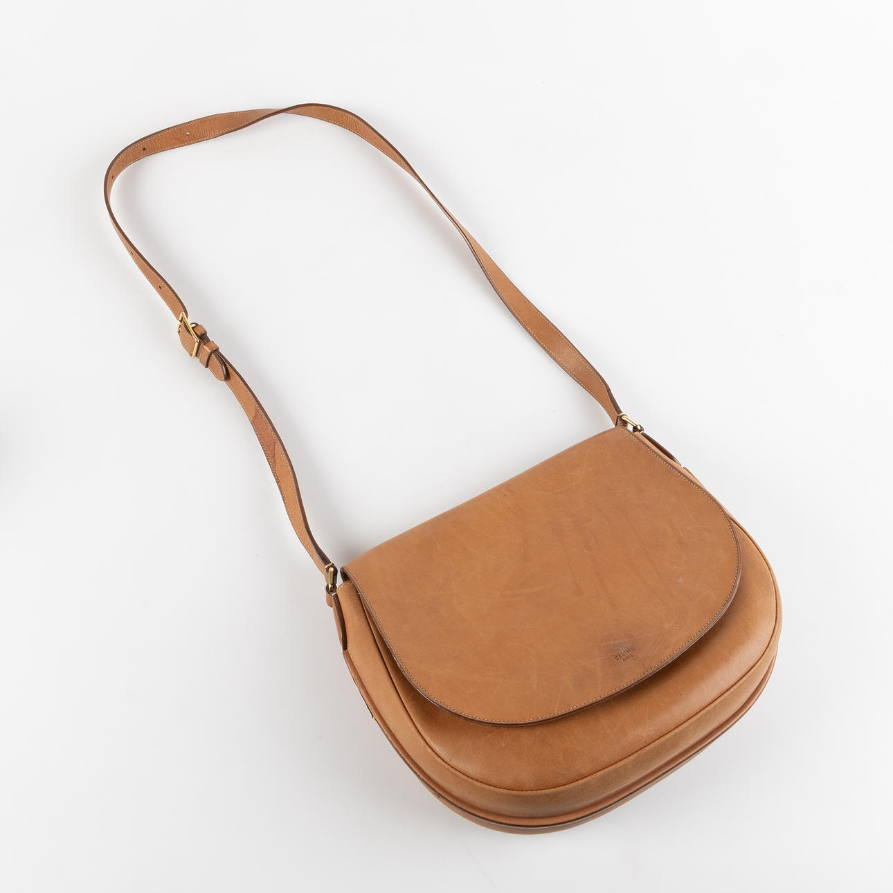in brown leather with gold-tone metal hardware. Interior with one central compartment and two open side compartments. Flap with underlying buckle. Marked CÉLINE PARIS and S - GM- 0114.