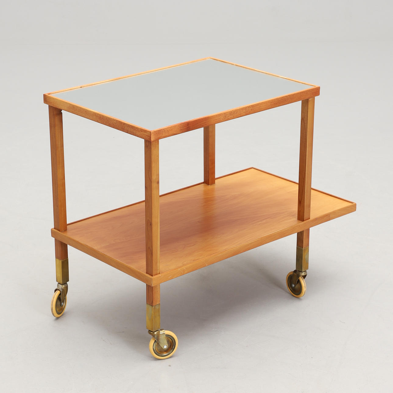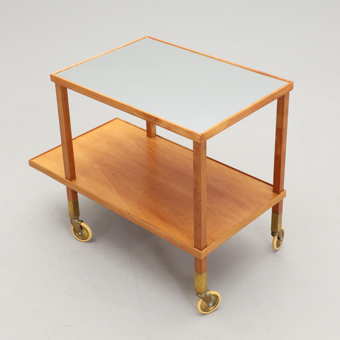 Hardwood frame. Upper section with mirror glass. Legs with brass ferrules and casters.