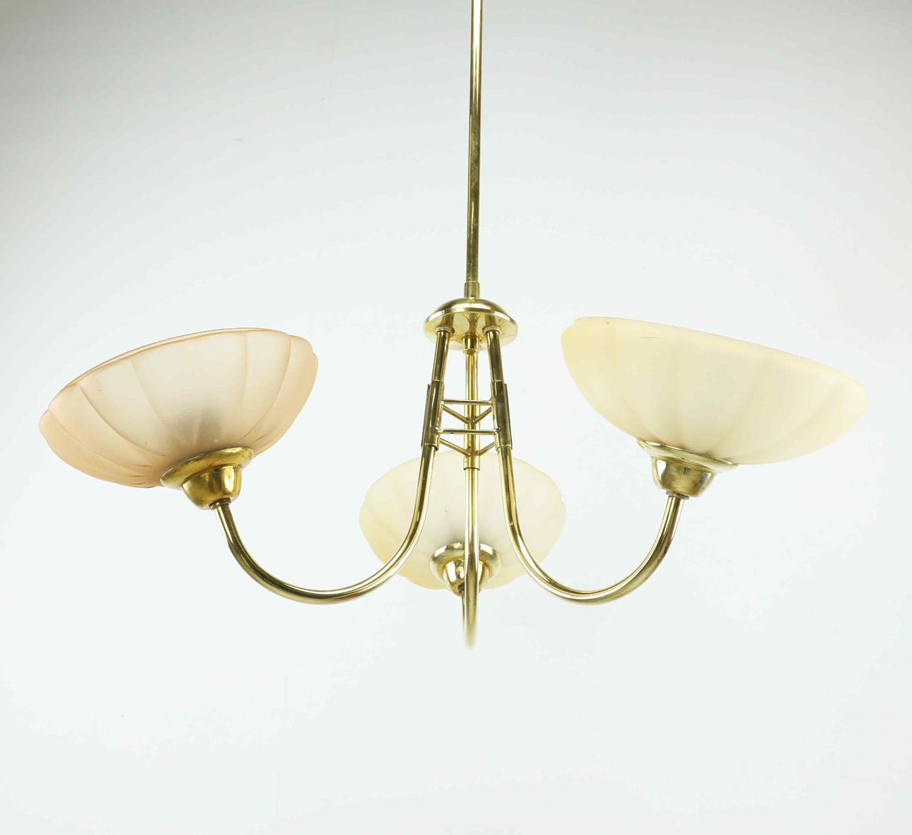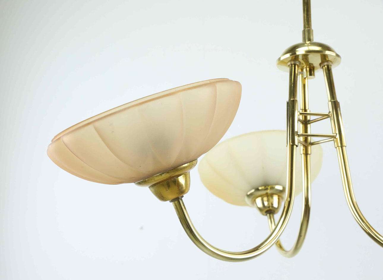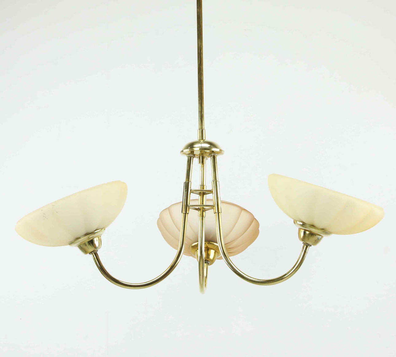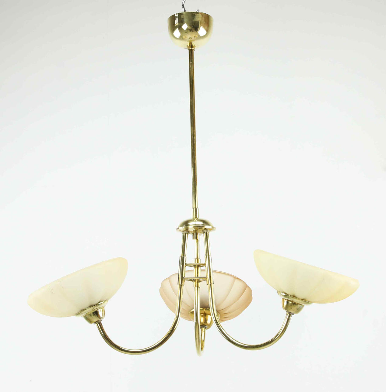 Use- and age-related wear. Worked at the time of cataloging. No functional guarantee is provided. One lamp shade has a different color tone compared to the others. Scratches/marks present. One minor edge chip on 1 shade.