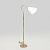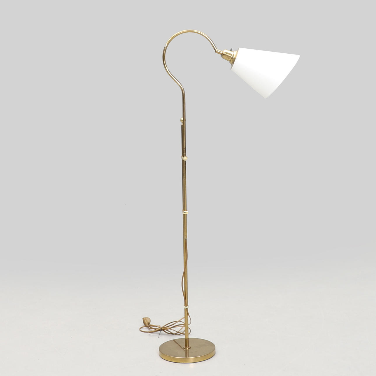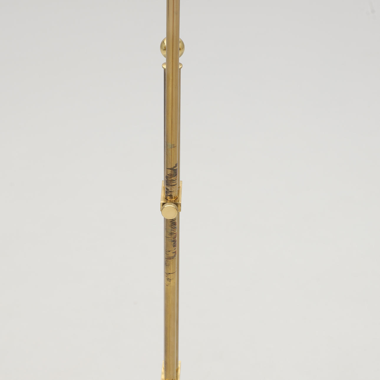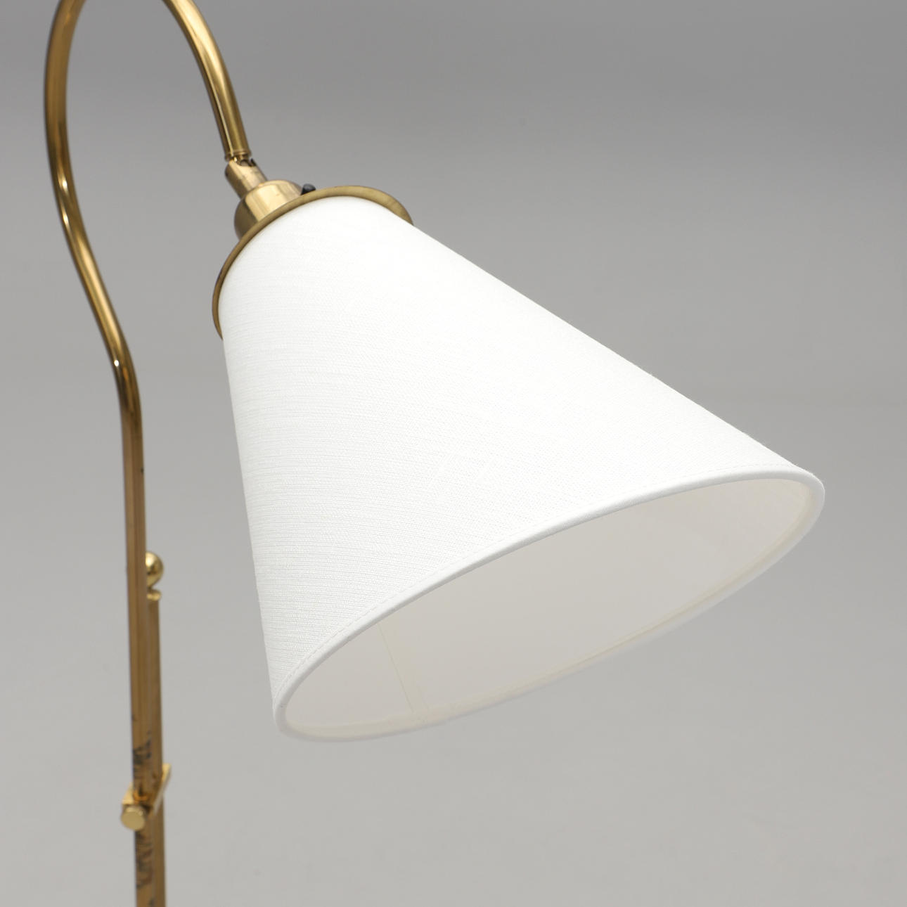 Brass. Adjustable height. White fabric shade. Labelled. Height 107-140 cm.