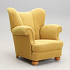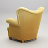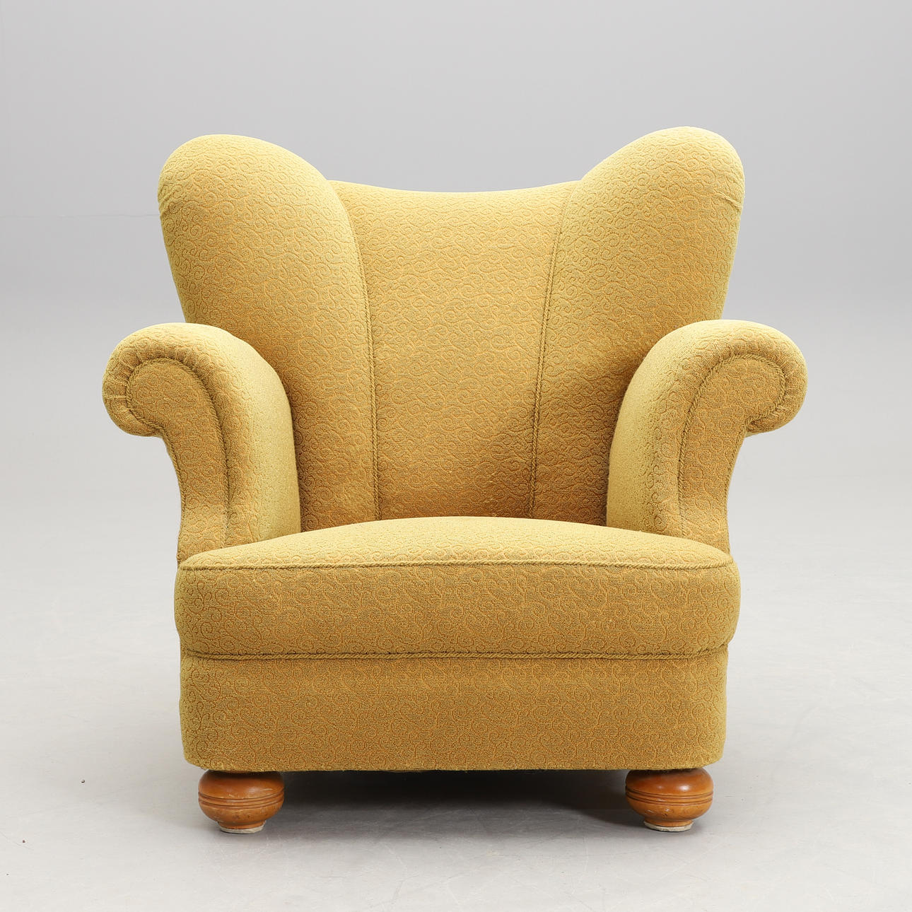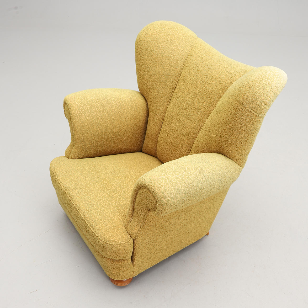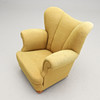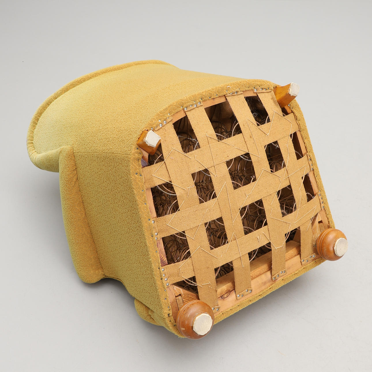 Fully upholstered, covered in yellow-green relief-patterned fabric. Width 90, depth 88, height 90 cm.