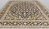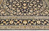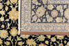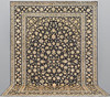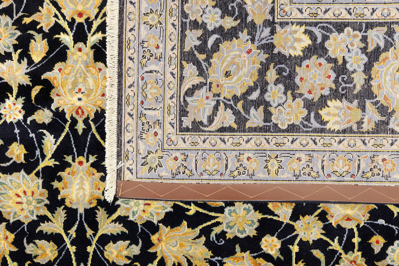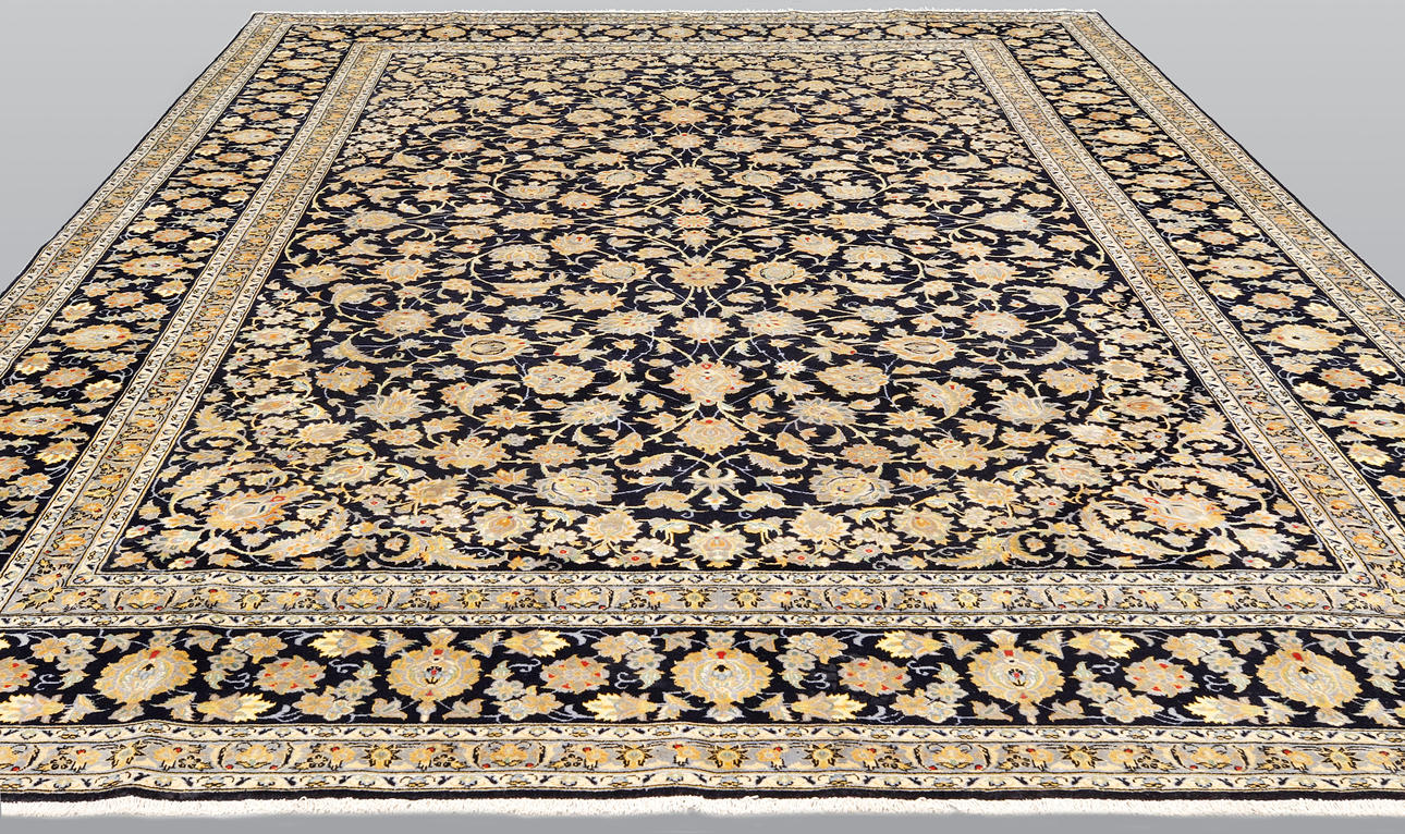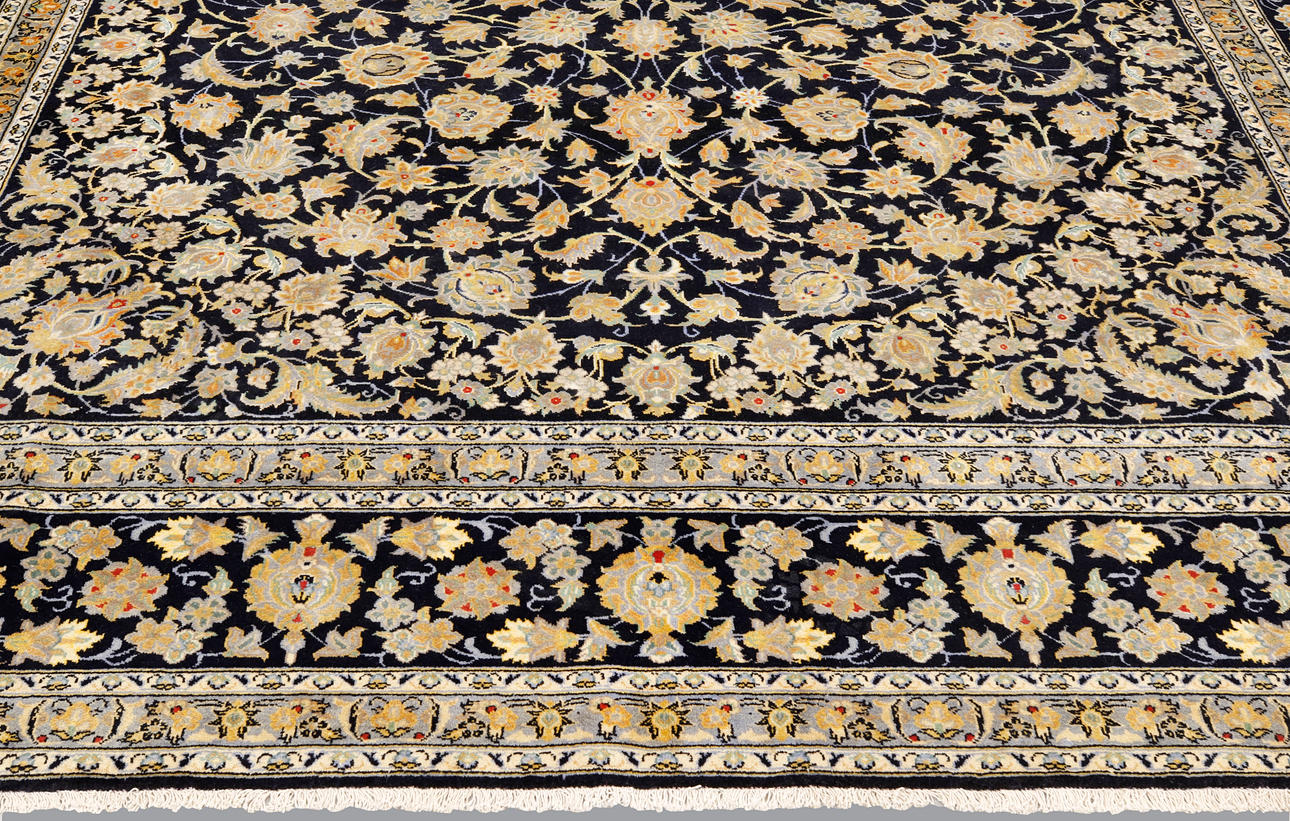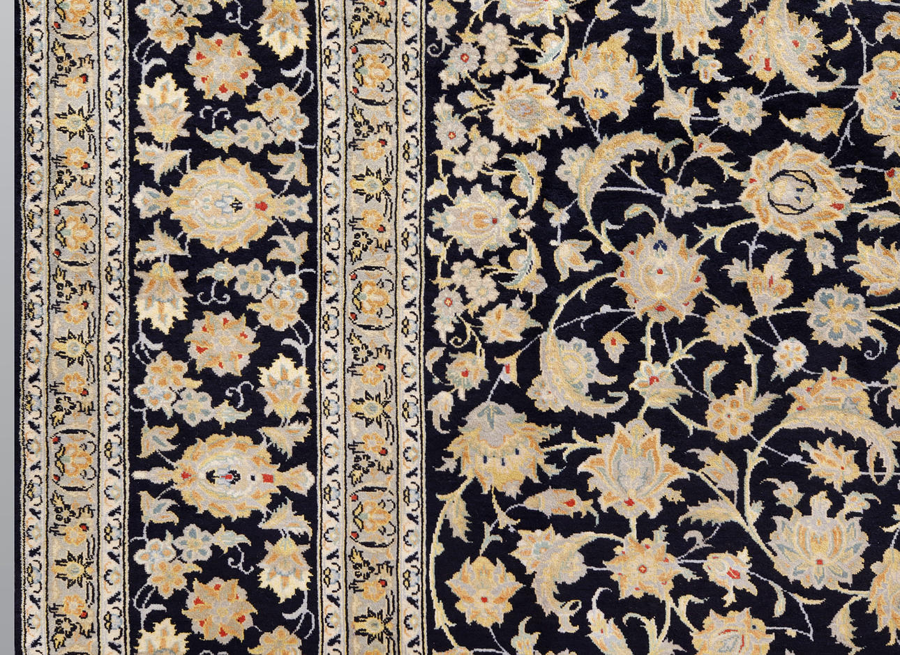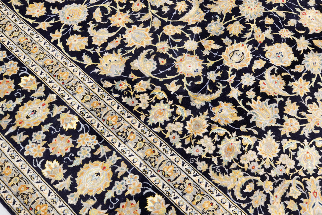 Blue Keshan signed with a dark blue field and a central area covered in floral ornamentation, palmettes, and arabesques in beige, light blue, and yellow details. The border has a dark blue ground with a design of palmette vines and floral motifs. The pile is wool and the warp is cotton.