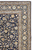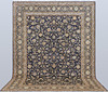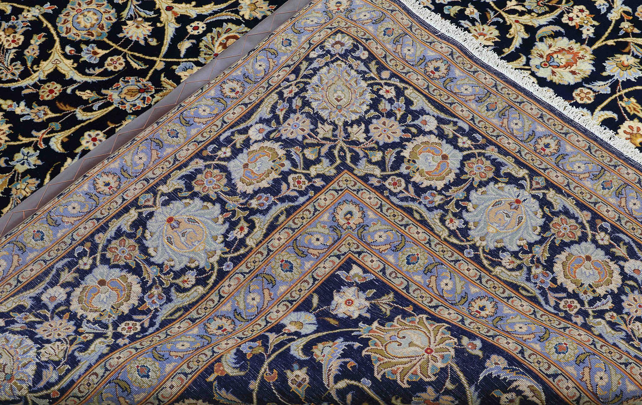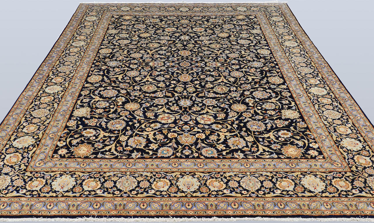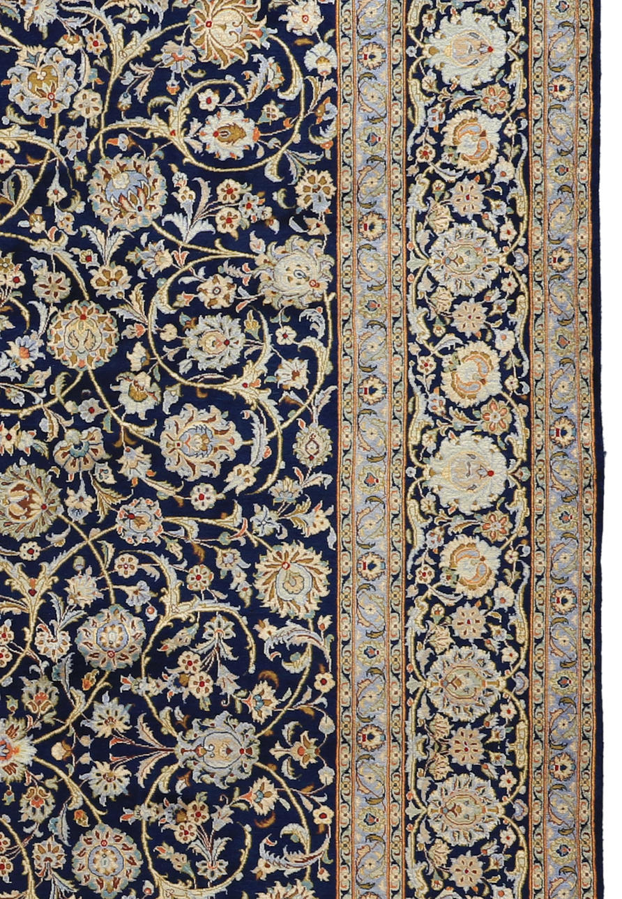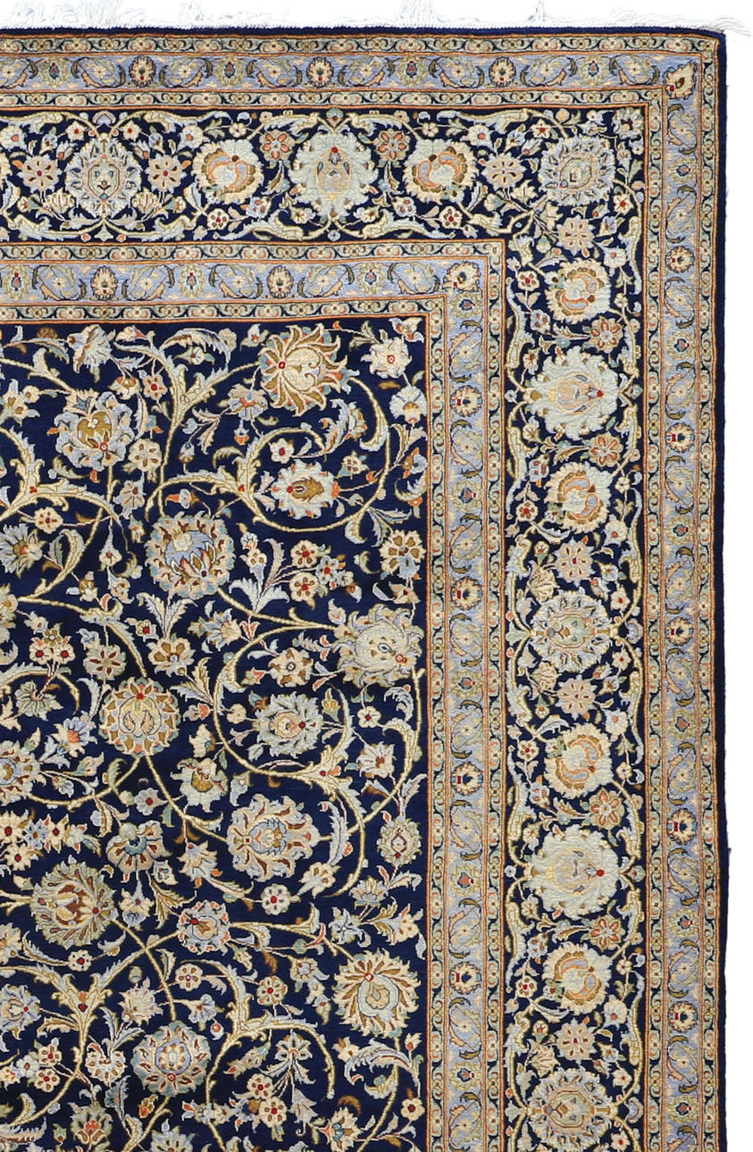 Blue Keshan signed with a dark blue field and a central field covered in floral ornamentation, palmettes, and arabesques in beige, light blue, and yellow details. The border has a dark blue ground with a decoration of palmette vines and floral motifs. The pile is wool and the warp is cotton.