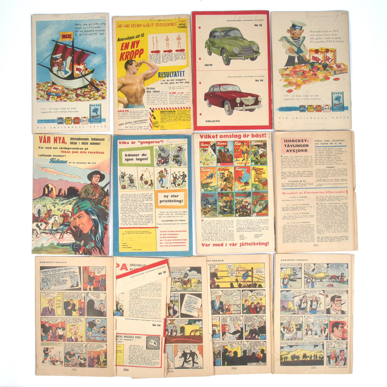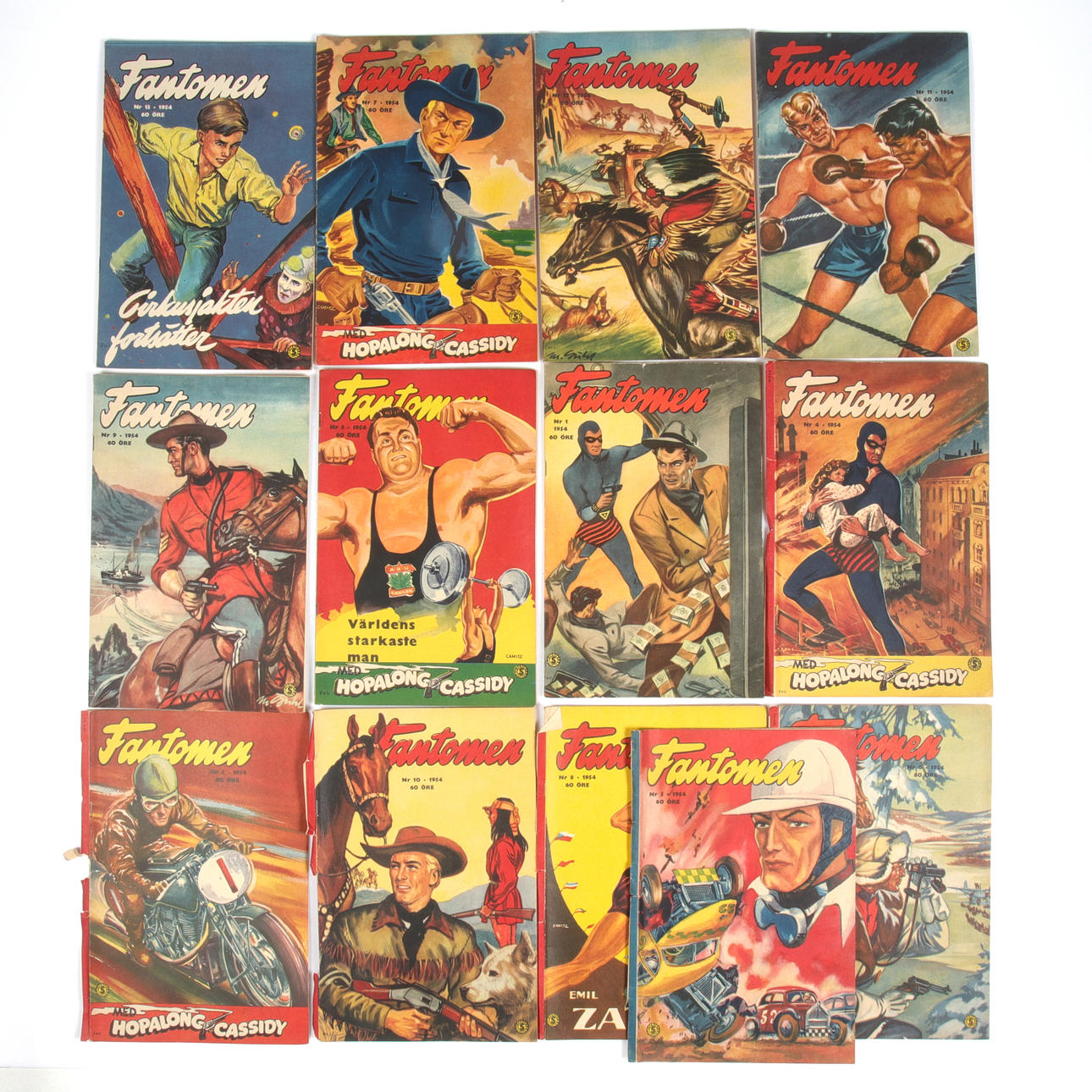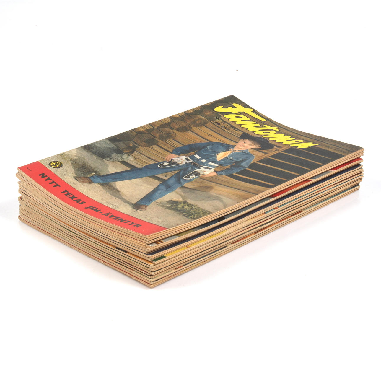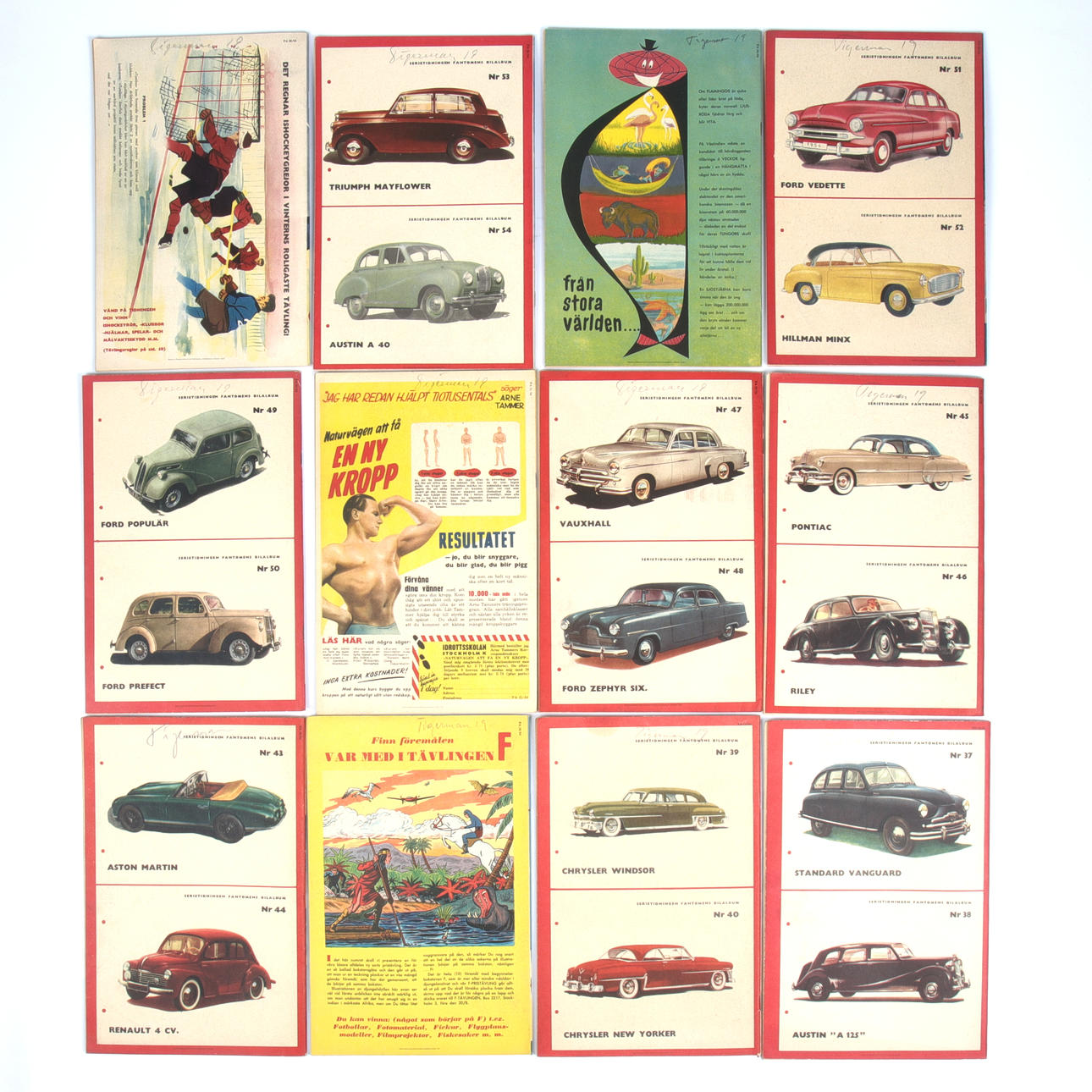 Use- and age-related wear. Most issues in good condition, except for no. 2, 4, 5, 6, 8, 10, which are missing their back covers. (Cut off). Pencil text on all back covers.