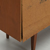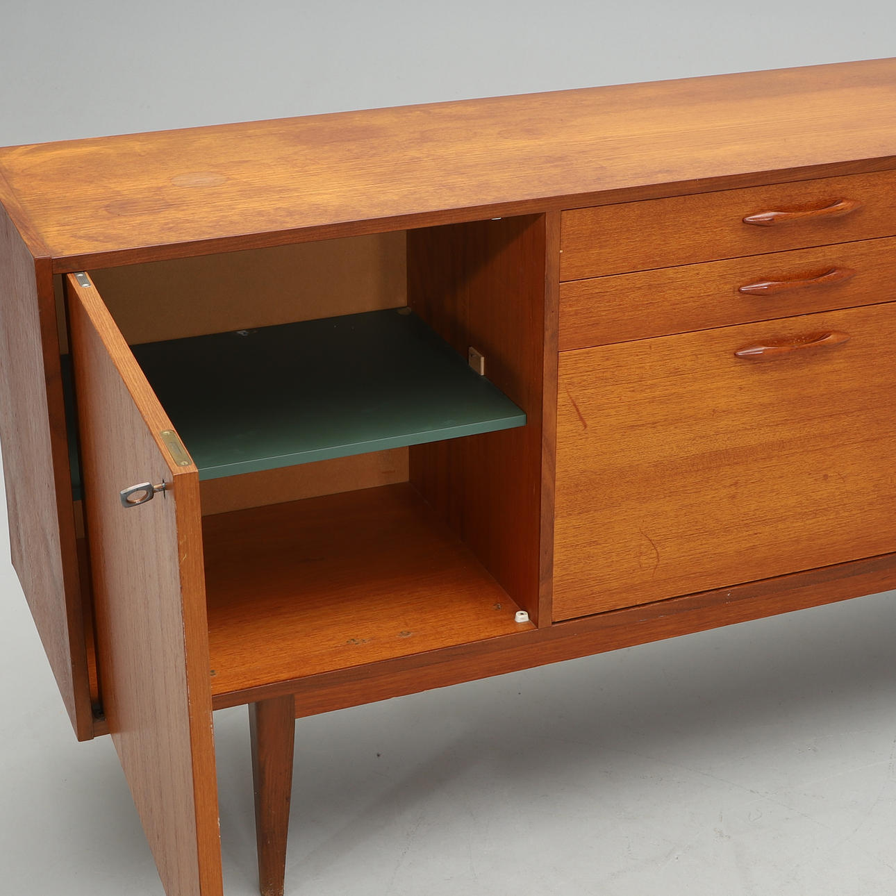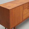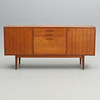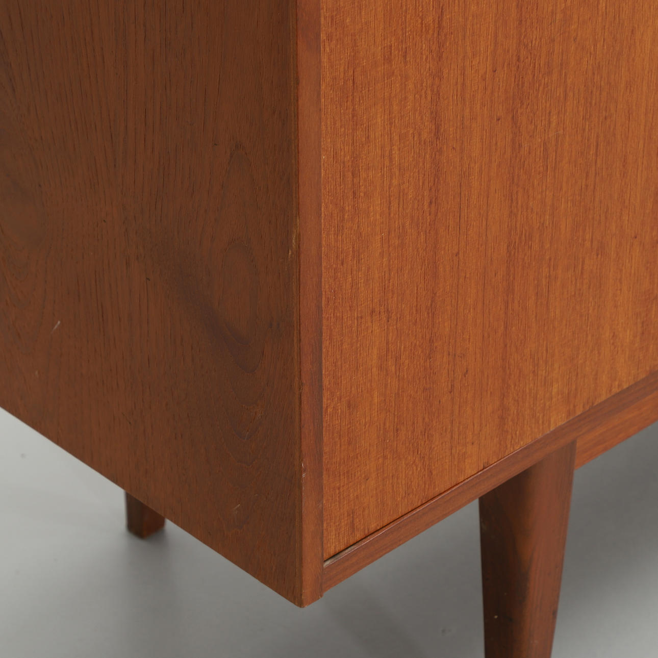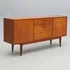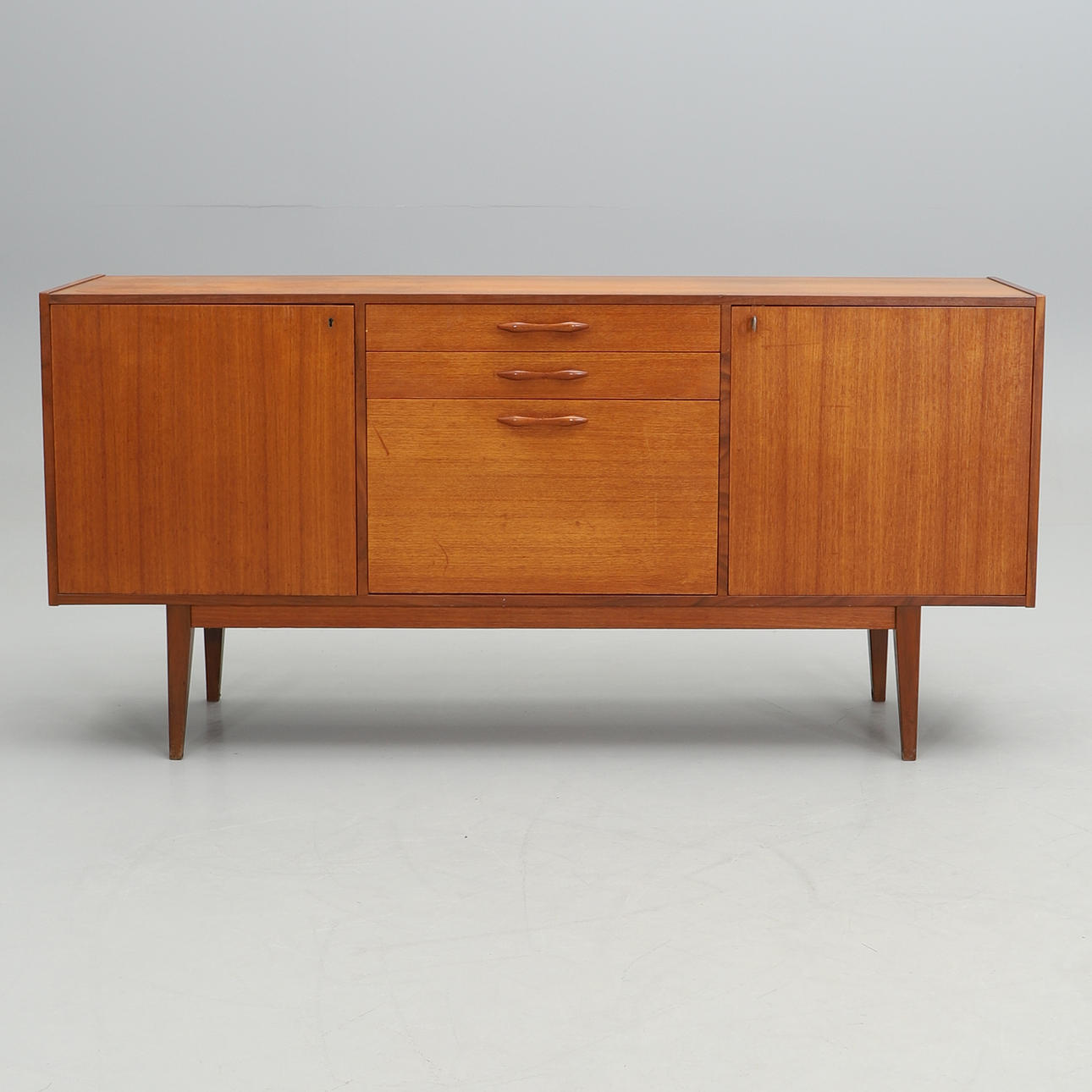 Teak veneer. Two doors, two drawers, one drop-down door. Length 170, depth 43, height 82 cm.