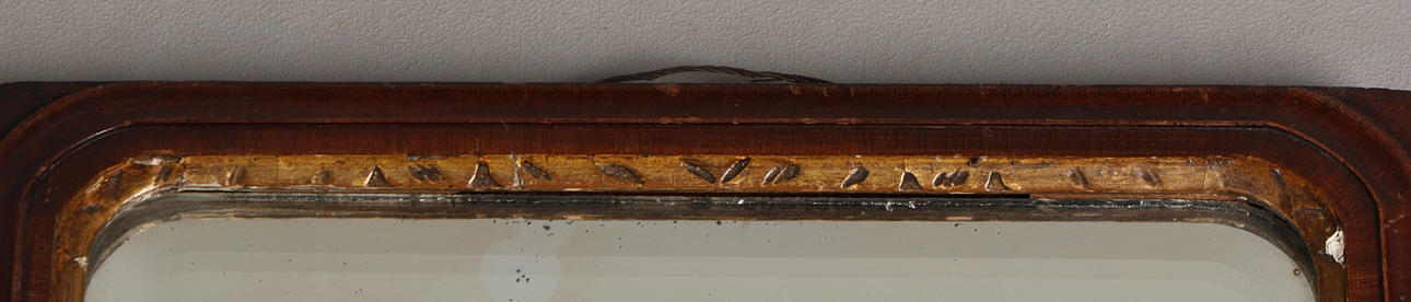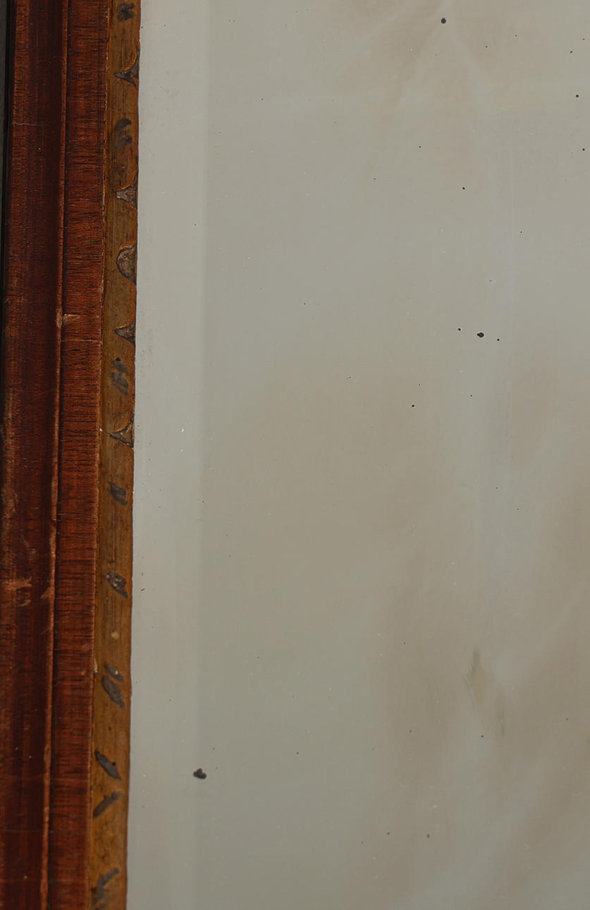 The mahogany frame with arched top section gilt slip and bevelled mirror plate, 35cm wide, 55cm high.