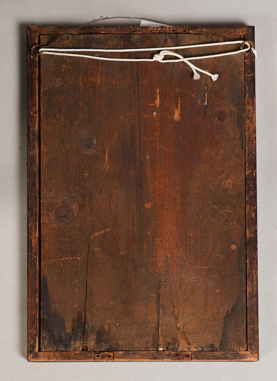 Chips and losses to frame, back board warped and slightly loose.