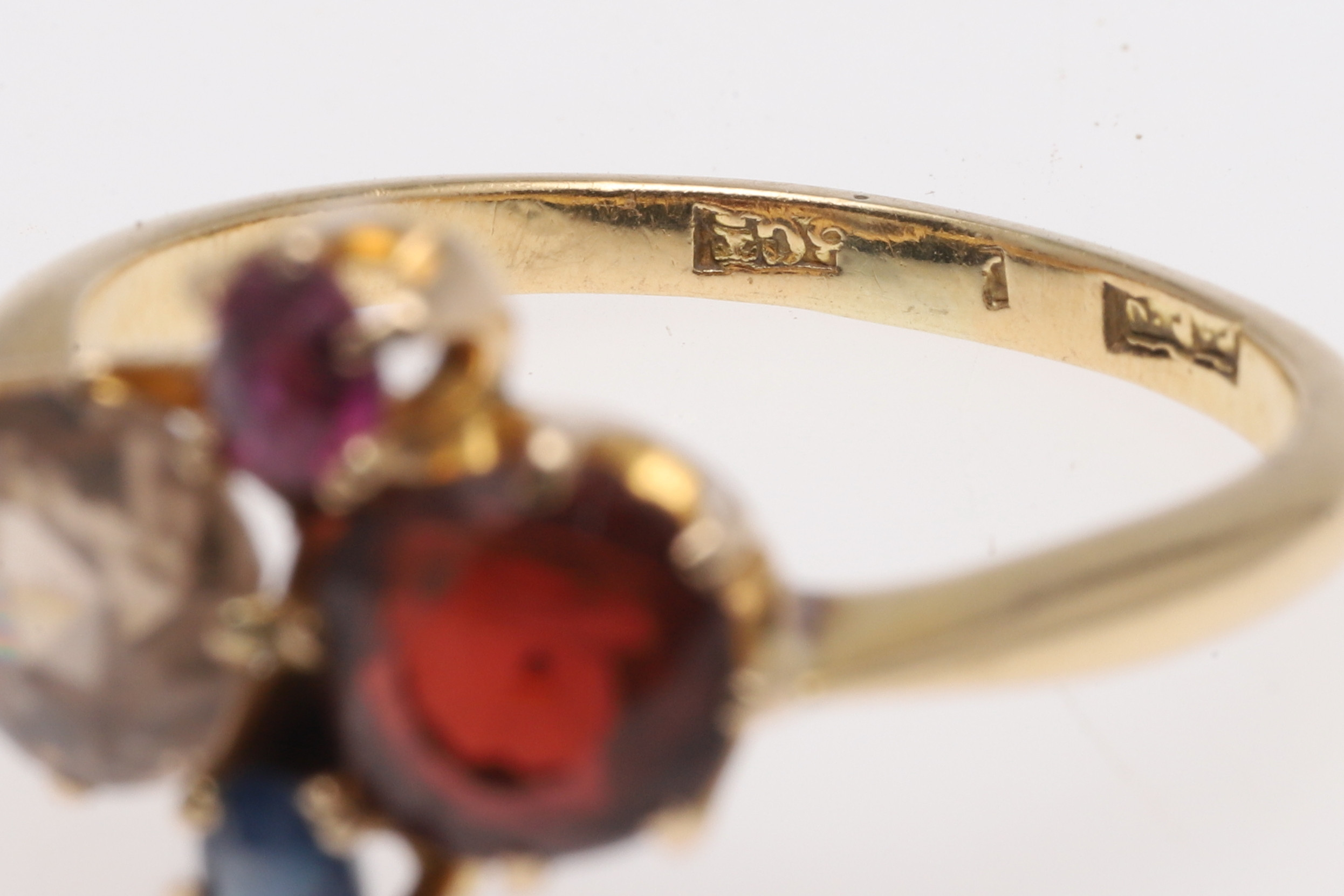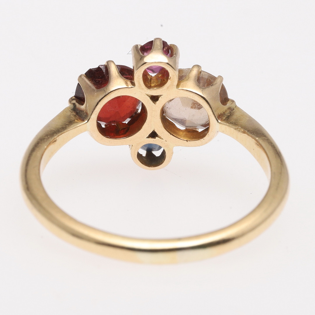 5036294. AN 18CT GOLD AND GEM SET RING.