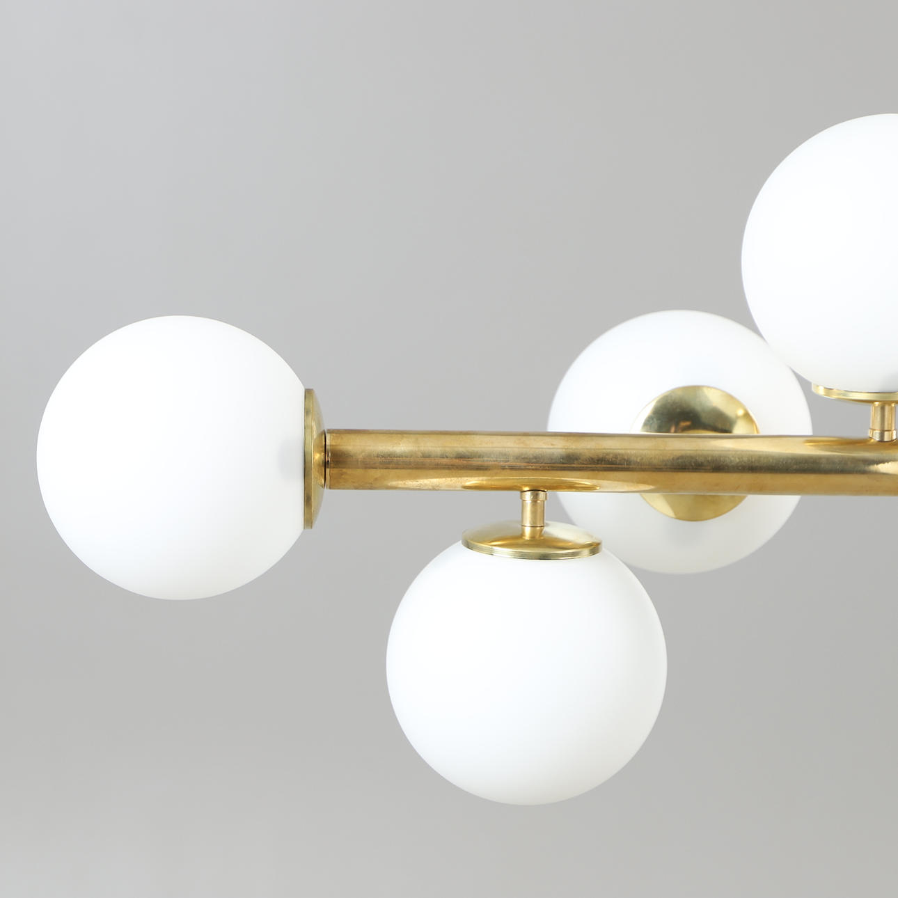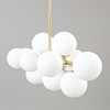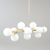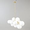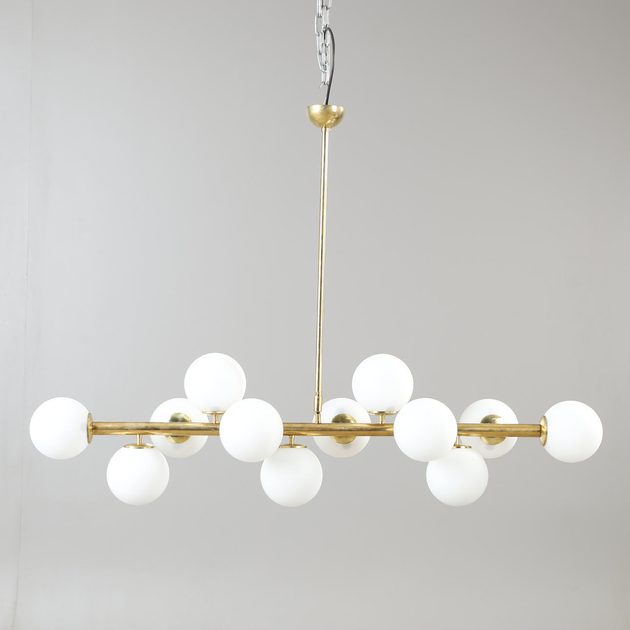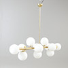 Frame of patinated brass, shades of opaque glass. 12 light sources E14