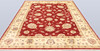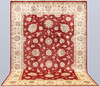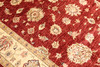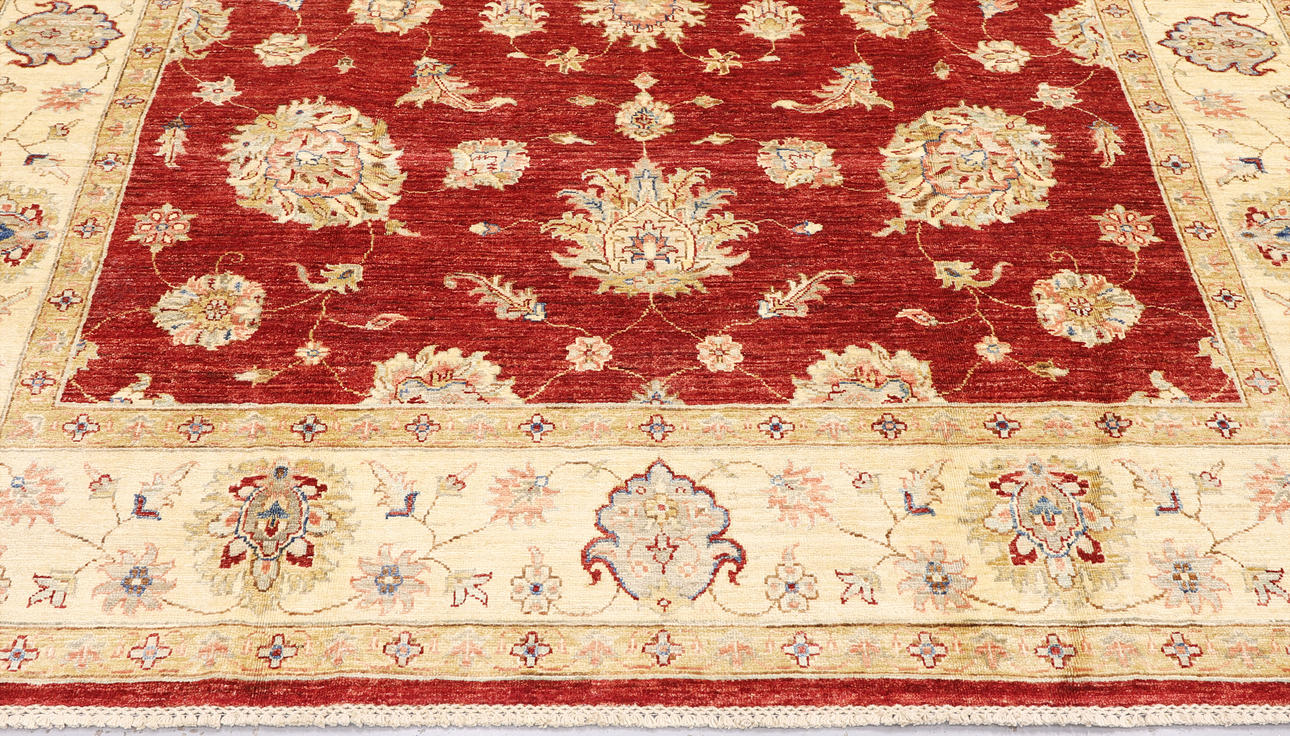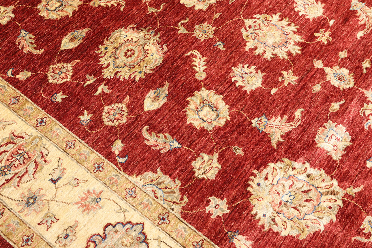 Zigler fine with a red ground and a field covered in large stylized floral and palmette motifs in beige, red, and muted pink details. The border has a light ground with decoration of palmette vines and floral motifs. The pile is wool and the warp is cotton.