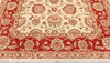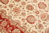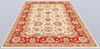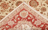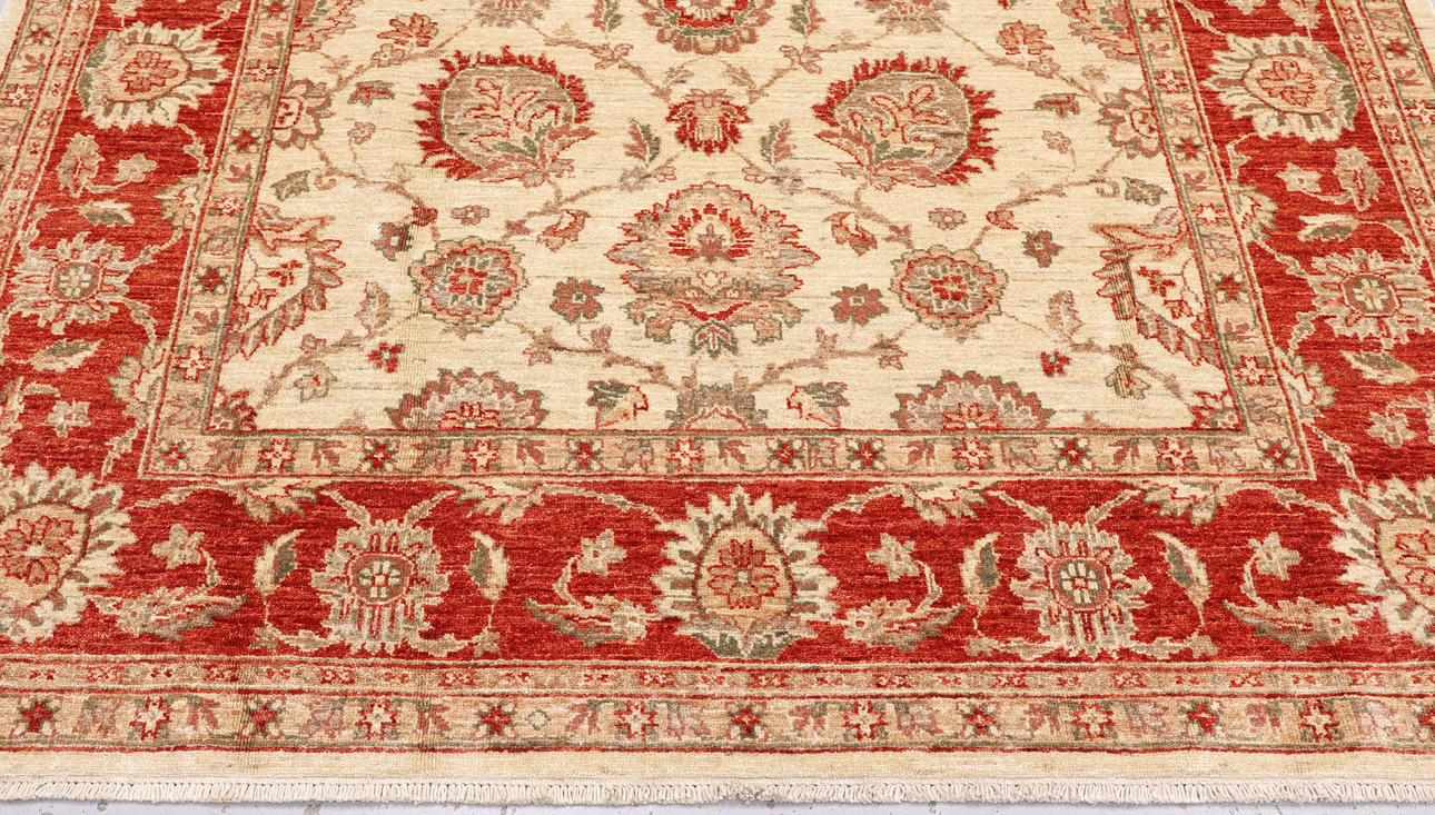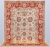 Zigler fine with a light ground and a field covered in large stylized floral and palmette motifs in red, beige, and muted green details. The border has a red ground with decoration of palmette vines and floral motifs. The pile is wool and the warp is cotton.