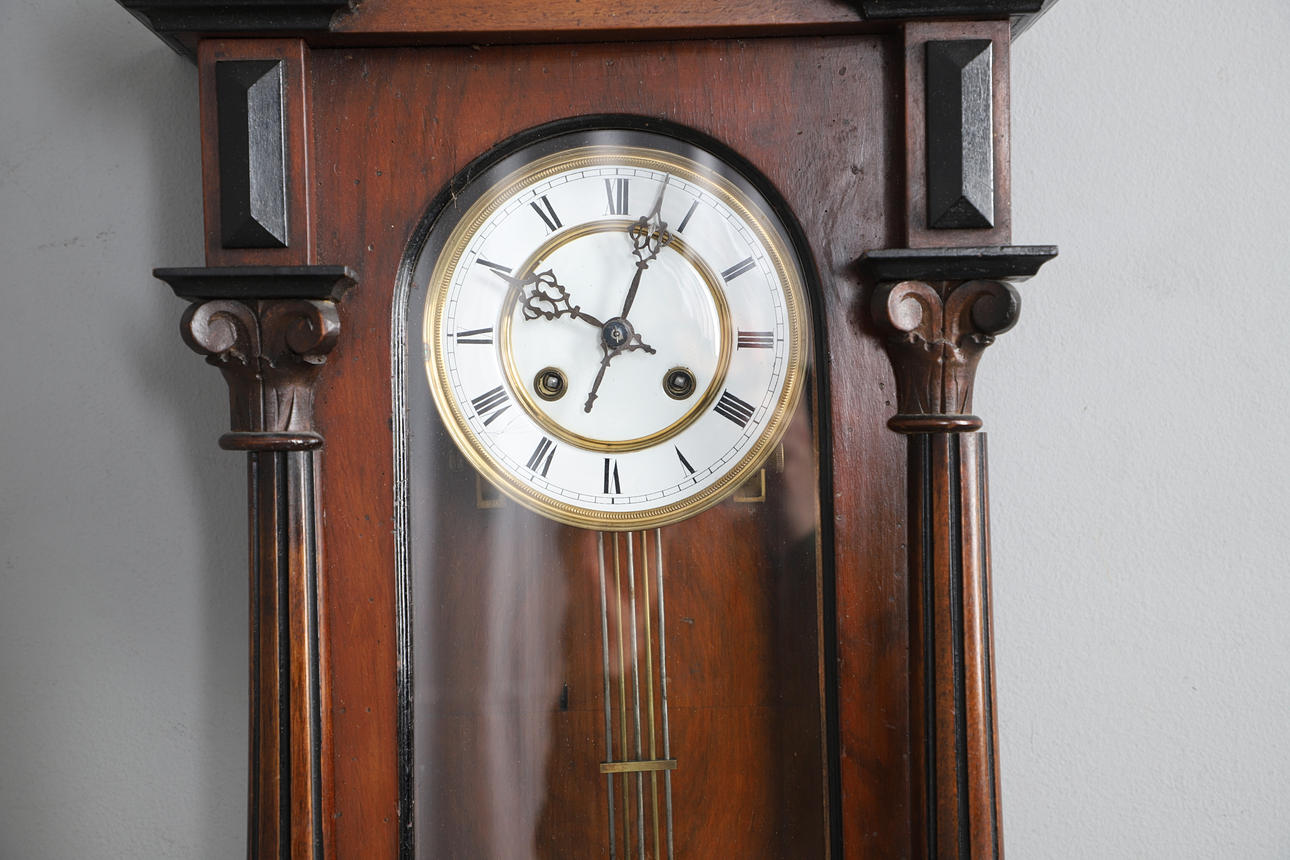 A Vienna style regulator wall clock, decorated with two fluted columns and finials. Dimensions without mounting, 78cm (h) x 35cm (w) x 16cm (d).