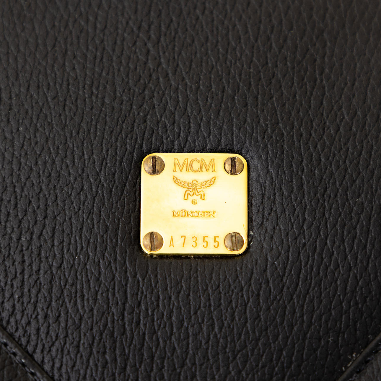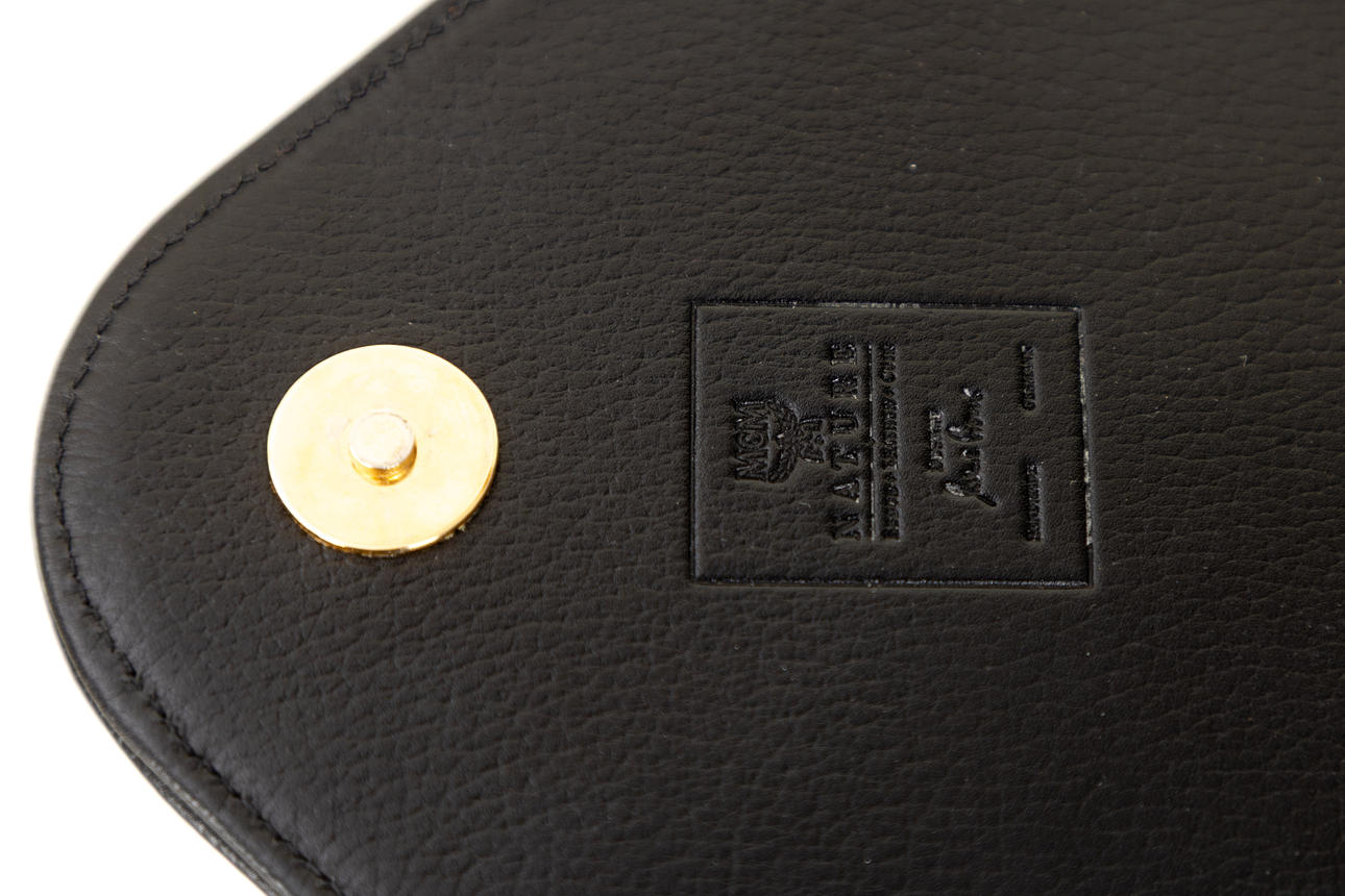 Leather. Brass manufacturer's application with brand name and serial number. Interior with two compartments, one of which has a zipper.