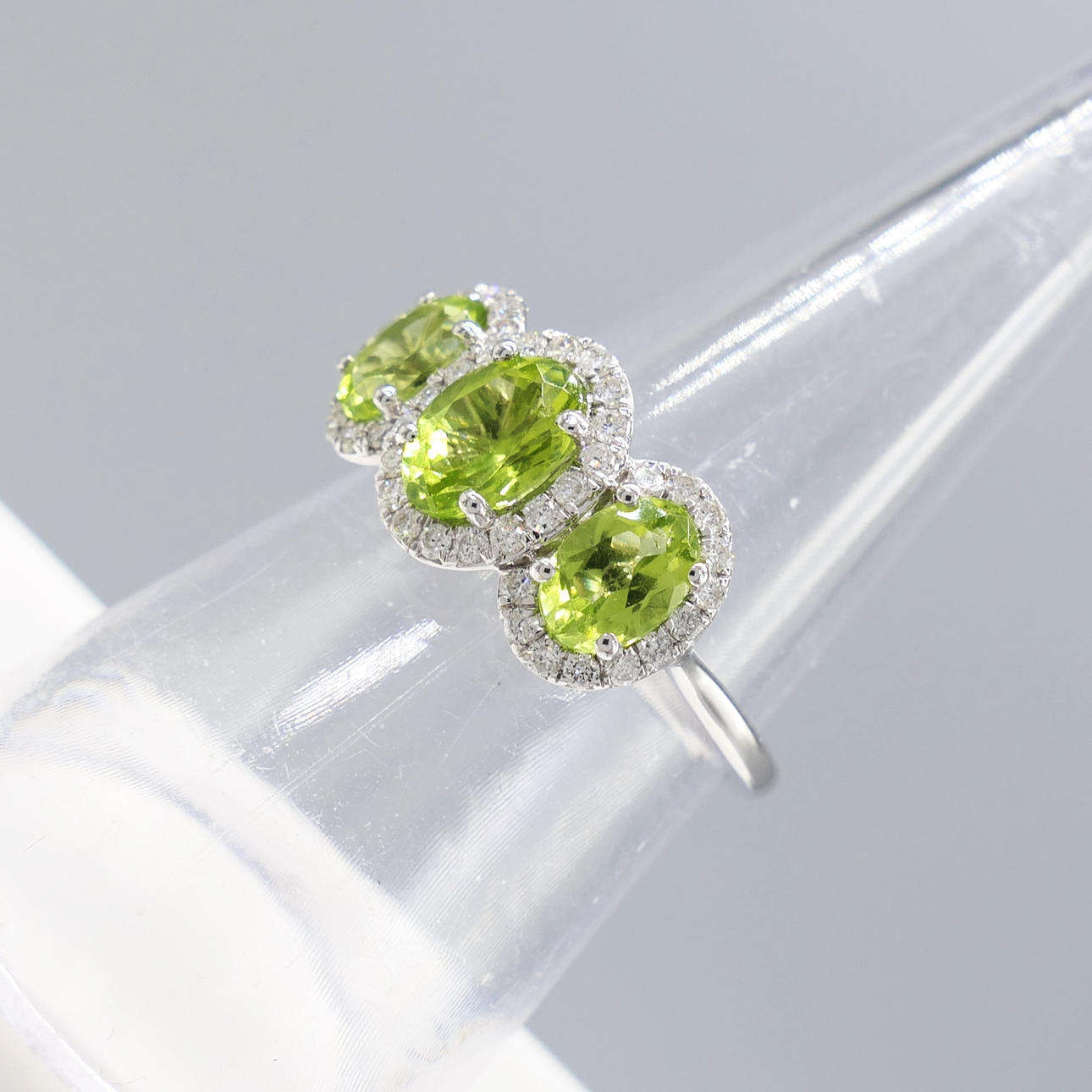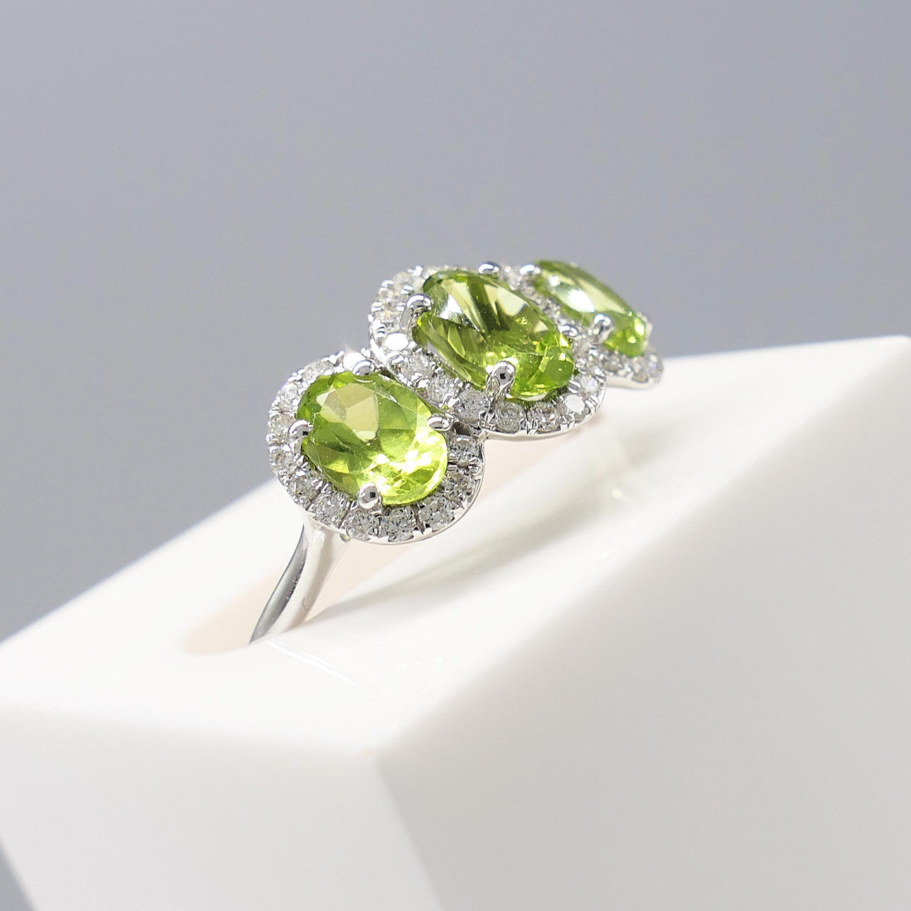A white gold trilogy style ring set with 3 peridots, each surrounded by diamonds