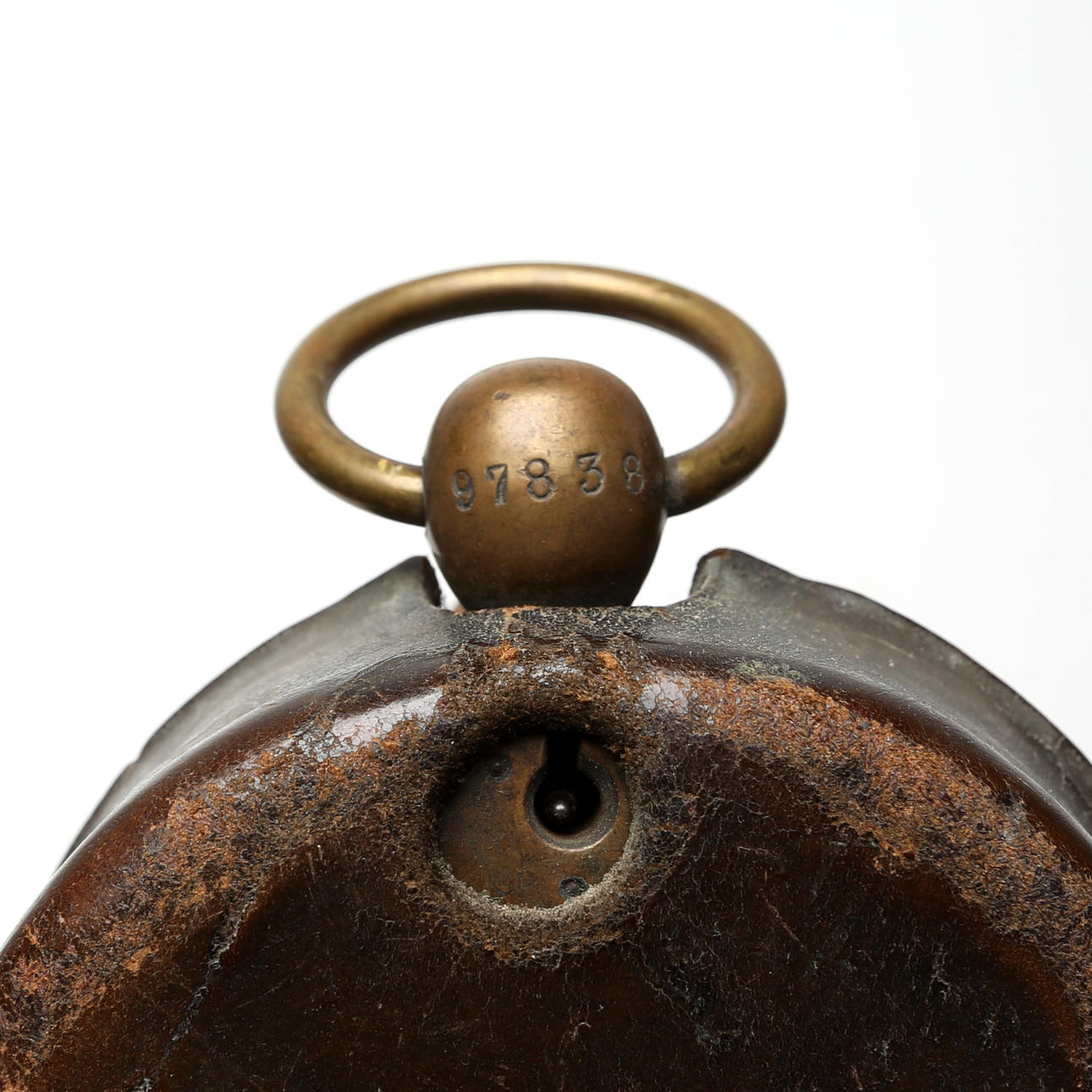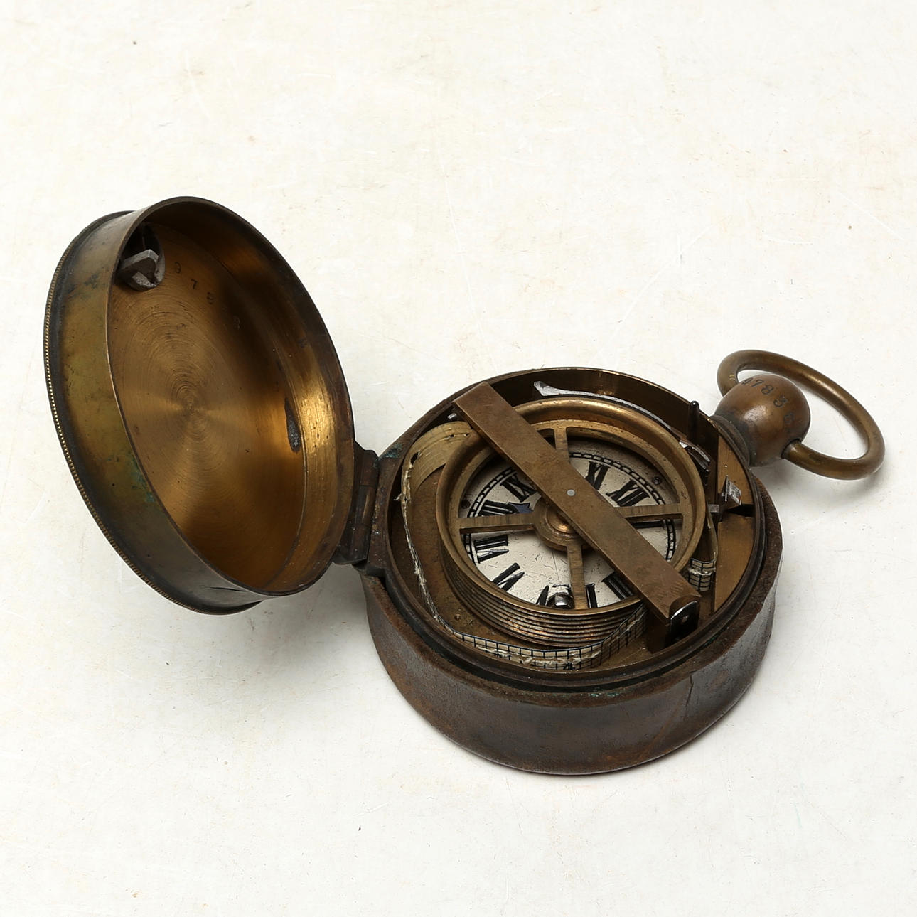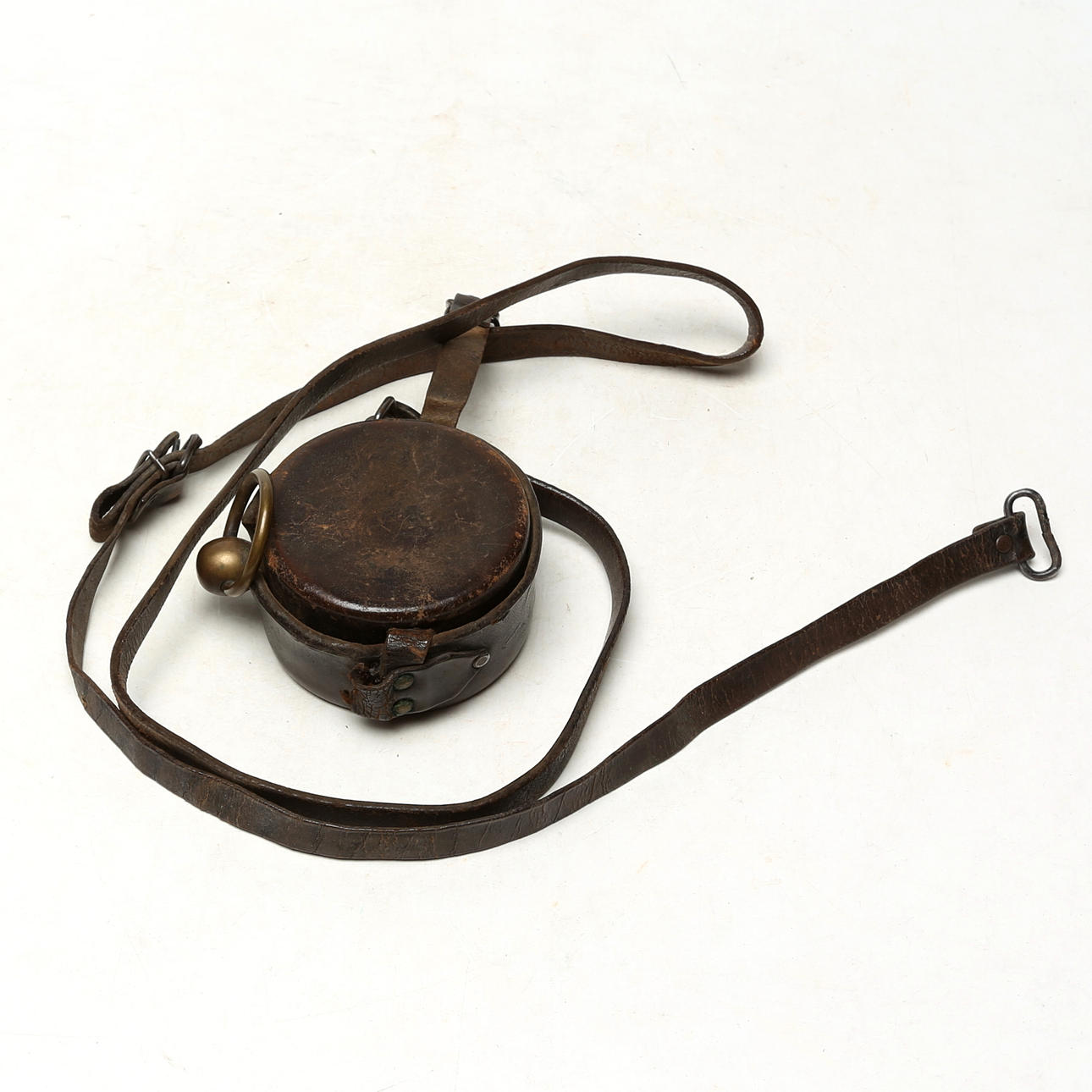 5036864. CLOCK, likely nautical. metal/leather case, 19th century.