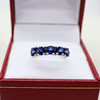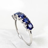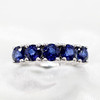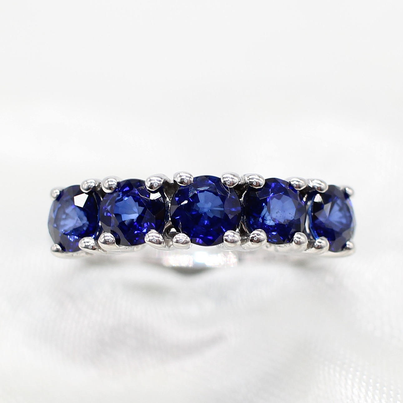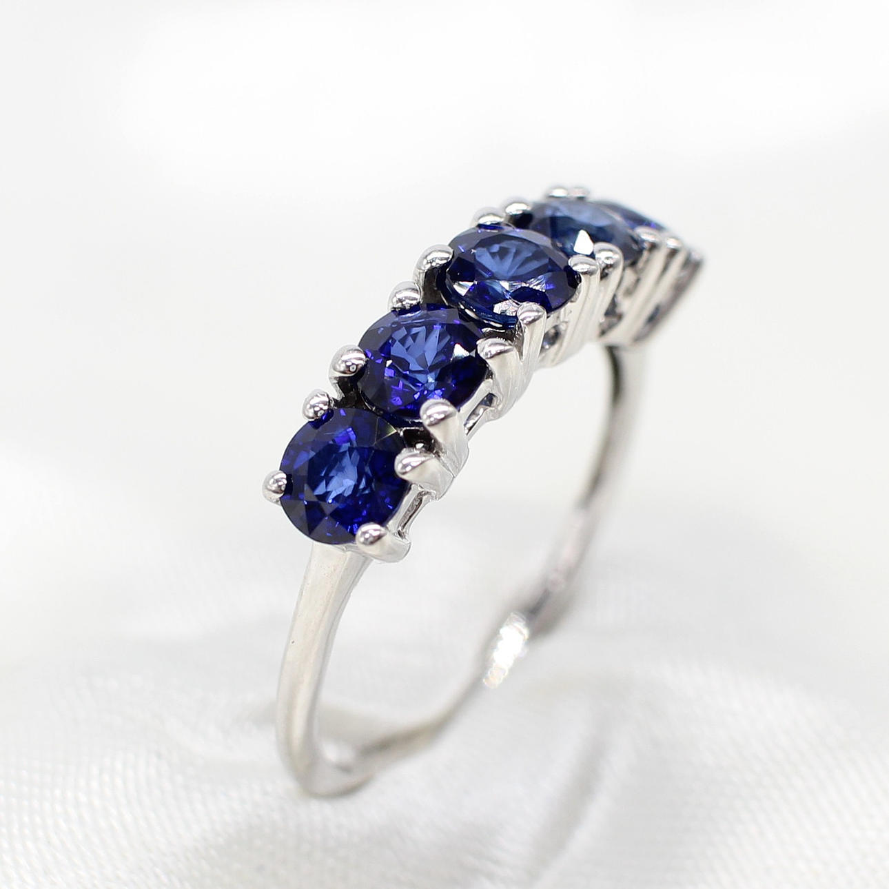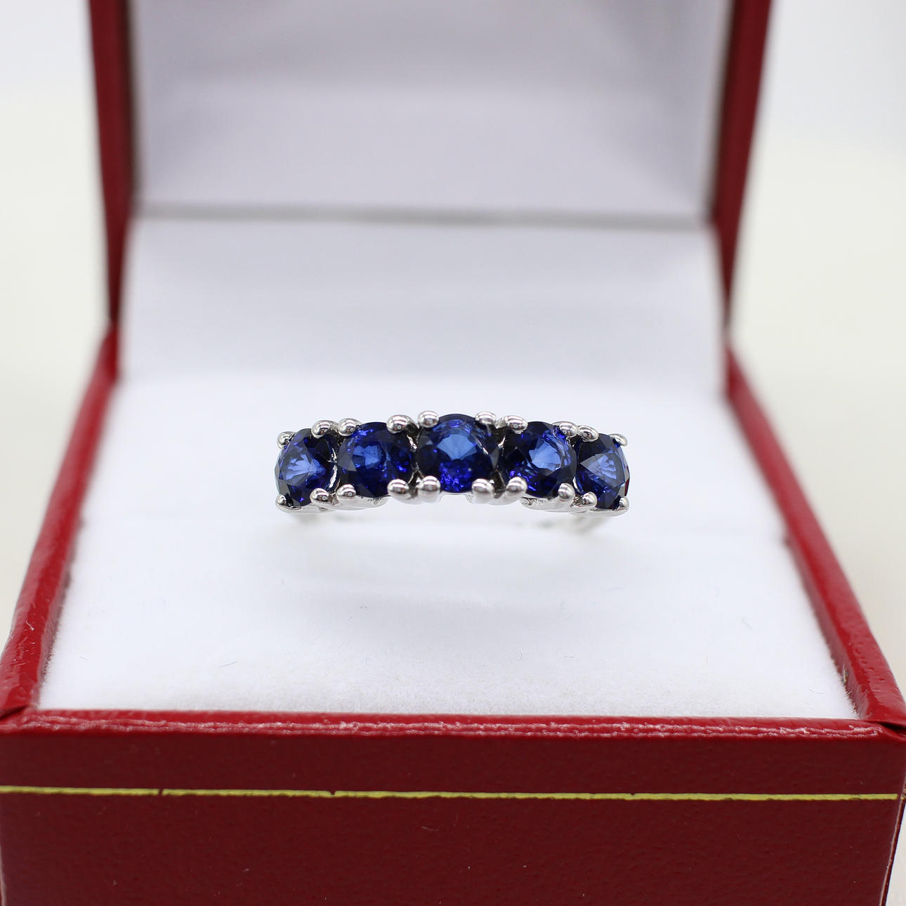 A 10K white gold (hallmarked as 9k) ring set with 5 x round cut sapphires.