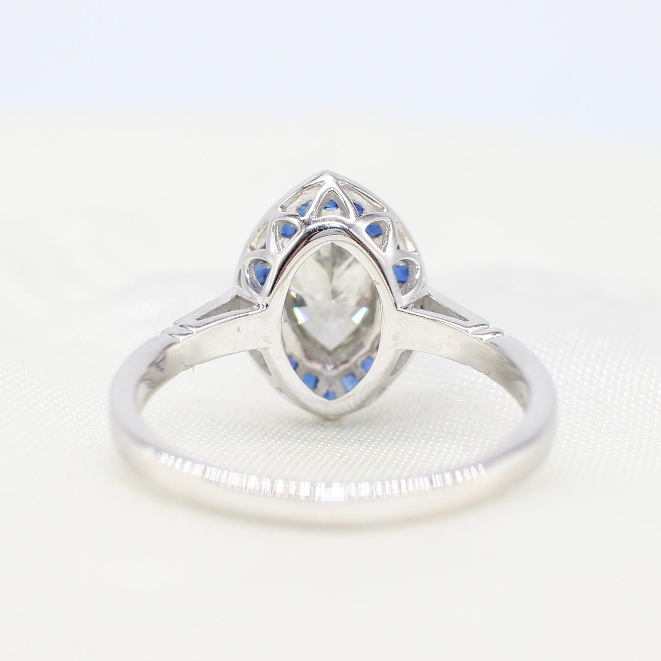 An 18K (stamped, tested as 18K) white gold marquise shape ring set with a central marquise diamond surrounded by calibre cut sapphires and further diamonds to the shoulders.
