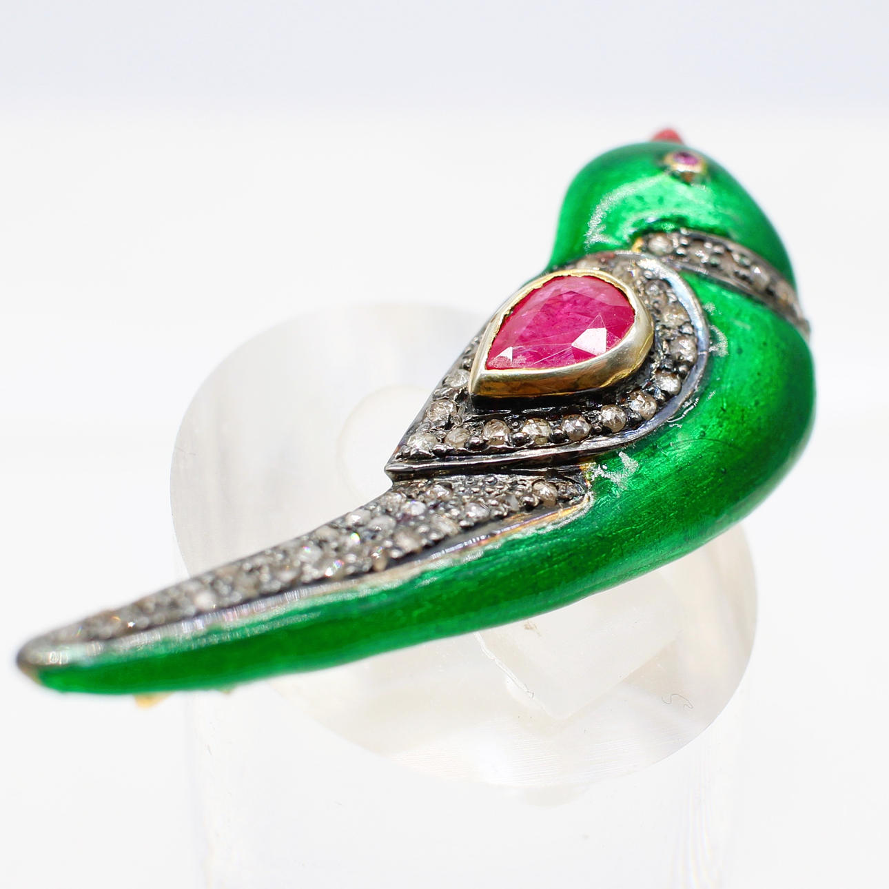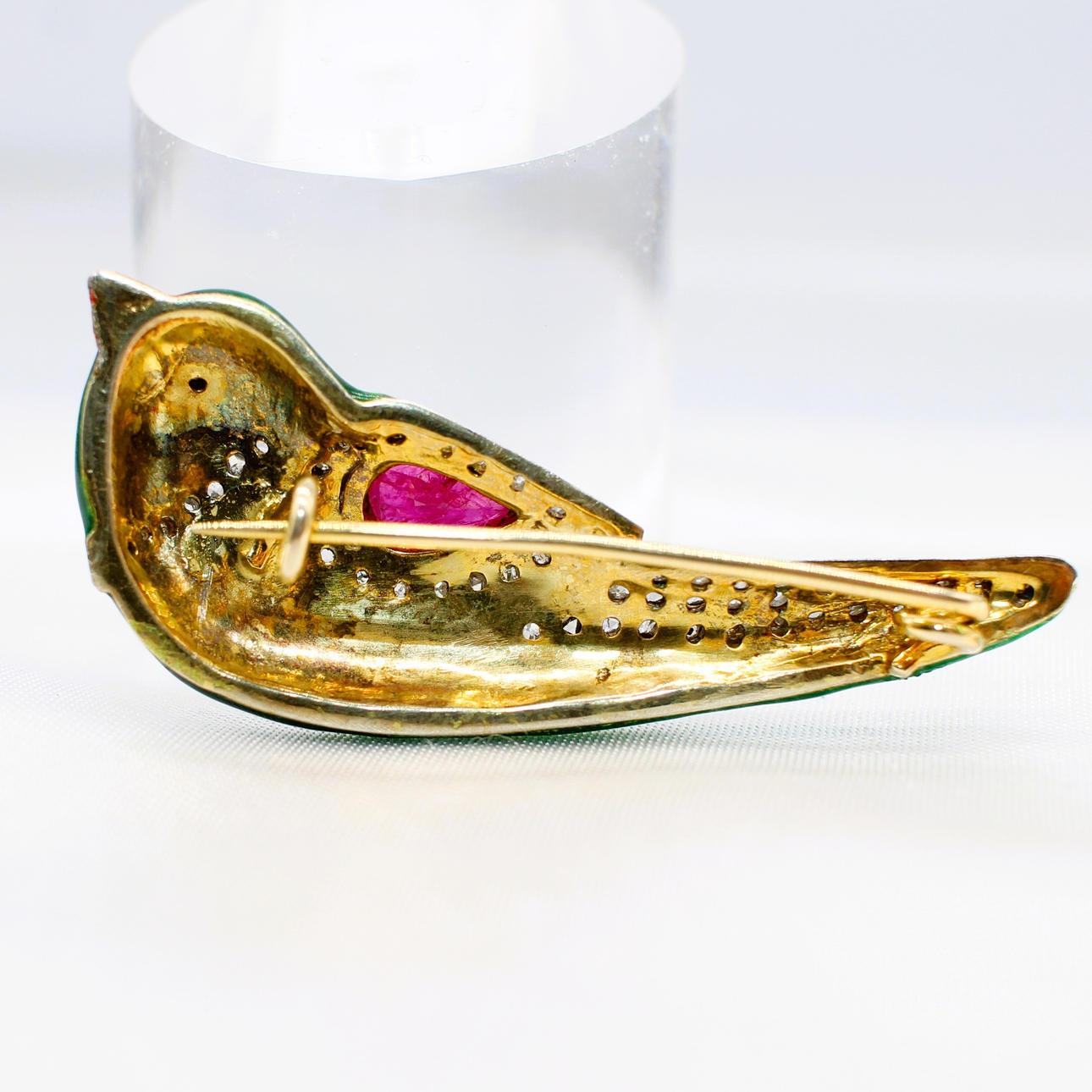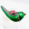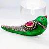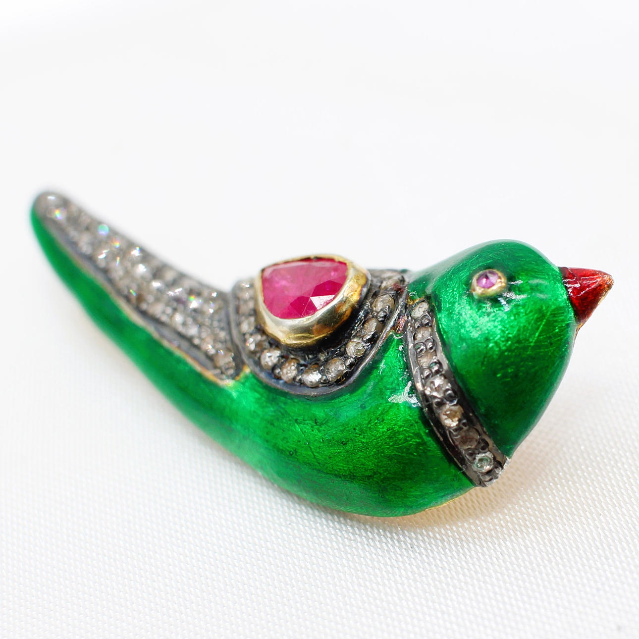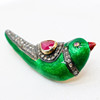 A 14k yellow gold and silver gilt (unhallmarked but tested as) green enamel love bird brooch set with rubies in the wing and as an eye and set into the wing and collar.