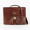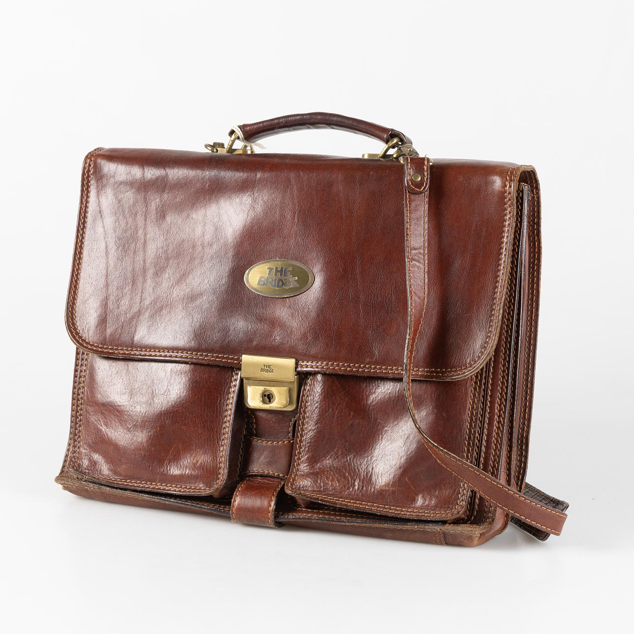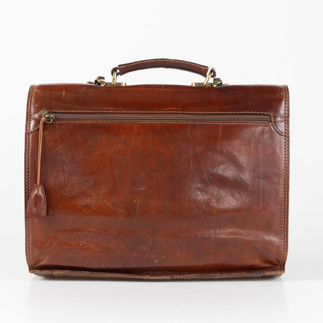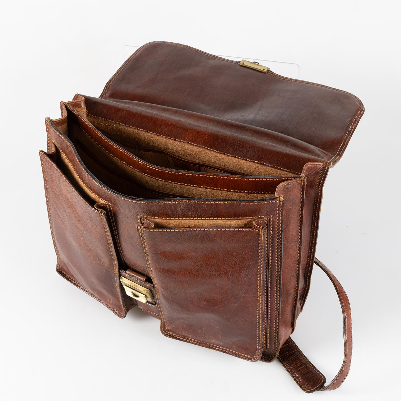 Handle and shoulder strap. Interior with two compartments and two side pockets. Three outer side pockets, one with a zipper. Key included. Dustbag included. Dimensions approx. 40x30x10 cm.