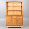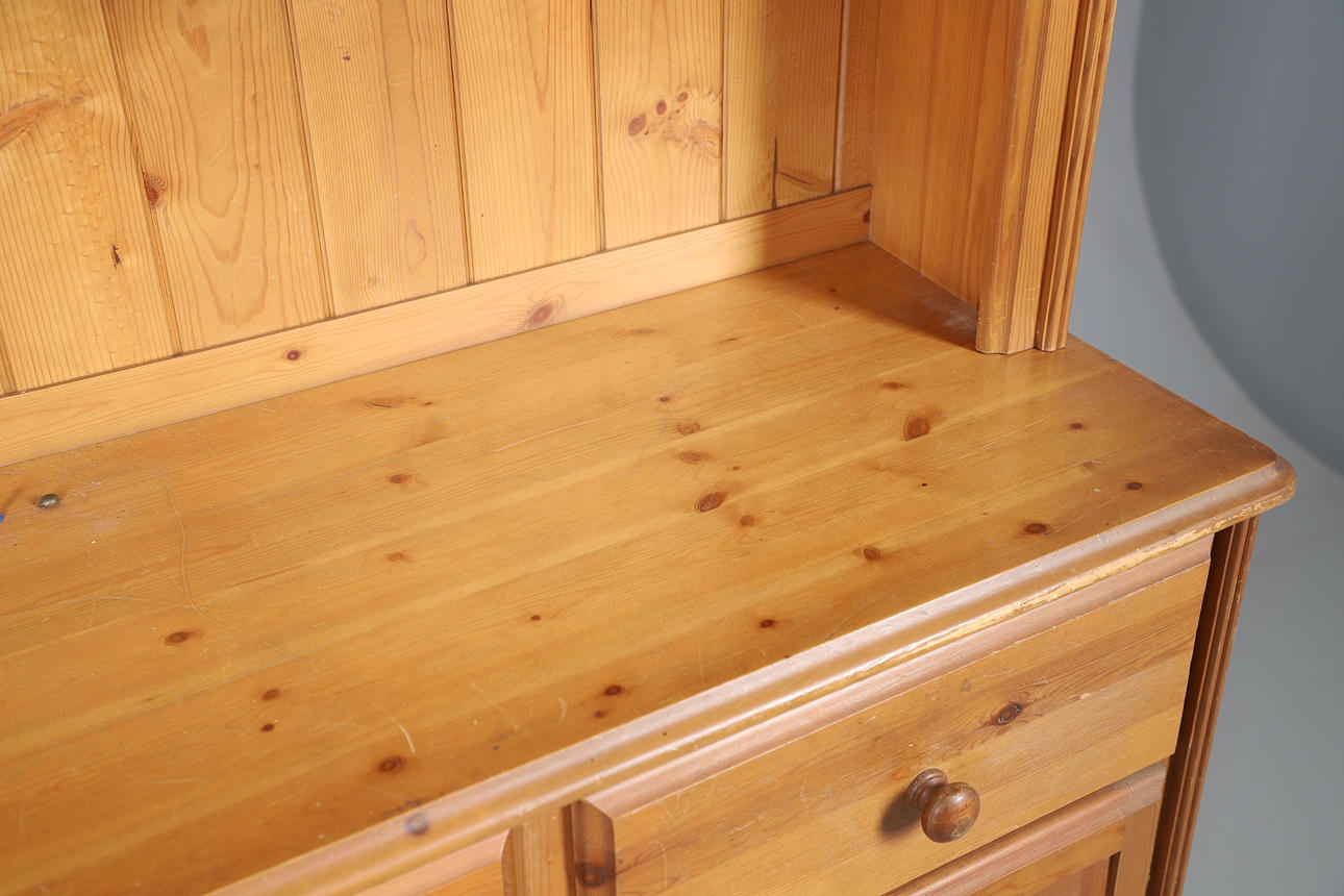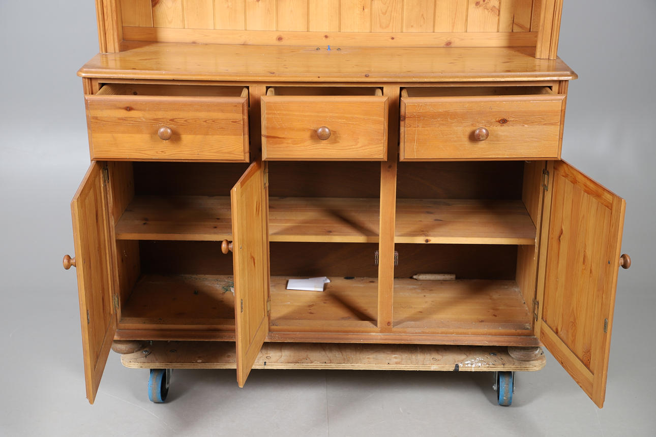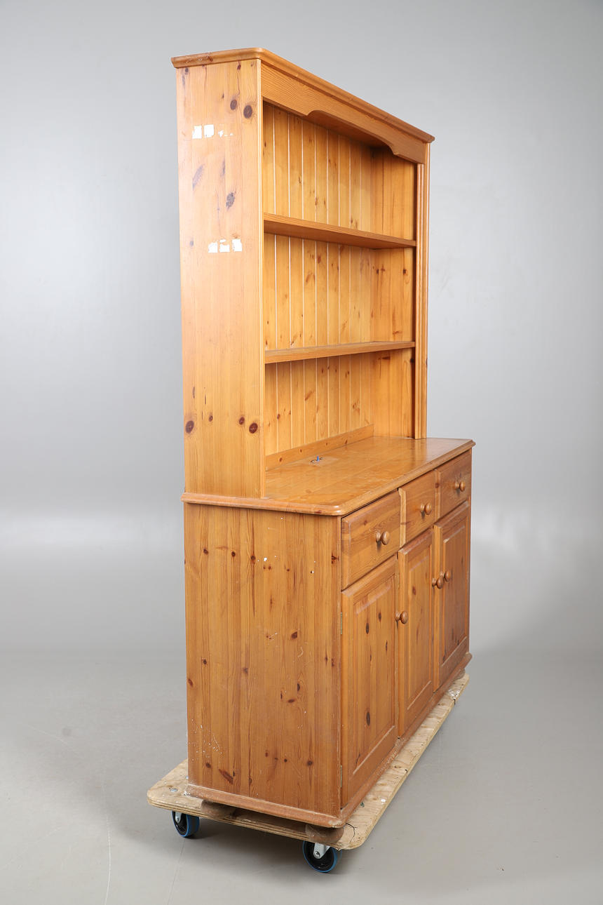 A modern pine dresser, comprising of three drawers and three cupboards which reveal a single shelf, above a shelving unit comprising of two fixed shelves, and raised on bun supports. 180.5cm (h) x 127cm (w) x 41cm (d).