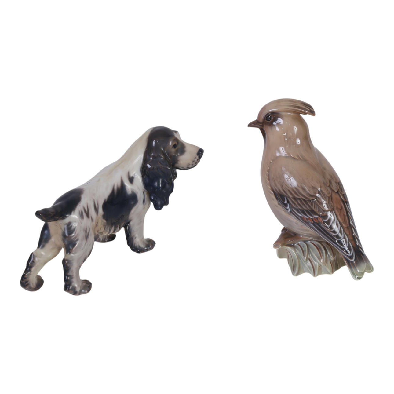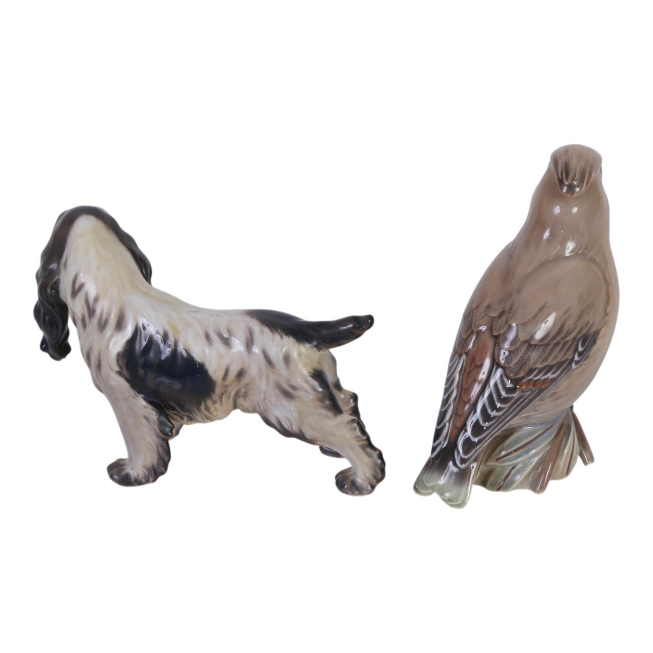 Two porcelain figures. A dog no. 1145, L. 18 cm. And a bird no. 1243, H. 14.5 cm. Both produced by Dahl-Jensen with their maker's mark and both 1st quality.