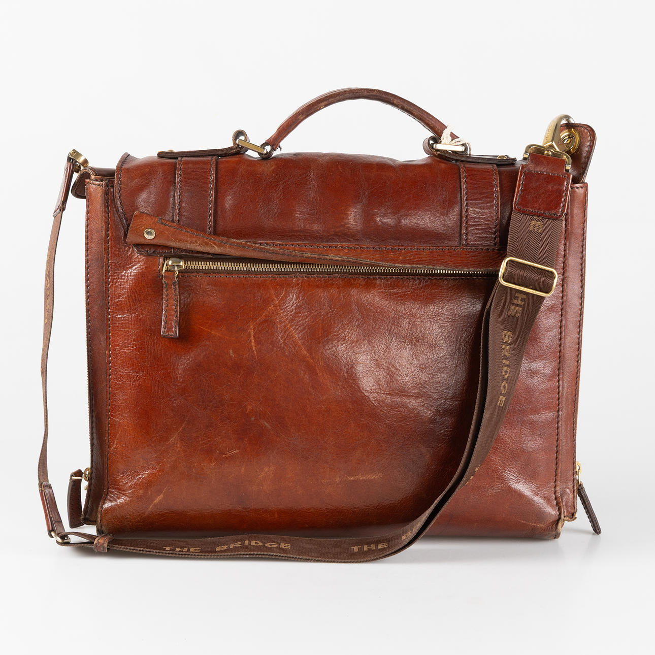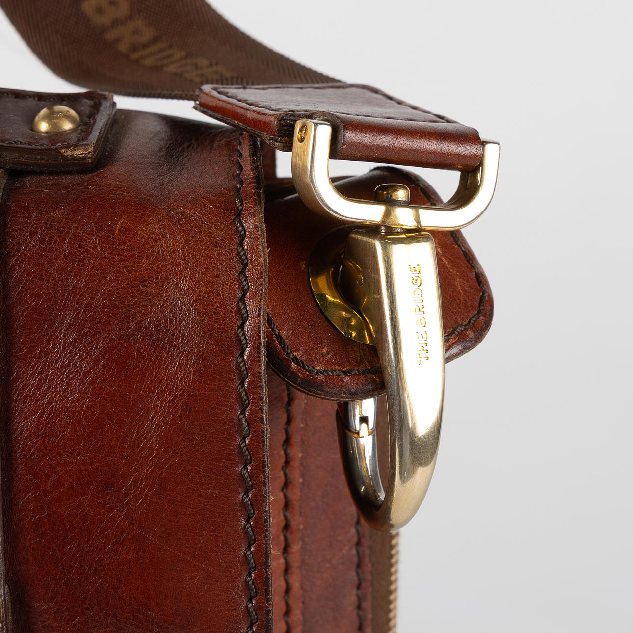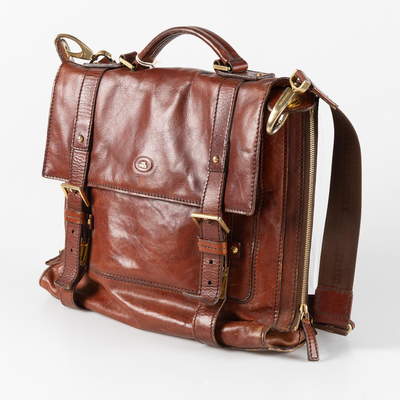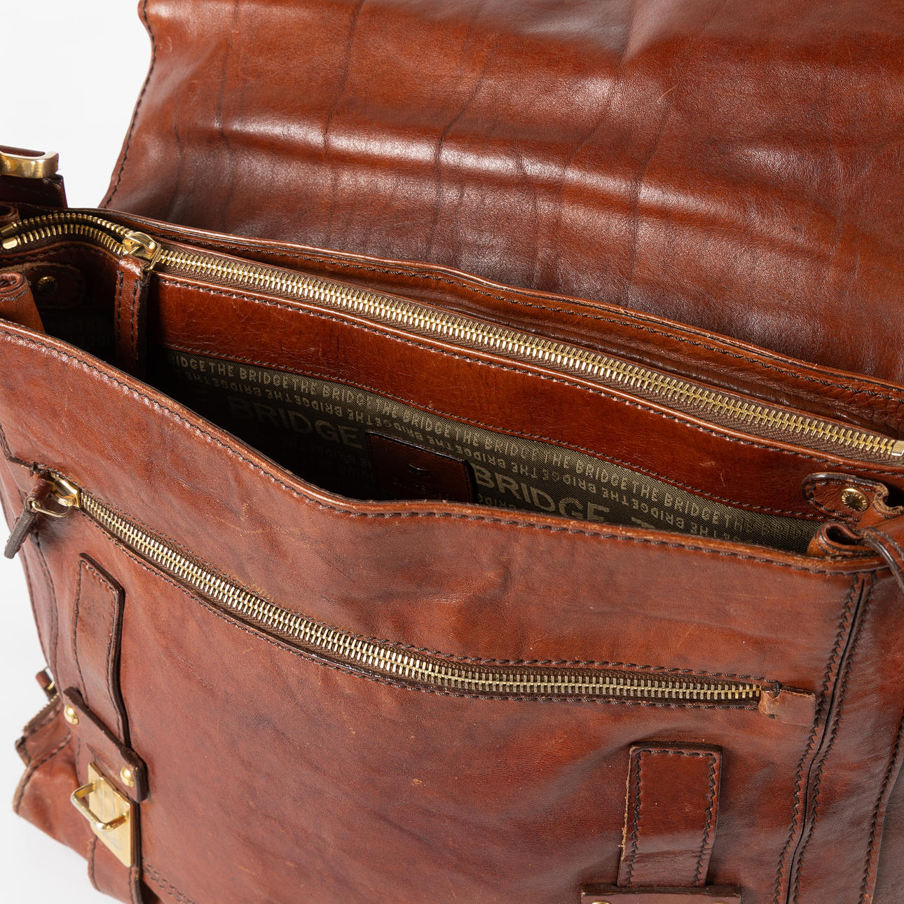 Shoulder strap. Interior with three compartments, one with a zipper, and three side pockets. Exterior with two zippered side pockets. Dustbag included. Dimensions approx. 39x35x5.5 (expandable width 10 cm).