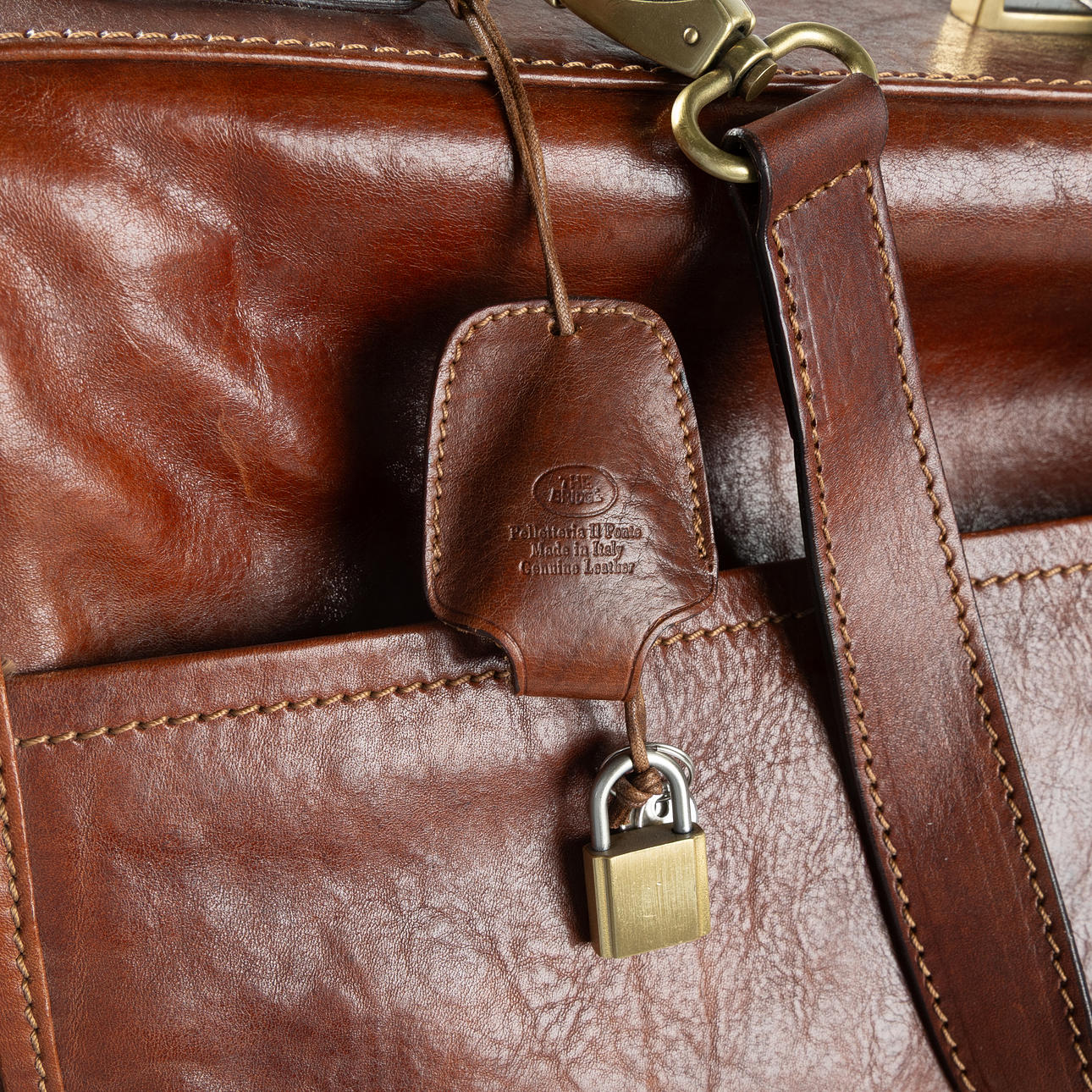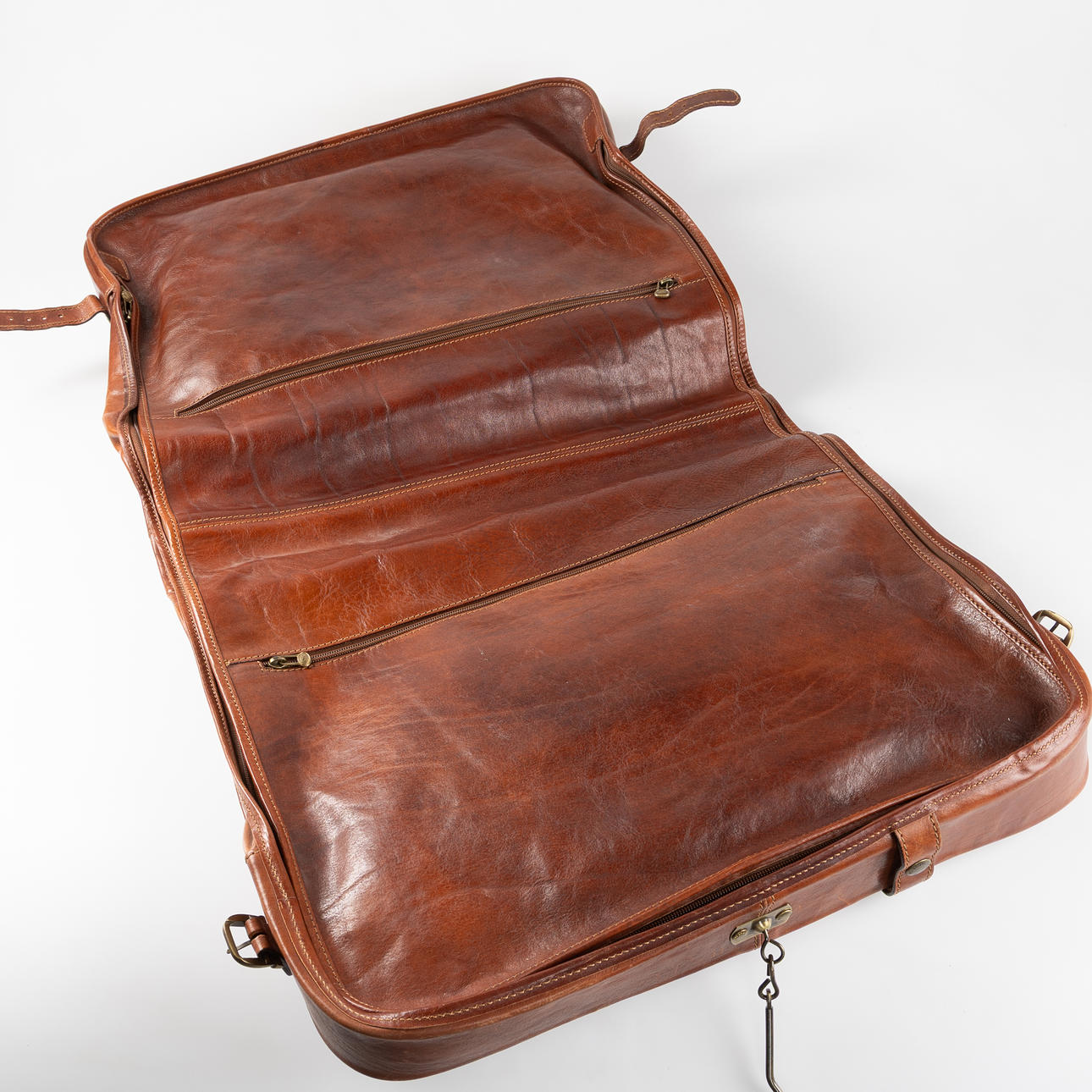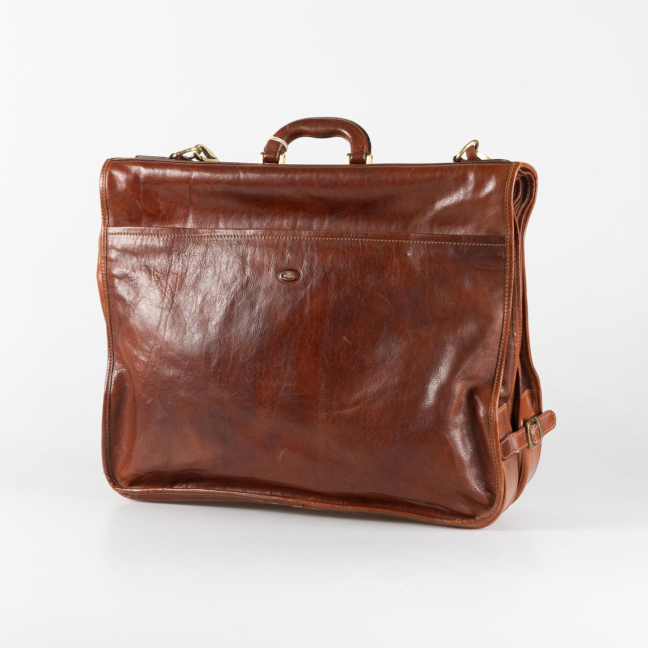 Handle and shoulder strap. Interior with five hangers. Three zippered side compartments. Name tag. Lock and key. Dustbag included. Dimensions folded approx. 53x45x15 cm.