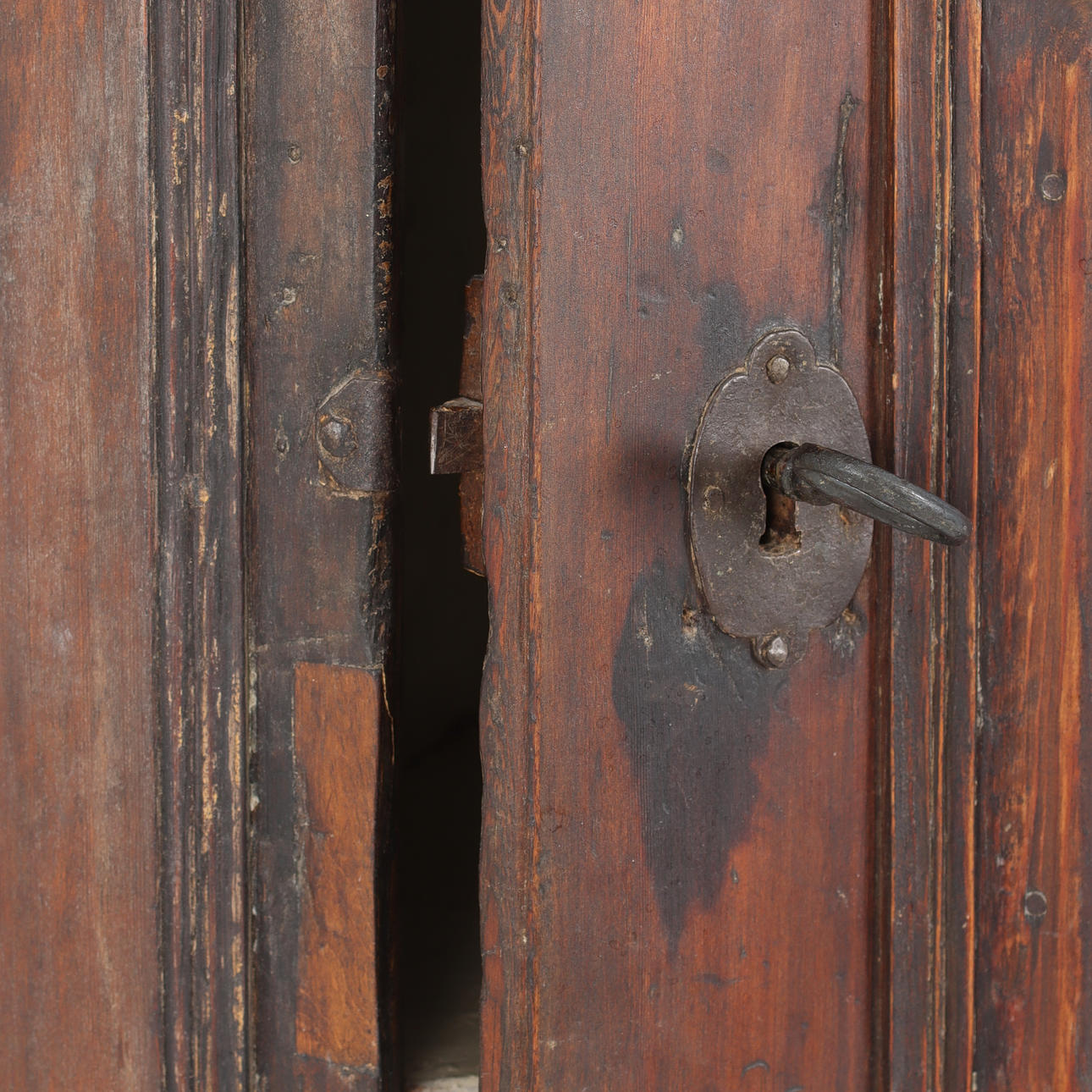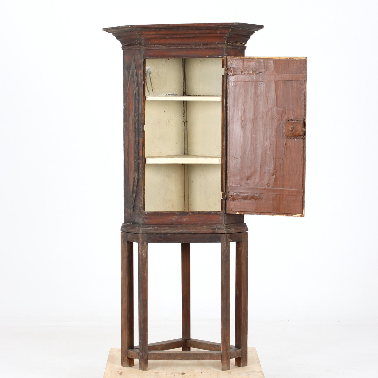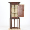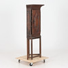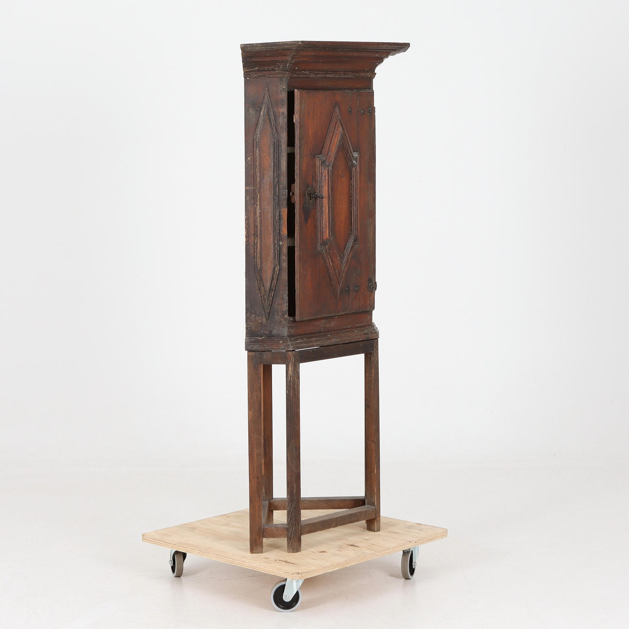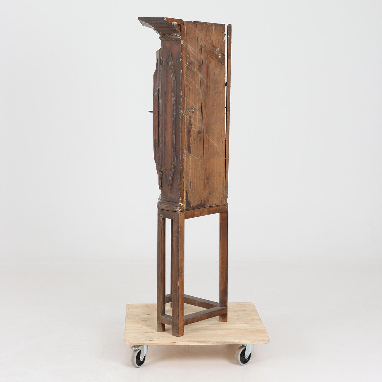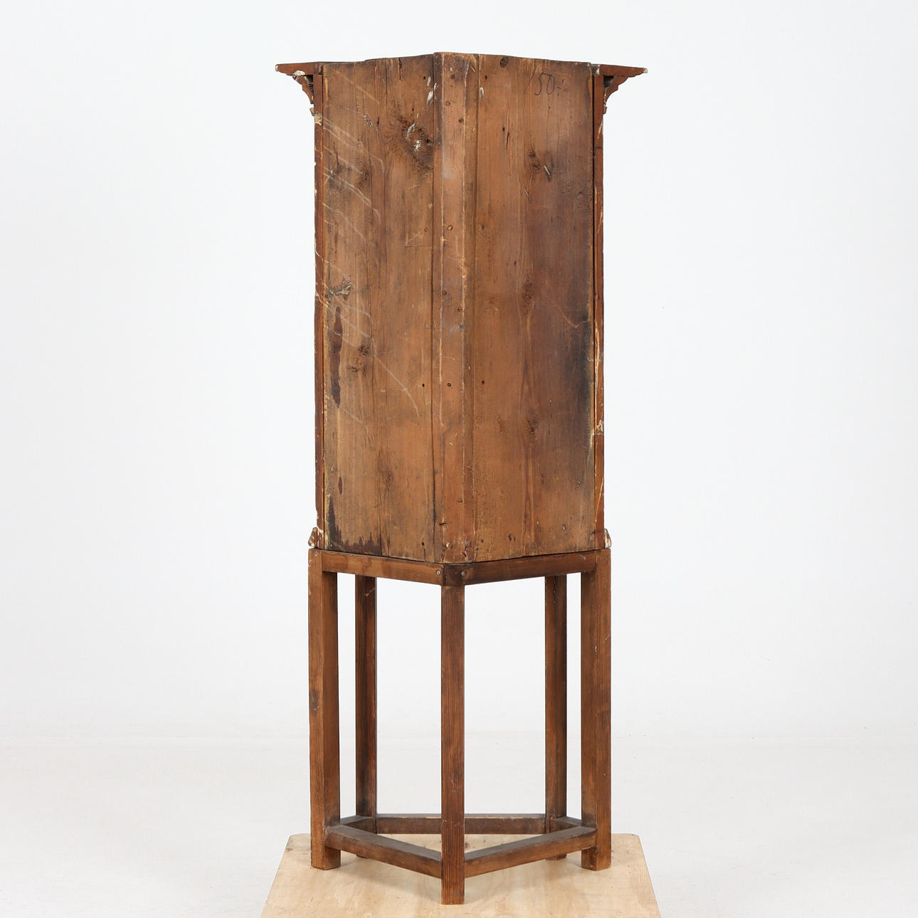 On a base. Cabinet decorated with diamonds with shelves behind. Length 76, side depth 52, height with base 163 cm.