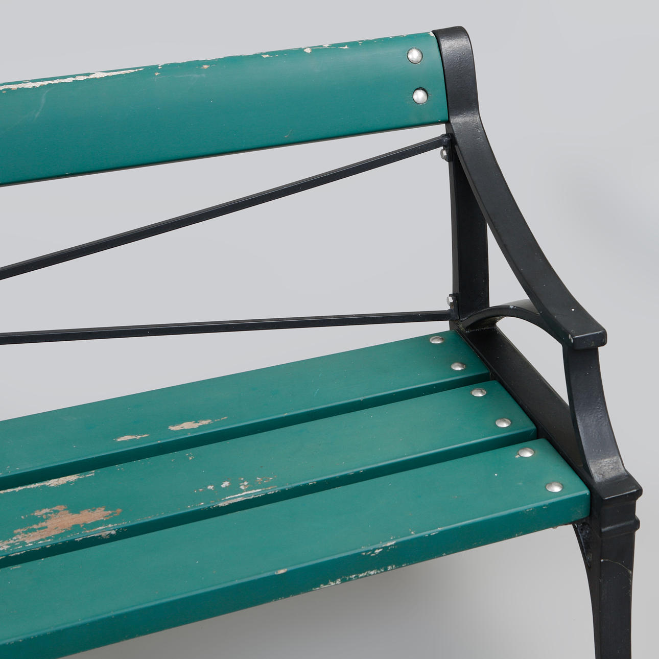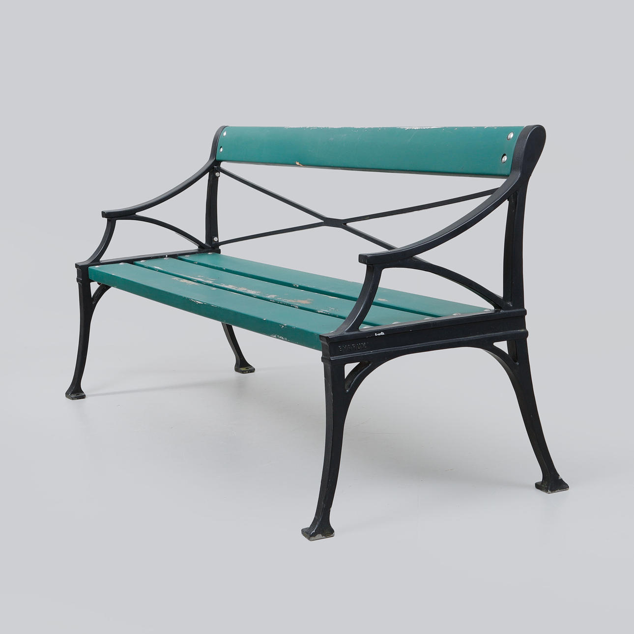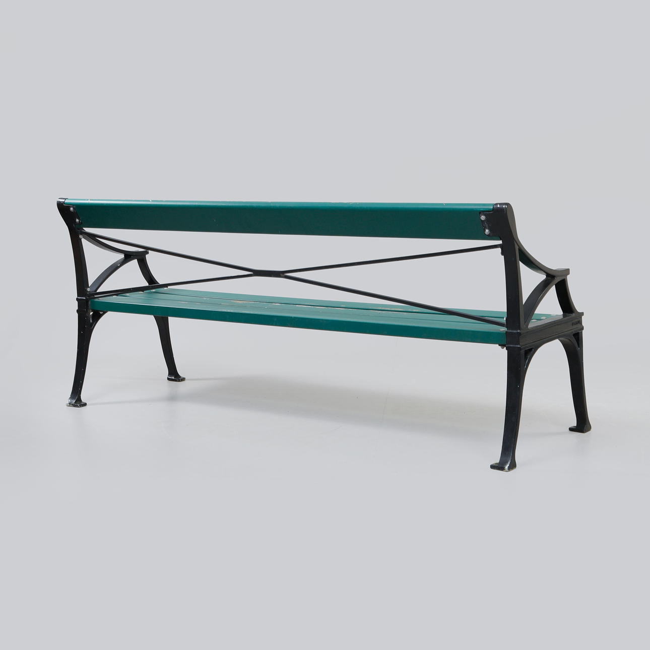 Frame in black-lacquered aluminium with seat and back in green-lacquered wood. Marked in the casting. Length approx. 200 cm, seat height 42 cm, back height approx. 84 cm.