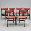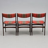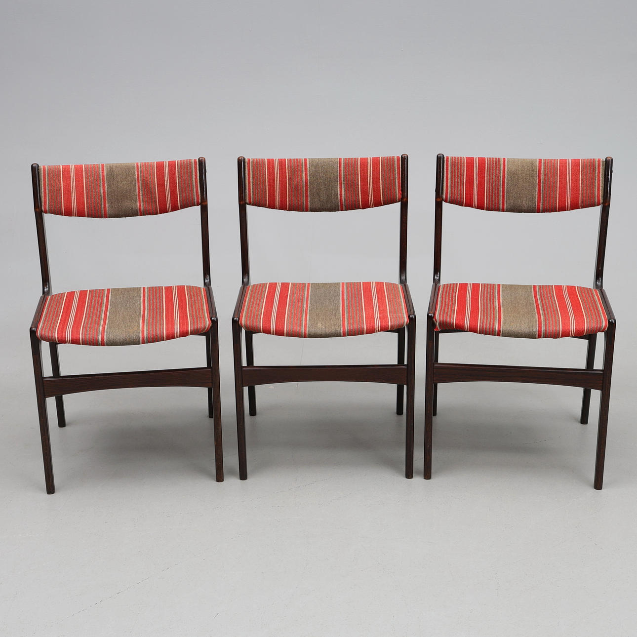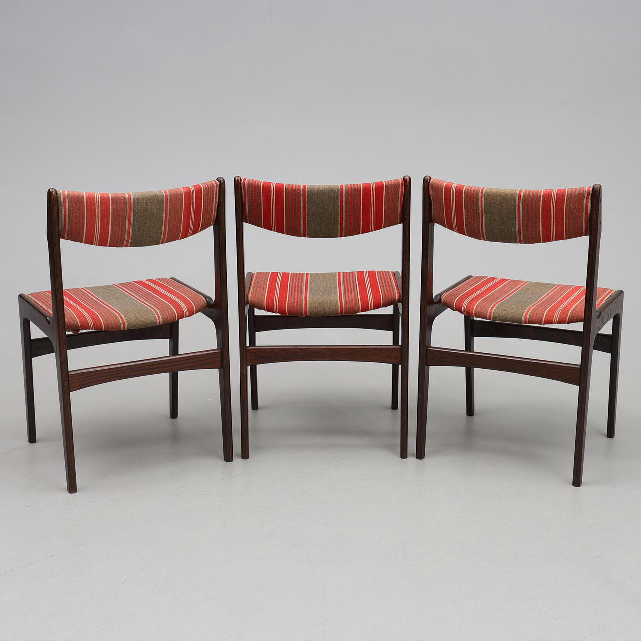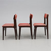 Dark stained wood, upholstered back and seat. Approx. 48 x 50 cm, height approx. 80 cm, seat height approx. 45 cm.