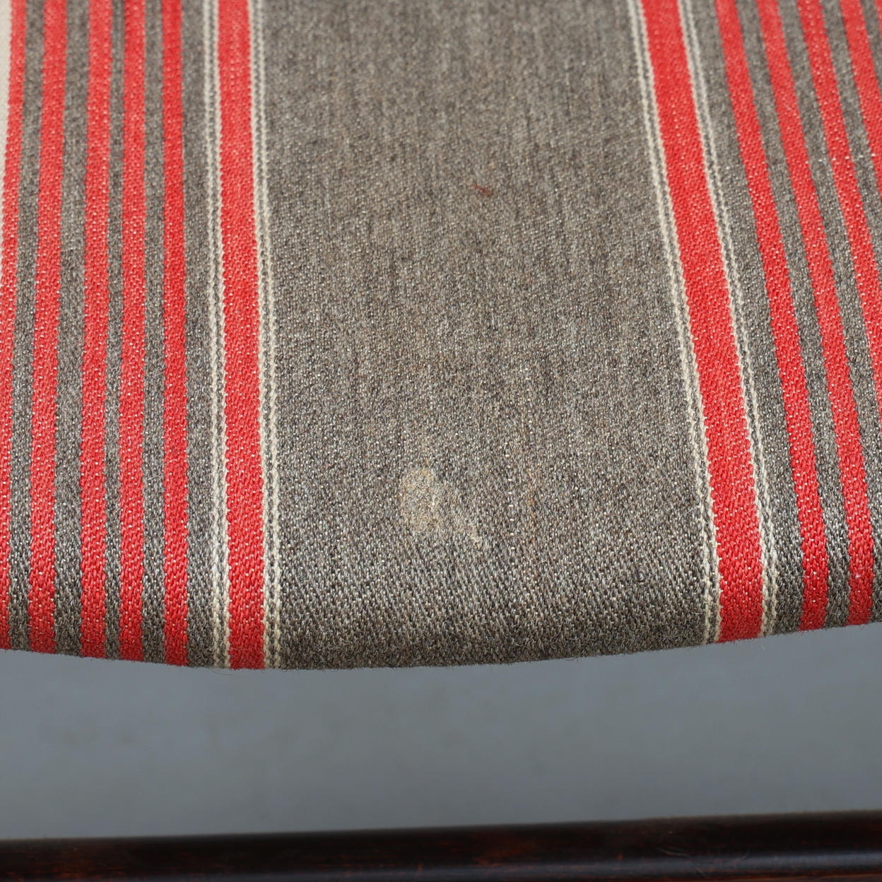 Wear from use, fabric detached on 1 chair, stains.