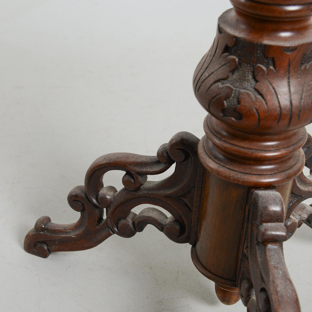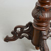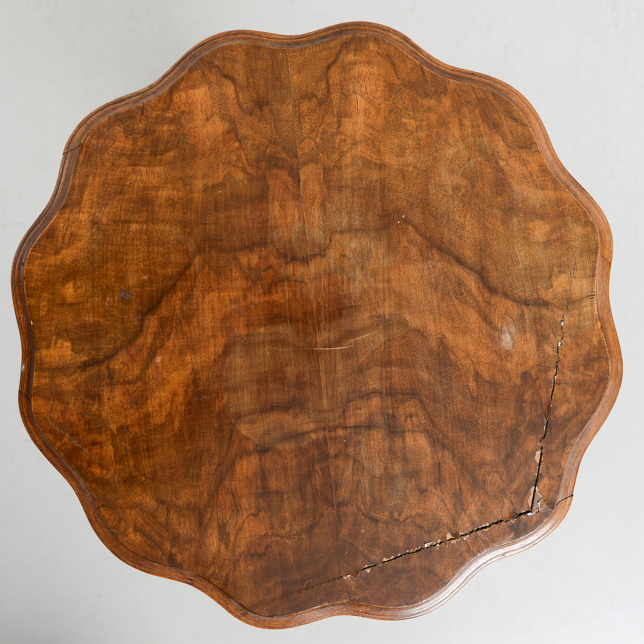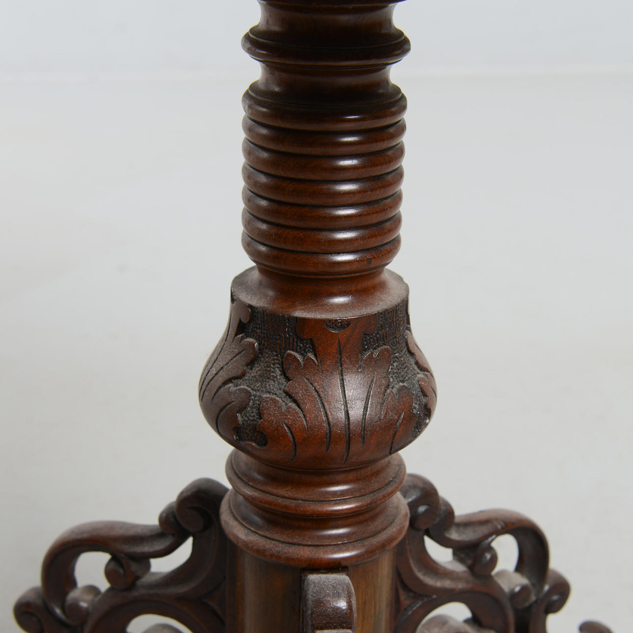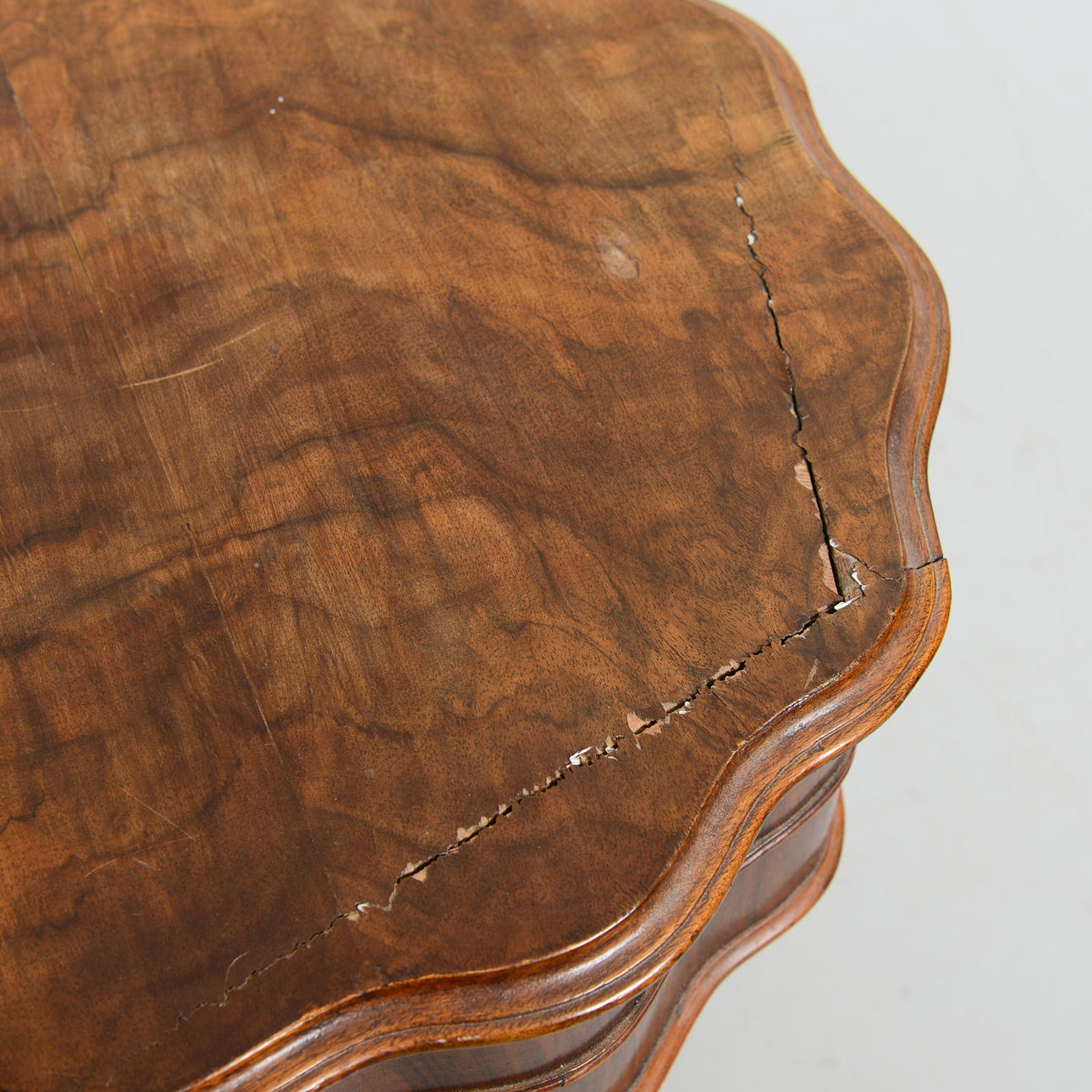 Hinged top with interior compartments and drawers. One drawer in the apron. Diameter 51.5 cm. Height 75 cm.