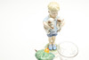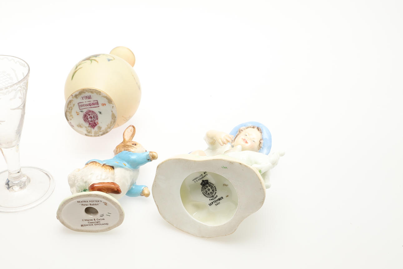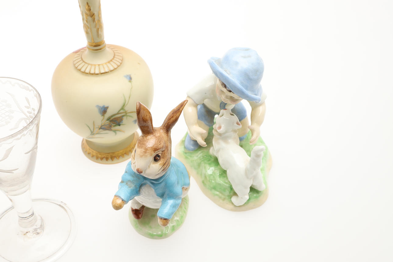 A small mixed lot including two Royal Worcester figures, 'Monday's Child' (model 3519, 19cms high) and September (model 3457), a blush ivory Royal Worcester vase (16.5cms high), and two Beswick Beatrix Potter figures. Also with two small hand blown glasses with etched decoration. (7).
